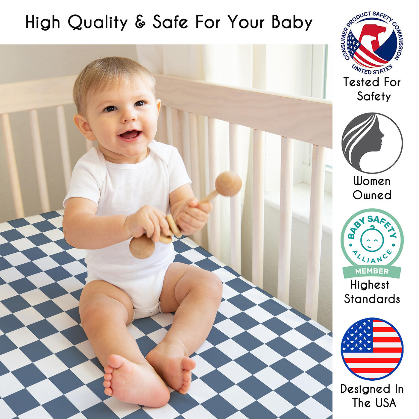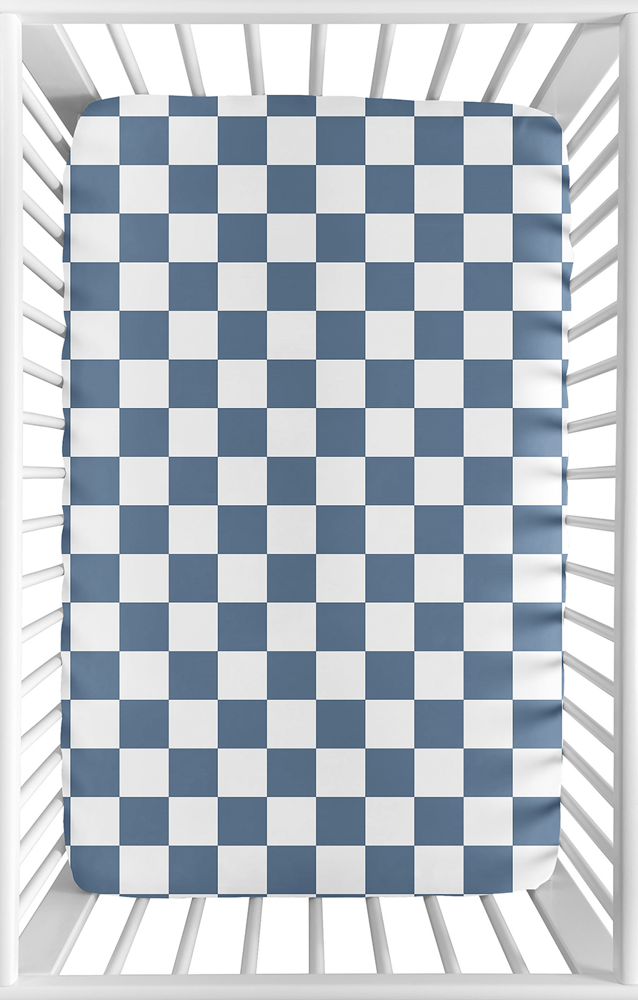 SNUG FIT: Includes (1) Mini Crib Mattress Sheet 52in. x 28in. x 8in. Our newborn mini crib sheets fit snugly, with premium elastic sewn around the entire bottom edge for a secure fit on most smaller size cribs, play yards, and portable cribs to reduce shifting and bunching. This classic brushed microfiber pack and play sheet features an exclusive design of white and steel, slate blue geometric, minimalist, retro gingham plaid print & is gentle on delicate skin. WILL NOT FIT STANDARD SIZE CRIBS.DESIGNED IN THE USA: By real parents who understand the need for comfort, practicality, and style. Sweet Jojo Designs is a small, women owned business. The mom's on our team know pack and play sheets are first priority for your baby essentials to ensure a restful night of sleep. We use top fabrics and designs to create soft mini crib sheets fitted that are stretchy and comfortable for your infant. We've studied the latest trends in gingham mini crib sheets boy to bring you the finest product.SAFE & DURABLE: Sweet Jojo Designs is a proud Baby Safety Alliance member & rigorously tests products to meet or exceed CPSC safety standards. Our breathable pack n play sheets fitted are designed with busy parents in mind. Quick to change, machine washable & tumble dry low. The high quality stitching & fabric ensure long-lasting use & will hold up wash after wash. Use one mini crib fitted sheet in your newborns bed & have spares to swap in between washes & to be prepared if an accident happens.PERFECT GIFT: Add 38x24 mini crib sheets to your list of must haves! Including pack and play mattress sheets on your gift registry, in a baby shower gift basket or as a gender reveal present is an easy way to prepare for a baby's arrival. Whether it's nap time, bedtime, or an unexpected mess, having extras of these playpen sheets make changes effortless so you can focus on what matters most to you and your family. And remember, you can never have too many baby portable crib sheets!NURSERY DESIGN MADE EASY: If you have a nursery to decorate, we have endless coordinating options to help. A nursery theme can be planned entirely around mini crib sheets fitted 24 x 38. Sweet Jojo Designs makes decorating simple with matching crib bedding sets, toddler bedding sets, crib sheet set, crib bed sheets, changing pad covers, milestone blankets, wall decor, decorative accessories, swaddles, & window treatments to make sure you have all you need to complete the look of your baby room.Item# MiniSheet-Check-BU-WH