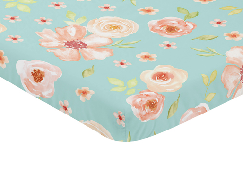 Watercolor Floral Turquoise and Peach Collection Mini Crib Sheet