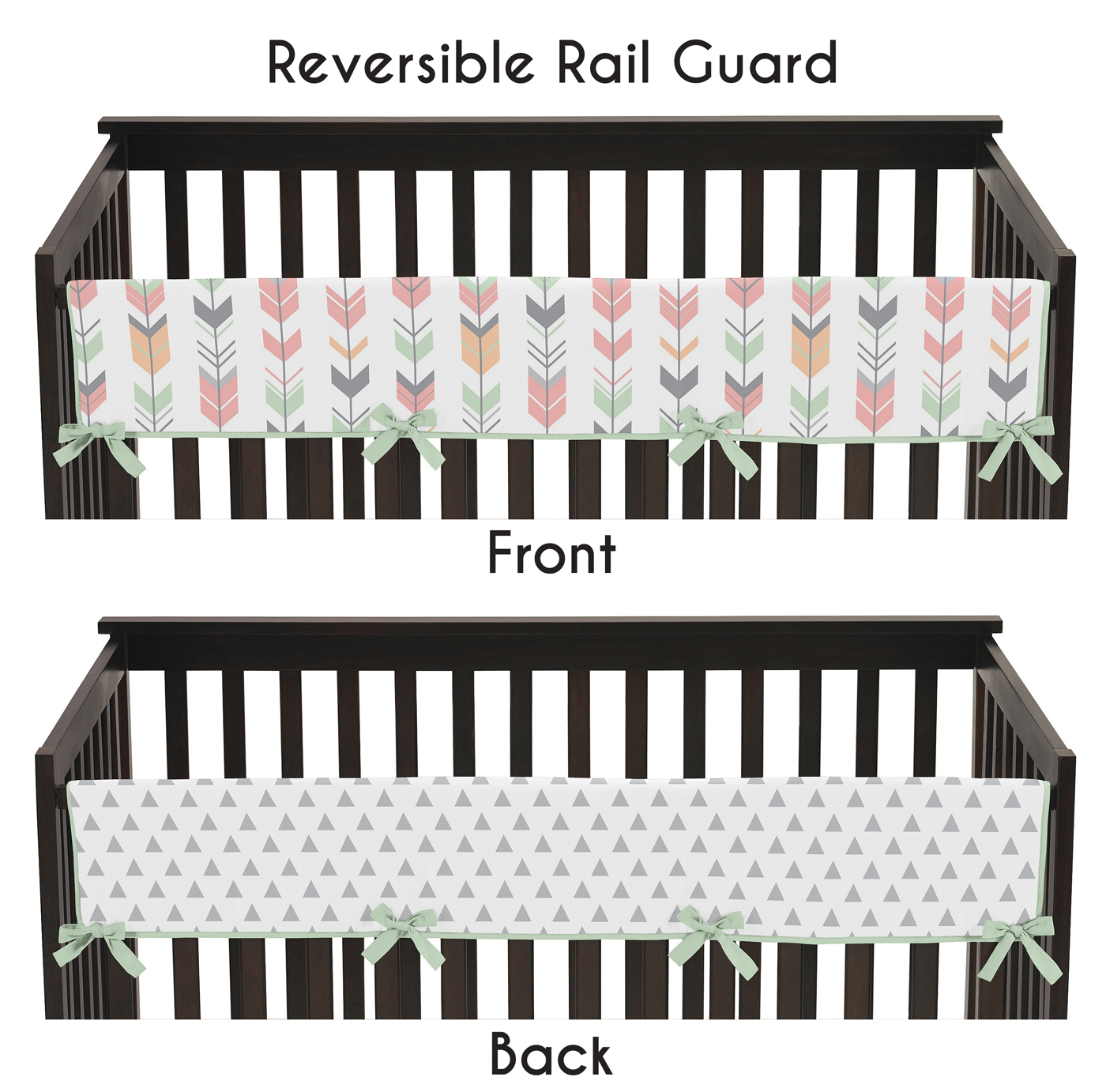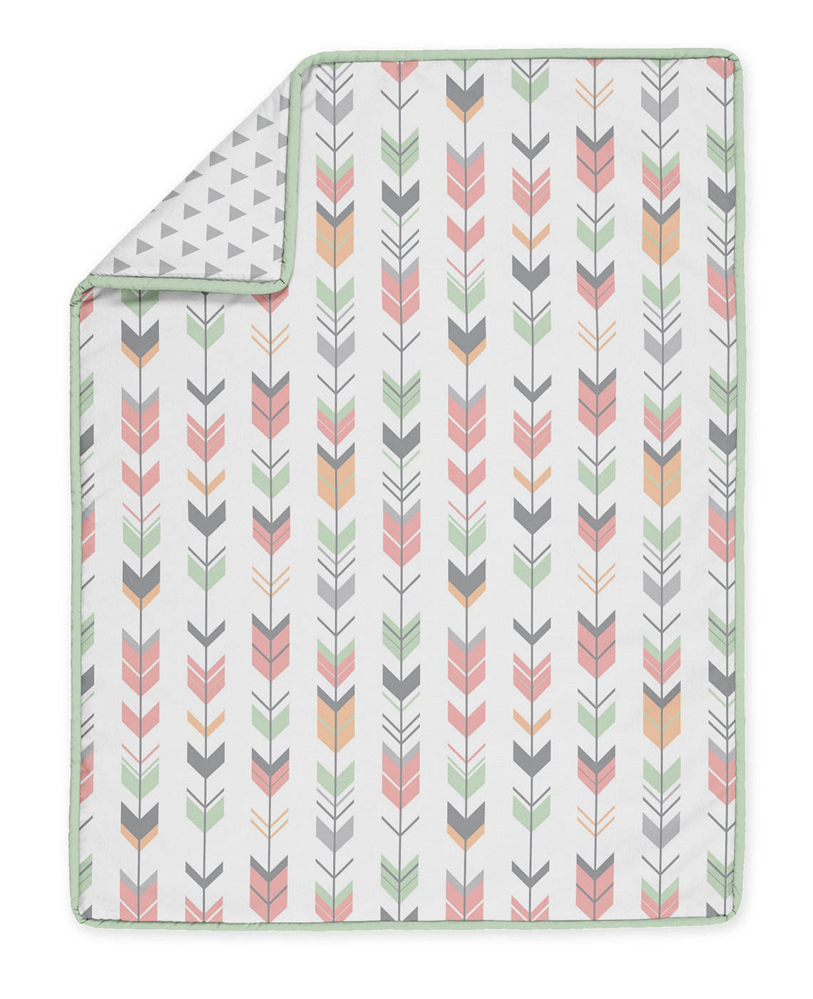 Coral and Mint Mod Arrow 5 pc Crib Bedding set has all that your little bundle of joy will need. Let the little one in your home settle down to sleep in this incredible nursery set. This set combines a multi-colored arrow print, a coordinating triangle print, and solid mint and grey fabrics. This collection uses the stylish colors of Mint, Grey, Coral and White. The design uses brushed microfiber fabrics that are machine washable for easy care. This wonderful set will fit most standard cribs and toddler beds.