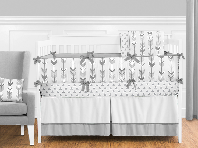 Grey and White Mod Arrow 9 pc Crib Bedding set has all that your little bundle of joy will need. Let the little one in your home settle down to sleep in this incredible nursery set. This unisex baby bedding set features a multi grey toned arrow print, a coordinating triangle print, solid dark grey, light grey and white fabrics. This collection uses the stylish colors of dark grey, light grey and white. The design uses brushed microfiber fabrics that are machine washable for easy care. This wonderful set will fit most standard cribs and toddler beds.