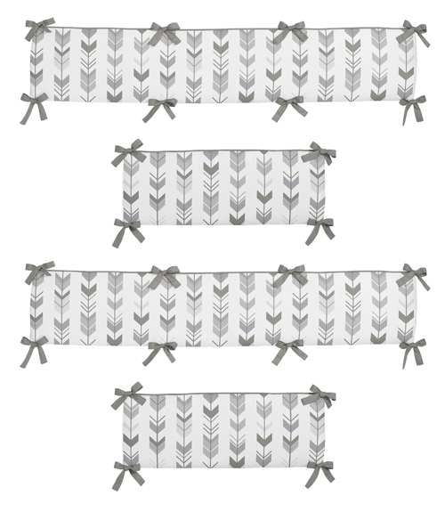 Now you can complete your nursery decor with this Sweet Jojo Designs Grey and White Woodland Arrow crib bumper. This bumper is created using the arrow print and reverses to solid light grey. It is finished with dark grey piping, and upper and lower ties. The trendy color palette of grey and white will set your nursery up in high style.