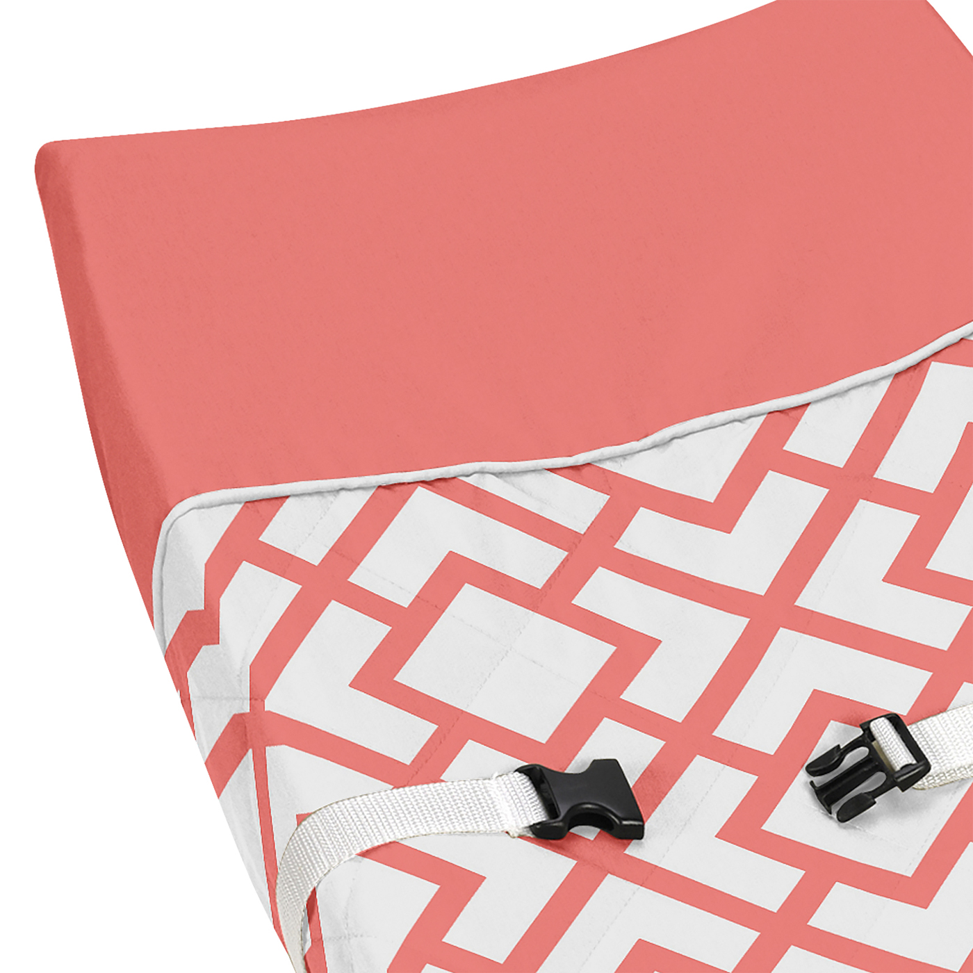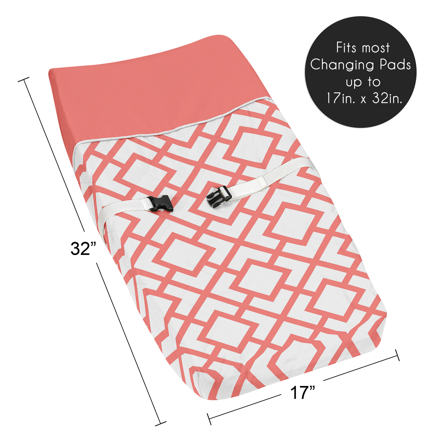 White and Coral Mod Diamond Changing Pad Covers will help complete the look of your Sweet Jojo Designs nursery. This changing pad cover can be used with standard or contoured changing pads up to 17in. x 32in. It also has elastic edges for a tailored, snug fit.