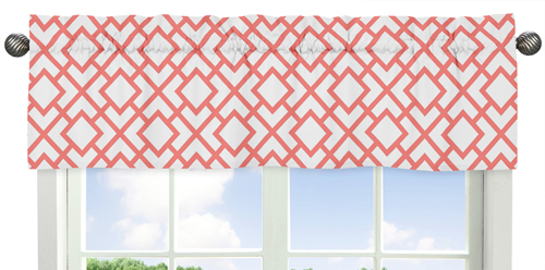 White and Coral Mod Diamond Window Valances will help complete the look of your Sweet Jojo Designs room. This valance softens the look of the window and obscures pulled up blinds. It will coordinate nicely with your Sweet Jojo Designs bedding or can be used as an accent with your own room design.