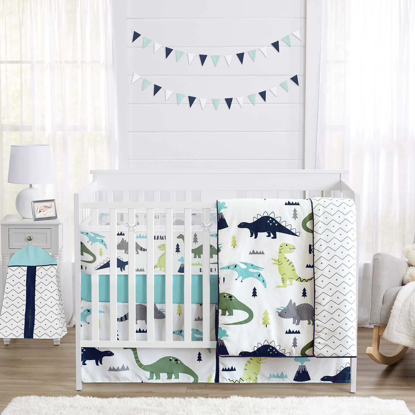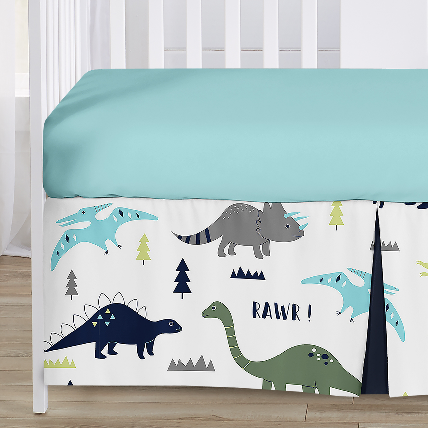 6 Piece Set Includes: Baby blanket, fitted sheet, crib skirt, BreathableBaby mesh crib liner (2 piece set) and diaper stackerDimensions: Crib Blanket: 45 in. x 36 in., Fitted Crib Sheet: 52 in. x 28 in. x 8 in. pocket, Crib Skirt: 52 in. x 28 in. x 15 in. Drop, Diaper stacker: 15 in. x 20 in. x 6 in., Long Panel Mesh Liner: 11in. x 111in. and Short Panel Mesh Liner: 11in. x 82in.This set boasts a turquoise navy blue, green, grey and white modern dinosaur prehistoric boho bohemian mod dino dinosaurs and volcanoes print with a coordinating geometric chevron print.The crib bedding set is made of brushed microfiber fabric and is machine washable; tumble dry low. The BreathableBaby mesh crib liner baby nursery is made of 100% polyester and is machine washable. Wash separately. Machine wash warm gentle cycle. Only non-chlorine bleach when needed. Tumble dry low.Sweet Jojo Designs offers matching accessories such as crib sheets, changing pads, wall decor, window treatments, storage solutions, and much more. This design is also available in crib, toddler, twin, and queen bedding sets.Item# ModDino-BU-GR-Crib-6