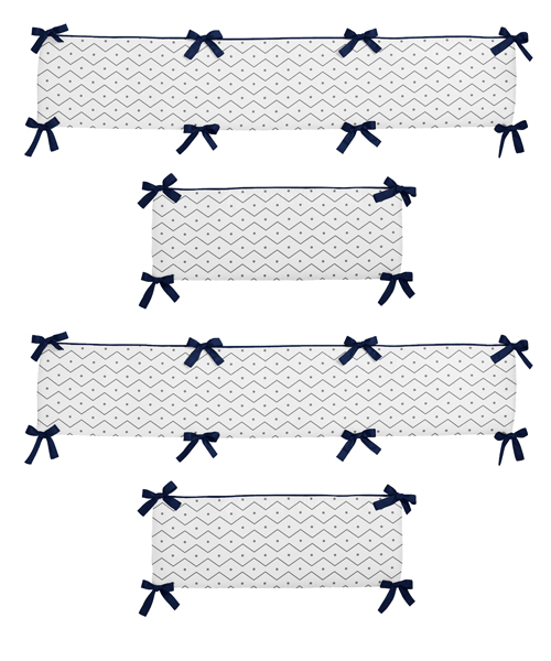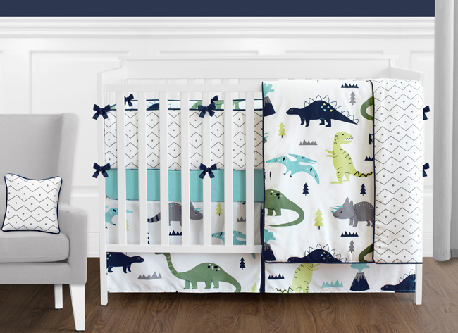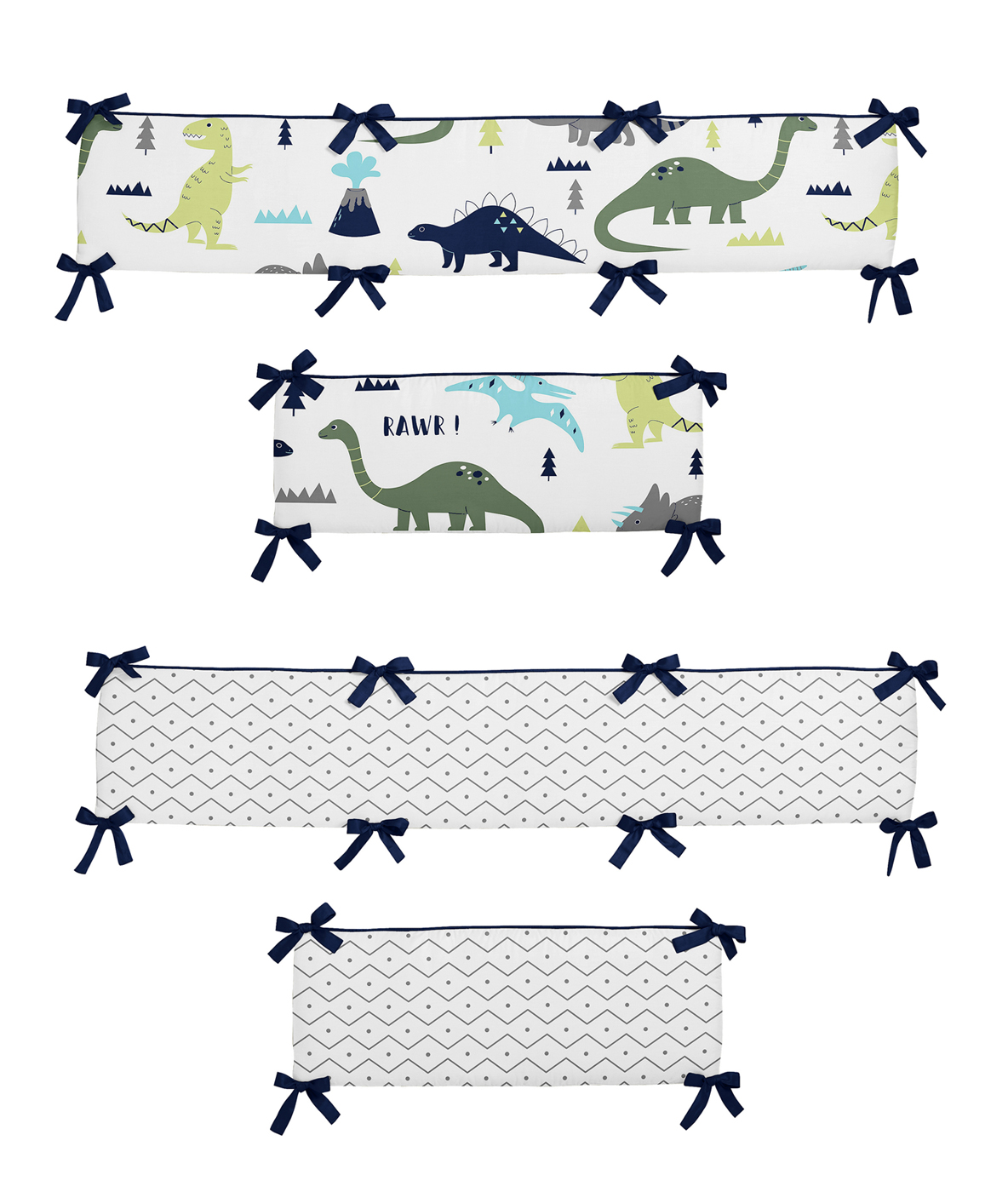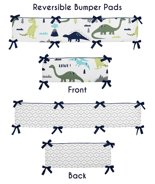 Now you can complete your nursery decor with this Sweet Jojo Designs Blue and Green Mod Dinosaur crib bumper. This bumper is created using the multicolored dinosaur print and reverses to the grey chevron prehistoric print. The bumper is finished with navy blue piping and navy blue upper and lower ties. The color palette of navy blue, turquoise, lime green, olive green, grey and white will set your nursery up in high style.