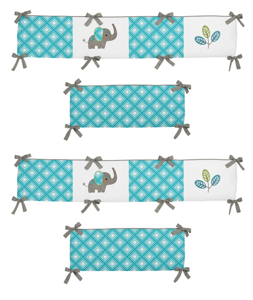 Now you can complete your nursery decor with this Sweet Jojo Designs Mod Elephant crib bumper. This bumper is created using a patchwork with elephant and leaf appliques. The bumper is finished with gray piping and upper and lower ties. The color palette of turquoise blue, teal, green, gray, orange, and white will set your nursery up in high style.