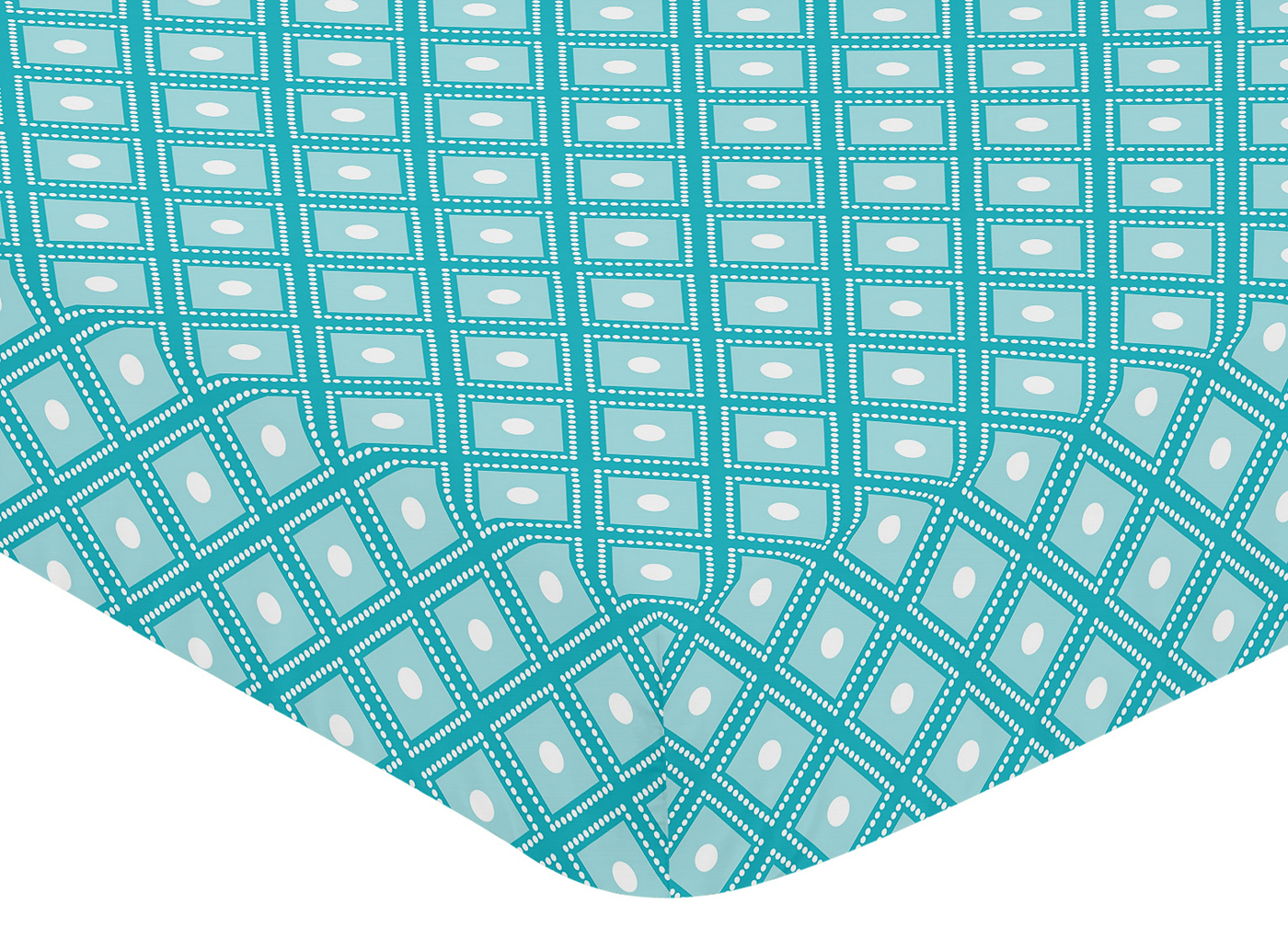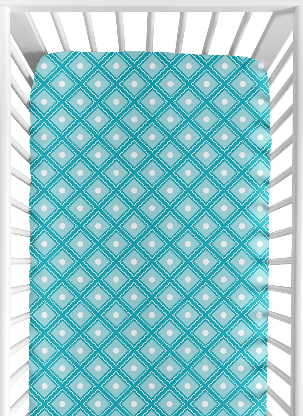 Mod Elephant fitted crib sheets will help complete the look of your Sweet Jojo Designs nursery. This turquoise blue and white diamond print 100% Cotton sheet fits all standard crib and toddler mattresses and is machine washable for easy care. Dimensions: 52 in x 28 in x 8 in.