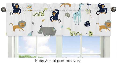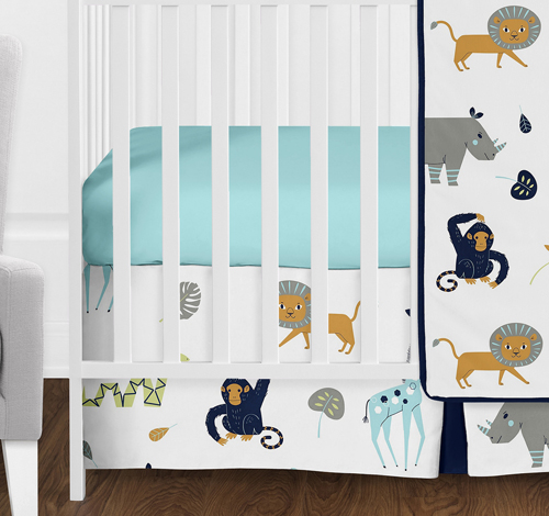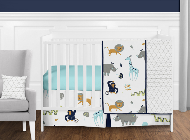 Mod Jungle 11 pc Crib Bedding set has all that your little bundle of joy will need. Let the little one in your home settle down to sleep in this incredible nursery set. This unisex baby bedding set features a multicolored jungle animal print, a coordinating modern triangle print, and solid turquoise and navy blue fabrics. This collection uses the stylish colors of navy blue, turquoise, lime green, orange, grey and white. The design uses brushed microfiber fabrics that are machine washable for easy care. This wonderful set will fit most standard cribs and toddler beds.