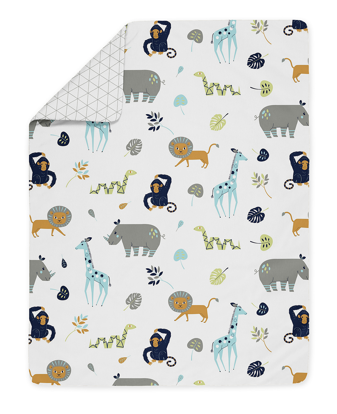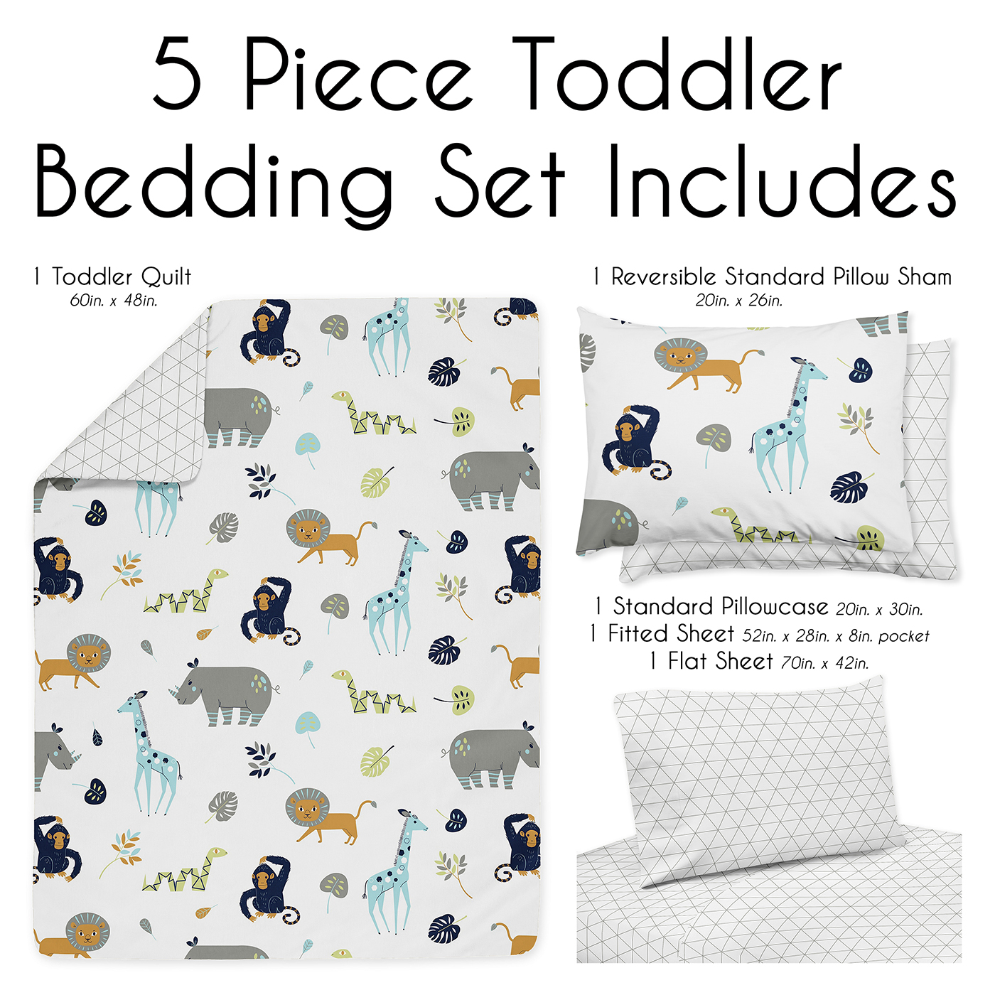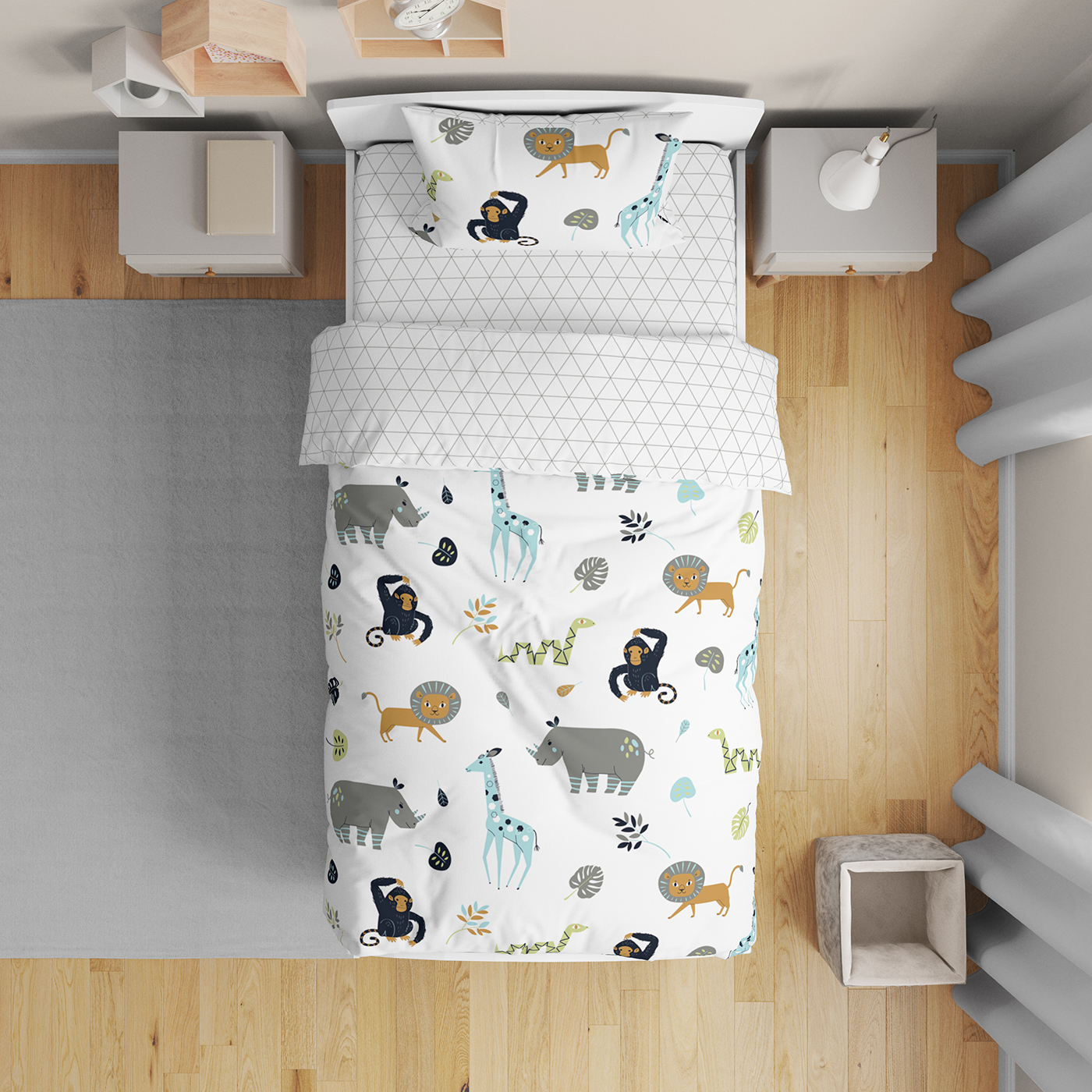 Mod Jungle Toddler Bedding set will help you create an incredible room for your child. This stylish designer bedding set features a multicolored jungle animal print and a coordinating modern triangle print. This collection uses the stylish colors of navy blue, turquoise, lime green, orange, grey and white. The design uses brushed microfiber fabrics that are machine washable for easy care. This wonderful set will fit most standard cribs and toddler beds.