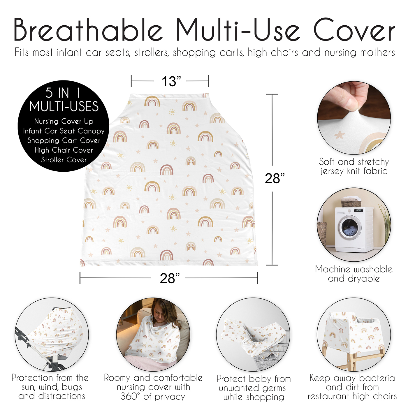 This soft and stretchy multi use baby car seat canopy and nursing cover will be your next newborn essential. The 5 in 1 cover makes the perfect baby car seat cover, baby nursing cover, breastfeeding cover, baby high chair cover, baby shopping cart cover, infant stroller cover, baby carrier cover, infinity scarf and much more for both you and your infant.