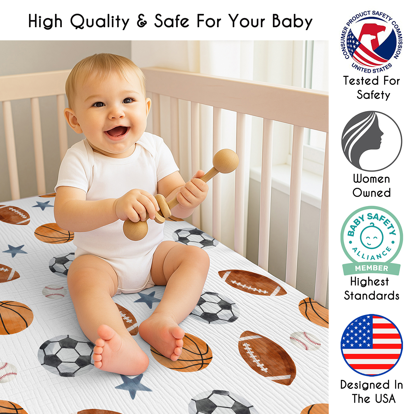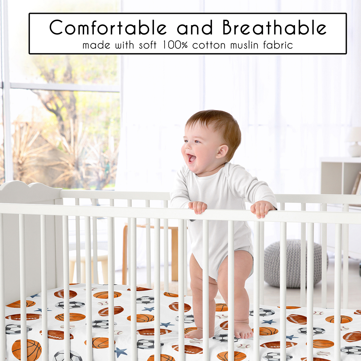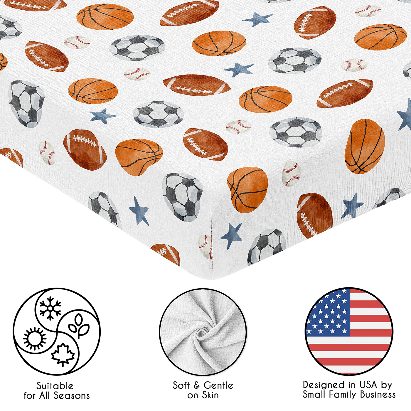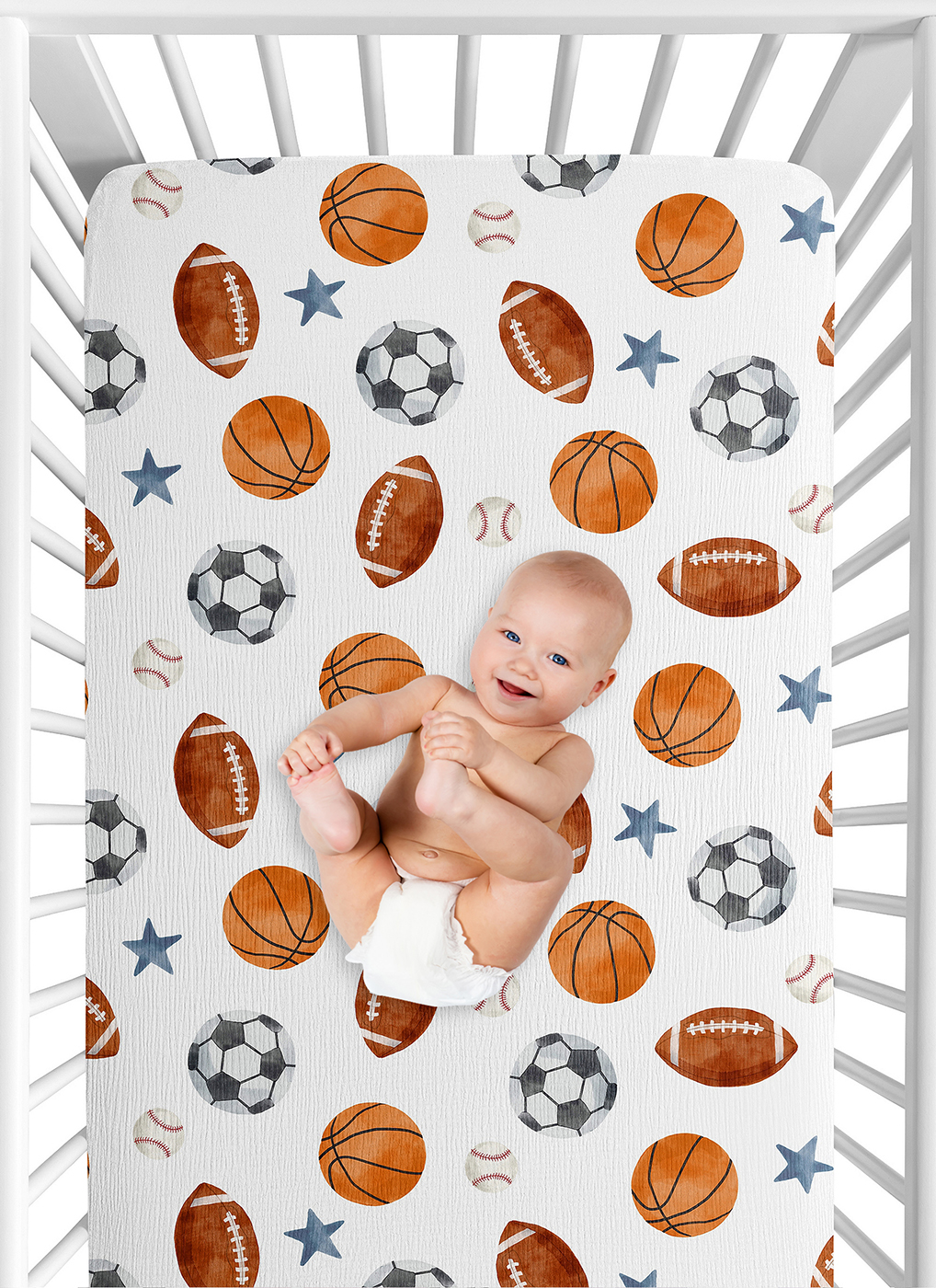 SNUG FIT: Includes (1) Fitted Cotton Crib Sheet 52in. x 28in. x 8in. Our newborn cotton crib sheets fit snugly, with premium elastic sewn around the bottom edge for a secure fit on most standard sized cribs & toddler beds, to reduce shifting & bunching. This 100% cotton crib sheet features a watercolor sport themed, soccer, football, baseball, basketball star print in a color palette of black, white, brown, red, orange & blue & is gentle on delicate skin to foster a soothing sleep environment.DESIGNED IN THE USA: By real parents who understand the need for comfort, practicality, and style. Sweet Jojo Designs is a small, women owned business. The mom's on our team know a muslin crib sheet is first priority for your baby essentials to ensure a restful night of sleep. We use top fabrics & designs to create soft crib sheets cotton that are stretchy & comfortable for your infant or toddler. We've studied the latest trends in sports muslin cribs sheets boy to bring you the finest product.SAFE & DURABLE: Sweet Jojo Designs is a proud Baby Safety Alliance member & rigorously tests products to meet or exceed CPSC safety standards. Our breathable muslin sheets are designed with busy parents in mind. Quick to change, easy machine washable & tumble dry on low. The high quality stitching & fabric ensure long-lasting use & will hold up wash after wash. Use a baby crib sheets cotton in your newborns bed & have spares nearby to swap between washes & to be prepared if an accident happens.PERFECT GIFT: Add a baby boy crib sheet muslin to your list of must haves! Including toddler bed sheets cotton on your gift registry, in a baby shower gift basket or as a gender reveal present is an easy way to prepare for a baby's arrival. Whether it's nap time, bedtime, or an unexpected mess, having extras of these fitted cotton crib sheets make changes effortless so you can focus on what matters most to you & your family. Remember, you can never have too many 100% cotton crib sheets fitted!NURSERY DESIGN MADE EASY: If you have a nursery to decorate, we have endless coordinating options to help. A nursery theme can be planned entirely around baby crib mattress sheet cotton. Sweet Jojo Designs makes decorating simple with matching crib bedding sets, toddler bedding sets, crib sheet set, crib bed sheets, changing pad covers, milestone blankets, wall decor, decorative accessories, swaddles, & window treatments to make sure you have all you need to complete the look of your baby room. Item# MusCS-Sports-BU-PRT