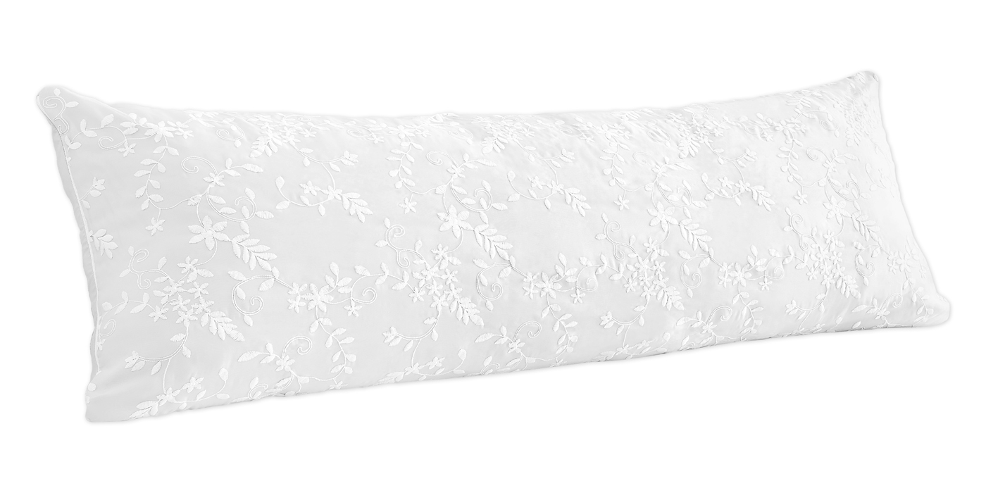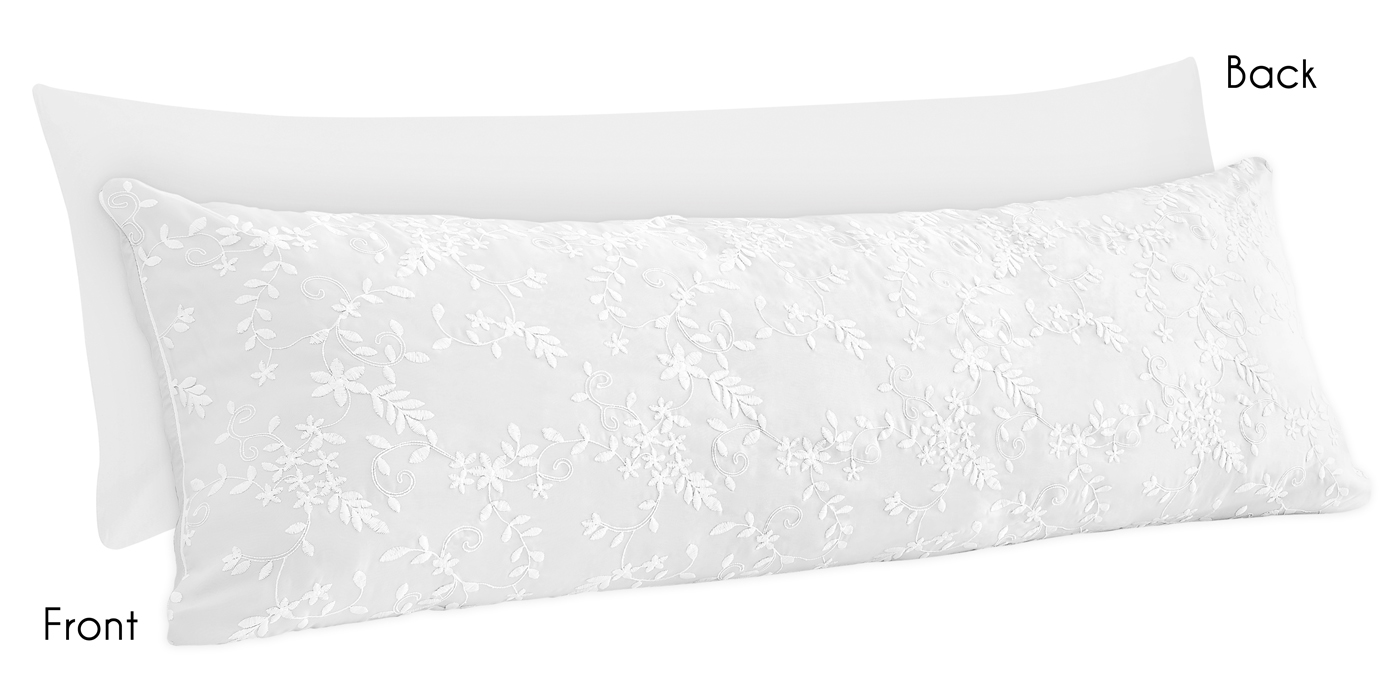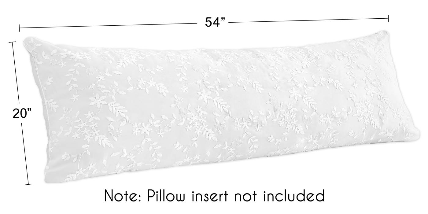 White Lace reversible body pillow case will add that special touch to any room. It is designed to fit most standard body pillows and made to coordinate with Sweet Jojo Designs Bedding Sets. This cover features zipper closures on both sides for easy use. Machine washable and dryable. Features:Floral Lace and Brushed Microfiber 54in. x 20in. Reversible Zipper closures on both sides for easy use Machine washable and dryable