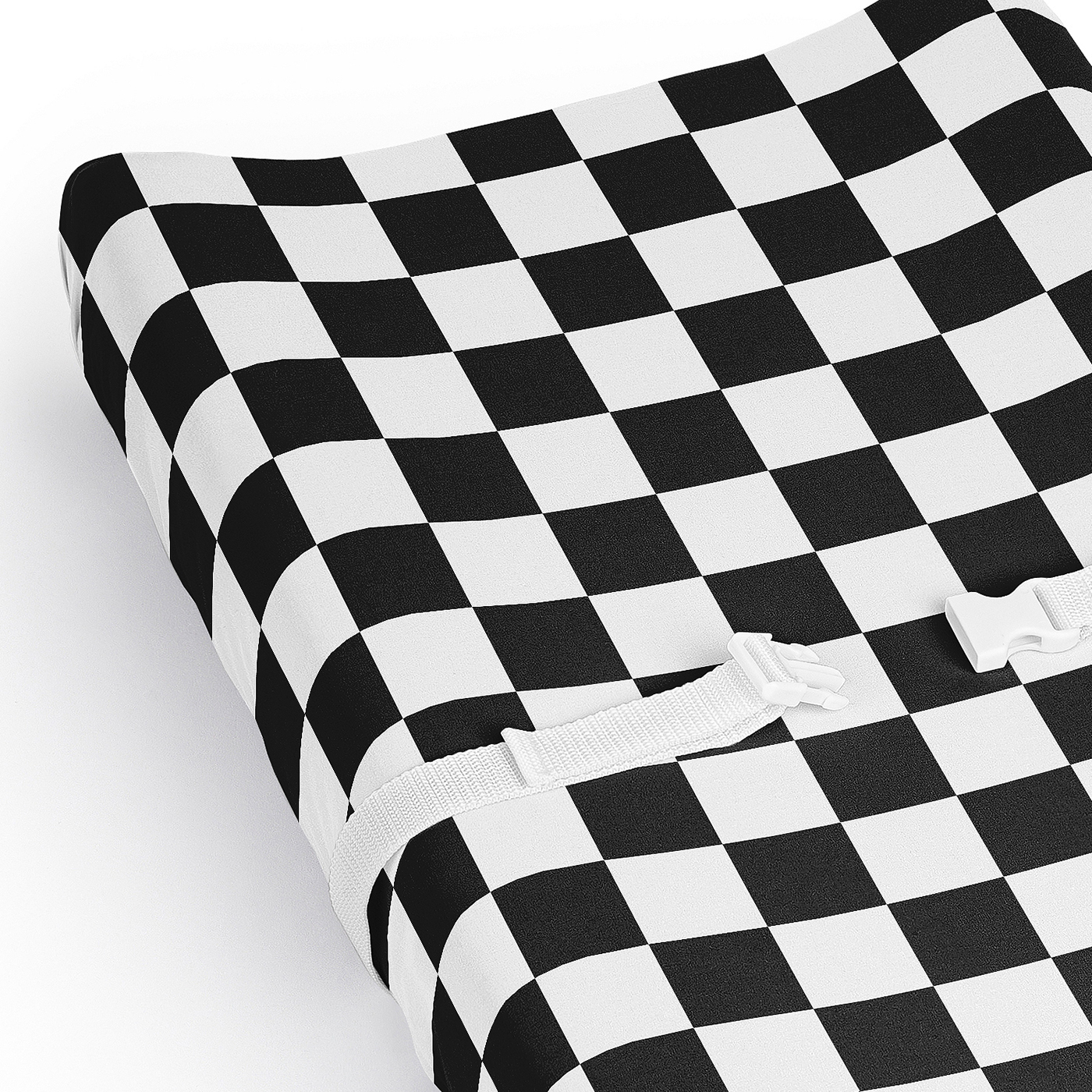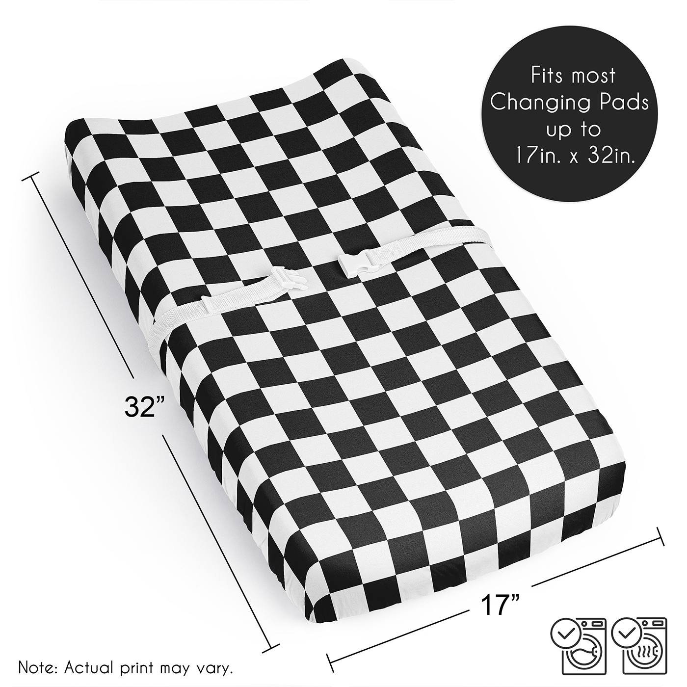 SNUG AND COZY: A Diaper Changing Pad Cover Sheet that measures 17in. x 32in. offers a practical solution for parents seeking comfort and convenience. Made with elastic edges ensures a snug, secure fit, preventing the cover from shifting during use. The soft brushed microfiber fabric provides a comfortable surface for your little one. Machine washable, tumble dry low. This classic unisex changing table sheets features a white & black minimalist, vintage retro geometric, plaid checker board print.DESIGNED IN THE USA: By real parents who understand the need for comfort, practicality, and style. Sweet Jojo Designs is a small, women owned business. The mom's on our team know a changing table cover is a first priority for your baby essentials for a completed look. As a proud Baby Safety Alliance member who rigorously tests products to meet or exceed CPSC safety standards, Sweet Jojo Designs is dedicated to creating high-quality products that meet the high standards for you and your family.CONVENIENT & HYGENIC: Changing pad sheets are an essential buy for parents who want to keep their baby’s space clean. Since diaper changes can sometimes be messy, a cover for changing pad creates a protective layer, preventing direct contact with spills & accidents. It's easily removed for washing to ensure a sanitary surface. Changing table topper covers help create a cleaner & more sanitary surface for your diaper changing station. Use with changing pad liners for ultimate protection. PERFECT GIFT: Add changing pad covers to your list of must haves! Include one on your gift registry, in a baby shower gift basket or as a gender reveal present as an easy way to prepare for a new arrival. Our baby diaper changing pad covers fit most standard & contoured changing pads with a fully elastic band all the way around the edges to make changes effortless so you can focus on what matters most to you & your family. Remember, you can never have too many covers for diaper changing pads! NURSERY DESIGN MADE EASY: If you have a nursery to decorate, we have endless coordinating options to help. A nursery theme can be planned entirely around a baby changing pad cover. Sweet Jojo Designs makes decorating simple with matching crib bedding sets, toddler bedding sets, crib sheet set, crib bed sheets, nursing covers, milestone blankets, wall decor, decorative accessories, swaddles, curtains and window treatments to make sure you have all you need to complete the look of your baby room.Item# PadSheet-Check-BK-WH