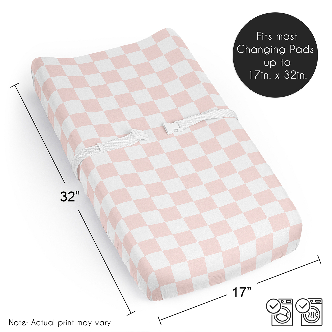 SNUG AND COZY: A Diaper Changing Pad Cover Sheet that measures 17in. x 32in. offers a practical solution for parents seeking comfort and convenience. Made with elastic edges ensures a snug, secure fit, preventing the cover from shifting during use. The soft brushed microfiber fabric provides a comfortable surface for your little one. Machine washable, tumble dry low. This shabby chic baby girls changing table sheets features a white & blush pink geometric, checkered, vintage gingham plaid print.DESIGNED IN THE USA: By real parents who understand the need for comfort, practicality, and style. Sweet Jojo Designs is a small, women owned business. The mom's on our team know a changing table cover is a first priority for your baby essentials for a completed look. As a proud Baby Safety Alliance member who rigorously tests products to meet or exceed CPSC safety standards, Sweet Jojo Designs is dedicated to creating high-quality products that meet the high standards for you and your family.CONVENIENT & HYGENIC: Changing pad sheets are an essential buy for parents who want to keep their baby’s space clean. Since diaper changes can sometimes be messy, a cover for changing pad creates a protective layer, preventing direct contact with spills & accidents. It's easily removed for washing to ensure a sanitary surface. Changing table topper covers help create a cleaner & more sanitary surface for your diaper changing station. Use with changing pad liners for ultimate protection. PERFECT GIFT: Add changing pad covers to your list of must haves! Include one on your gift registry, in a baby shower gift basket or as a gender reveal present as an easy way to prepare for a new arrival. Our baby diaper changing pad covers fit most standard & contoured changing pads with a fully elastic band all the way around the edges to make changes effortless so you can focus on what matters most to you & your family. Remember, you can never have too many covers for diaper changing pads! NURSERY DESIGN MADE EASY: If you have a nursery to decorate, we have endless coordinating options to help. A nursery theme can be planned entirely around a baby changing pad cover. Sweet Jojo Designs makes decorating simple with matching crib bedding sets, toddler bedding sets, crib sheet set, crib bed sheets, nursing covers, milestone blankets, wall decor, decorative accessories, swaddles, curtains and window treatments to make sure you have all you need to complete the look of your baby room.Item# PadSheet-Check-PK-WH