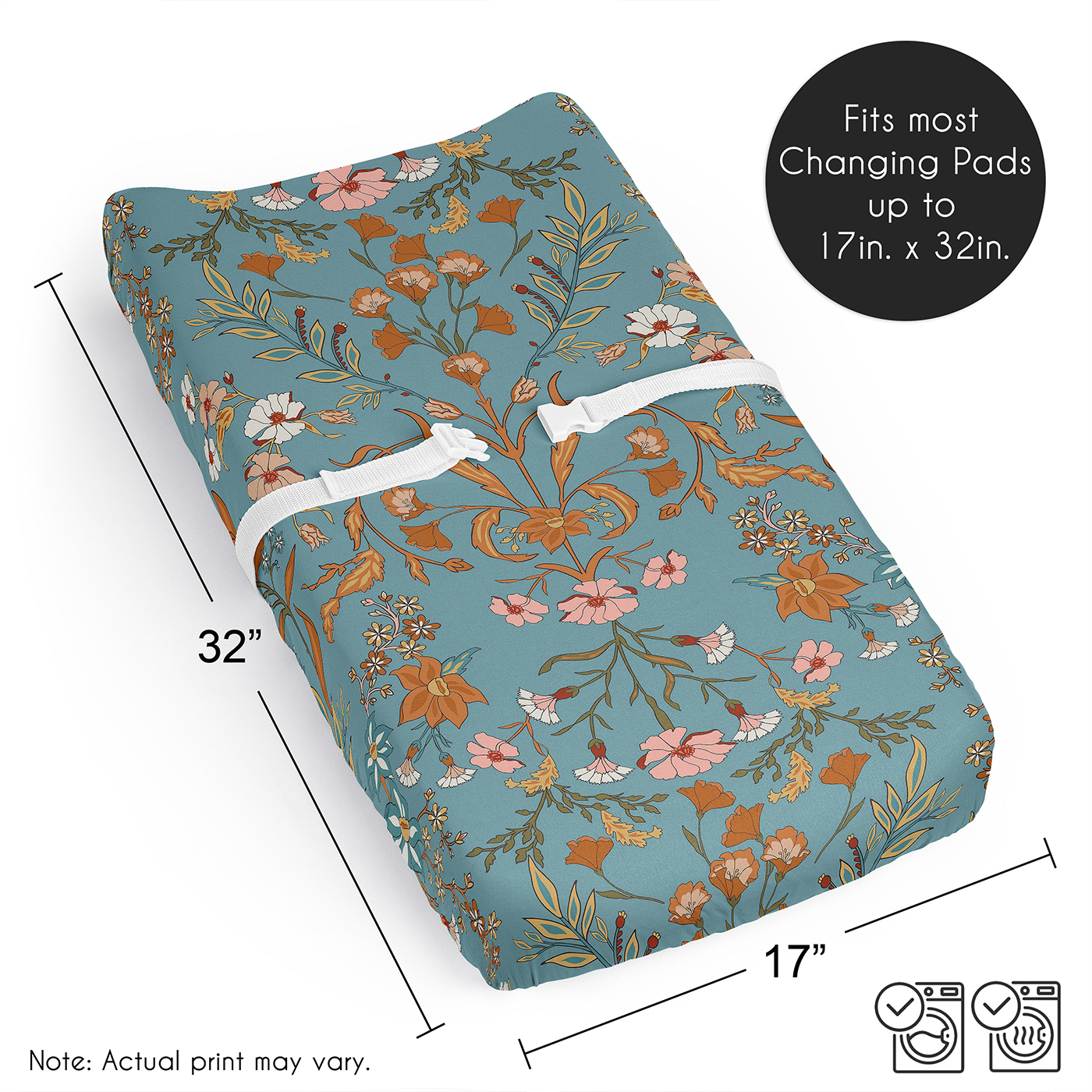 Includes: (1) Diaper Changing Pad Cover Sheet: 17in. x 32in. Easy machine washable and dryable.This brushed microfiber diaper pad cover sheet features an exclusive design of a turquoise blue, rust orange, teal, green, pink and yellow boho wildflower vintage botanical garden daisy paisley leaf leaves bohemian flower farmhouse cottagecore indie rustic floral print.A a diaper changing pad sheet cover with elastic edges offers a practical solution for parents seeking comfort and convenience. The elastic edges ensure a snug, secure fit, preventing the cover from shifting during use. This soft fabric provides a comfortable surface for your little one. These covers are easy to remove to help maintain a clean, hygienic environment for diaper changes, making them a must-have for busy parents.Add a baby change mat cover sheet to your list of must haves for your new little one! This soft pad cover is stretchy and comfortable to fit most changing table pads perfectly while also providing a stand out nursery decor accessory to complete the look of your baby room. Add flare to baby outfit changes and diaper changing time with a baby changing pad cover that fits most standard and contoured changing pads with a fully elastic band all the way around the edges for a secure fit.Makes the perfect gift to coordinate with Sweet Jojo Designs nursery bedding, wall art, nursing pillow covers, window treatments, storage solutions, nursery room decoration accessories and layette sets. Include It in your baby shower gift basket or gender reveal presents or add to your gift registry to ensure you have all you need to complete your baby bed room look.Item# PadSheet-WildFloral-BU