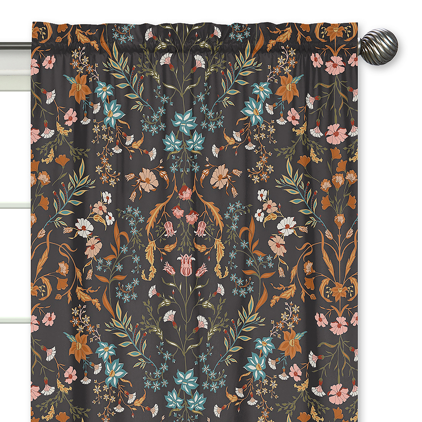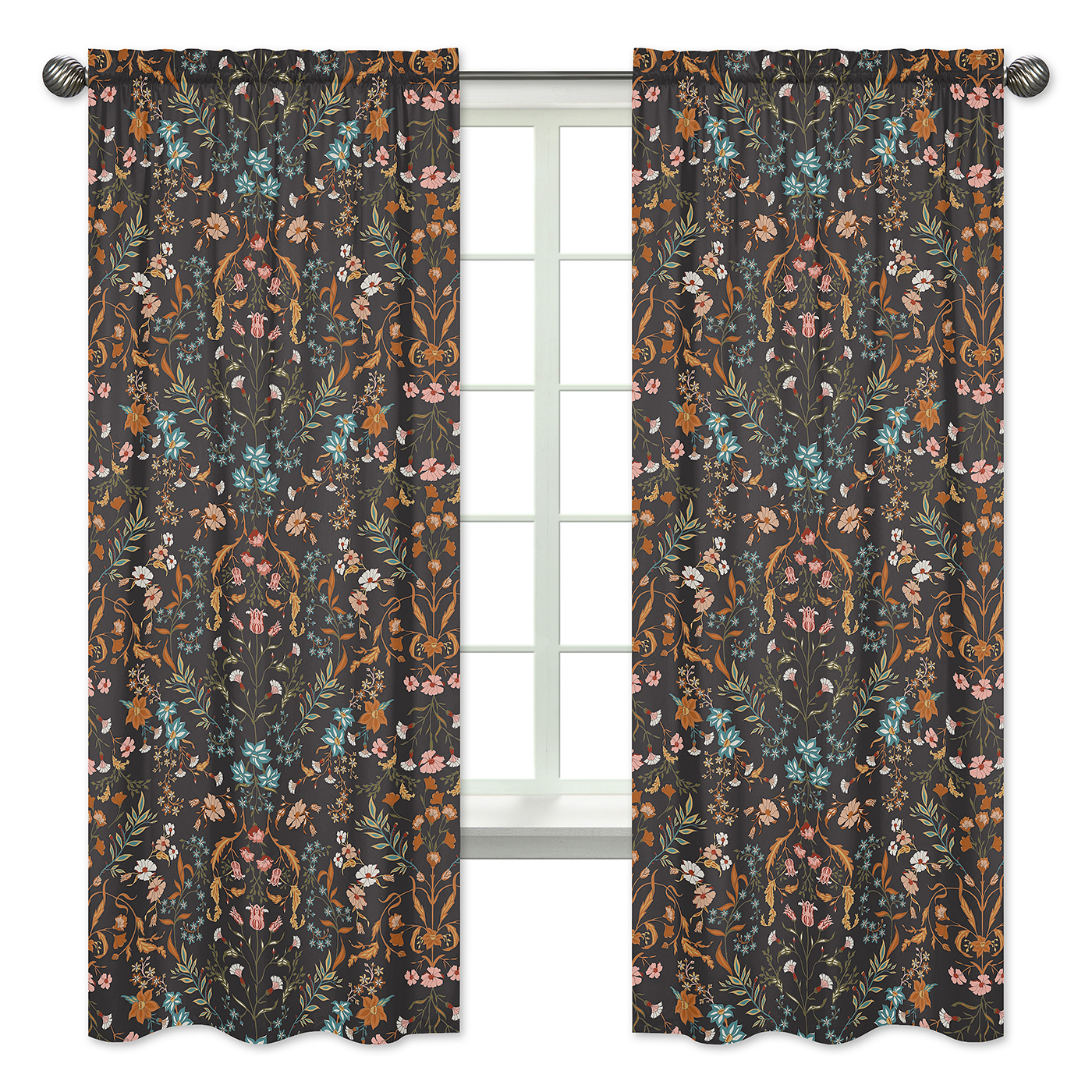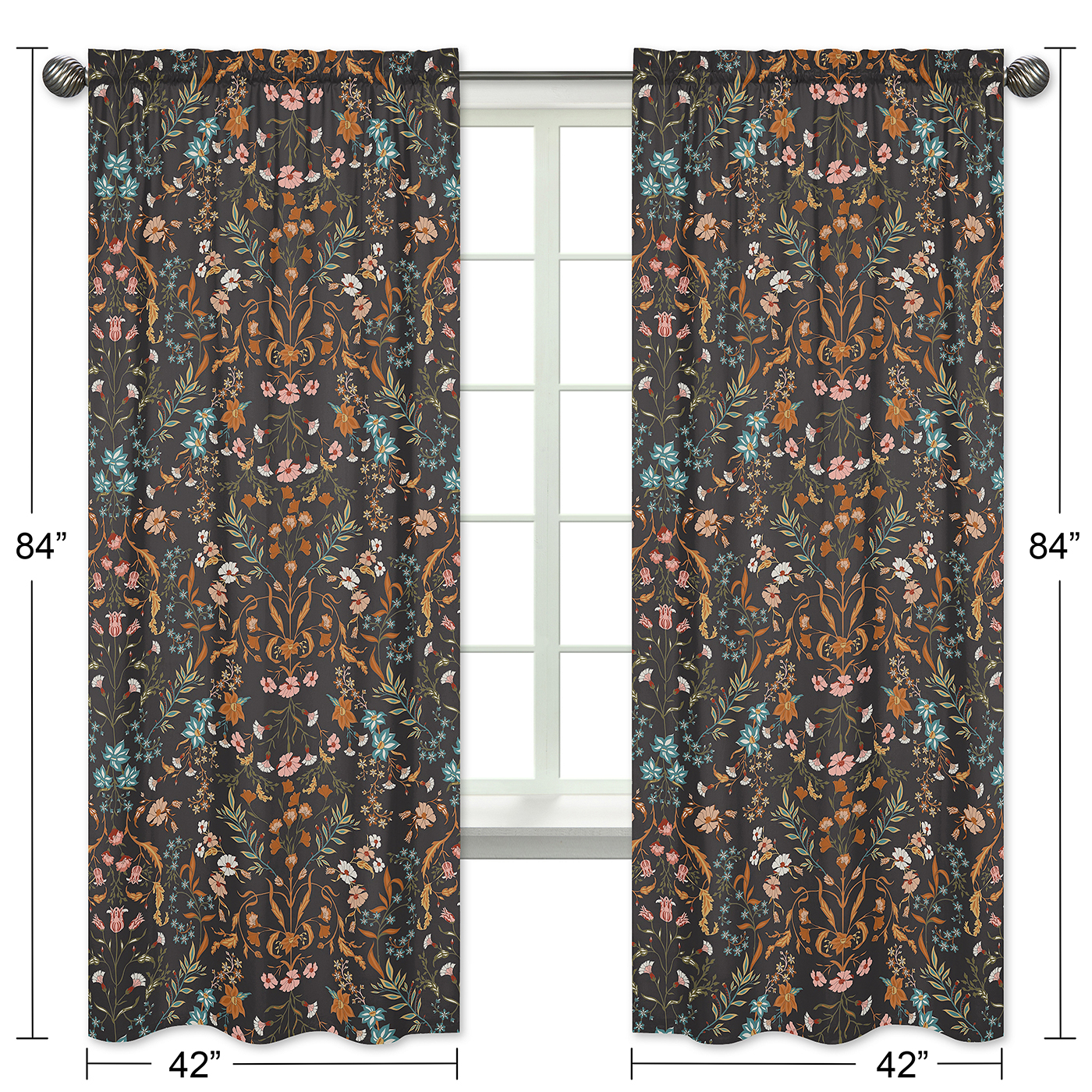 Includes: (2) Long Window Panels: 42in. x 84in each; Note: These are NOT black out curtains.Easy machine washable and tumble dry low.These brushed microfiber light filtering curtains feature an exclusive design of black, rust orange, teal turquoise blue, green, pink and yellow boho wildflower vintage floral bohemian farmhouse daisy leaves botanical paisley leaf flower garden indie rustic cottagecore print.Window curtain panels are the perfect finishing touch to any makeover in your nursery, apartment, classroom, teenagers college dorm, childs bedroom, den, family room, foyer, gaming room, guest room, home theater, toddlers bed room, kitchen, home gym, home office, living room, mud room or play room. These are a must have household decor essential! Made to fit standard rods up to 0.75 inches in diameter, these single layer rod pocket curtains are a great decorative addition to any room.Makes the perfect gift to coordinate with Sweet Jojo Designs nursery bedding, baby swaddle and cocoon blankets, nursing pillow covers, nursery room decoration accessories and layette sets. Include It in your baby shower gift basket or gender reveal presents or add to your baby gift registry to ensure you have all you need to complete your Sweet Jojo Designs baby bed room look.Item# Panel-WildFloral-BK