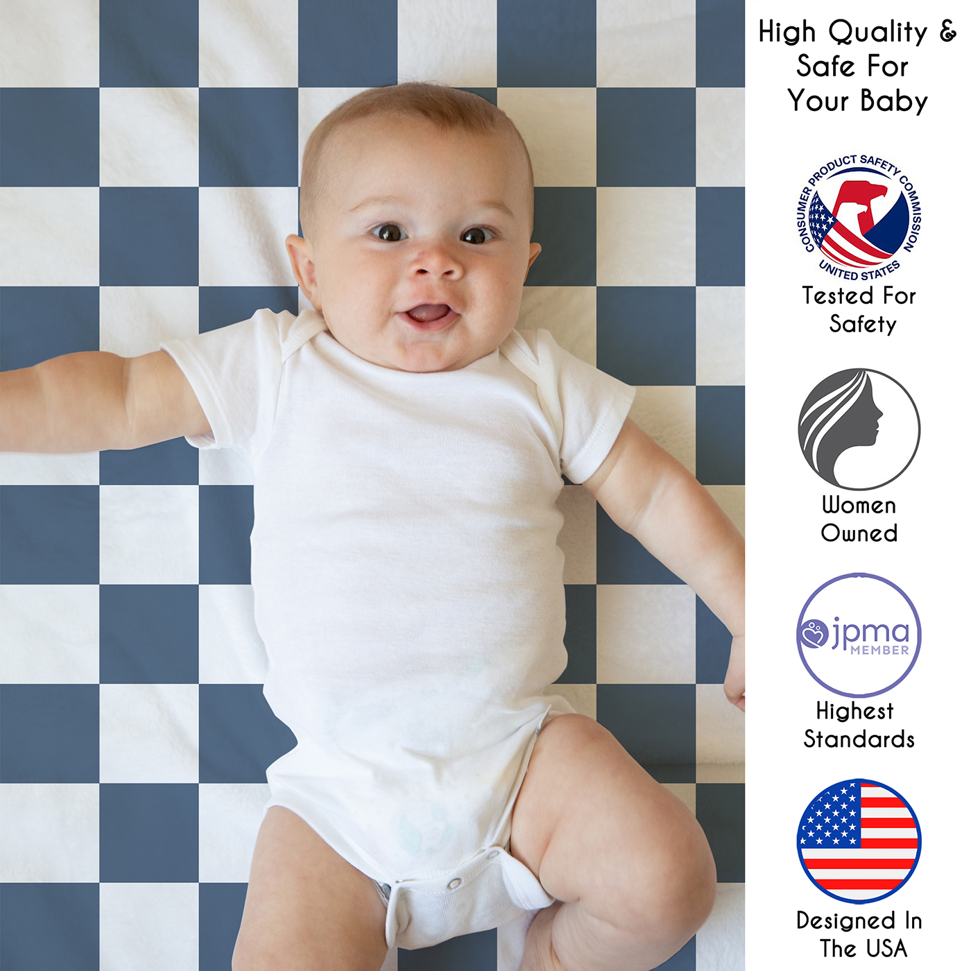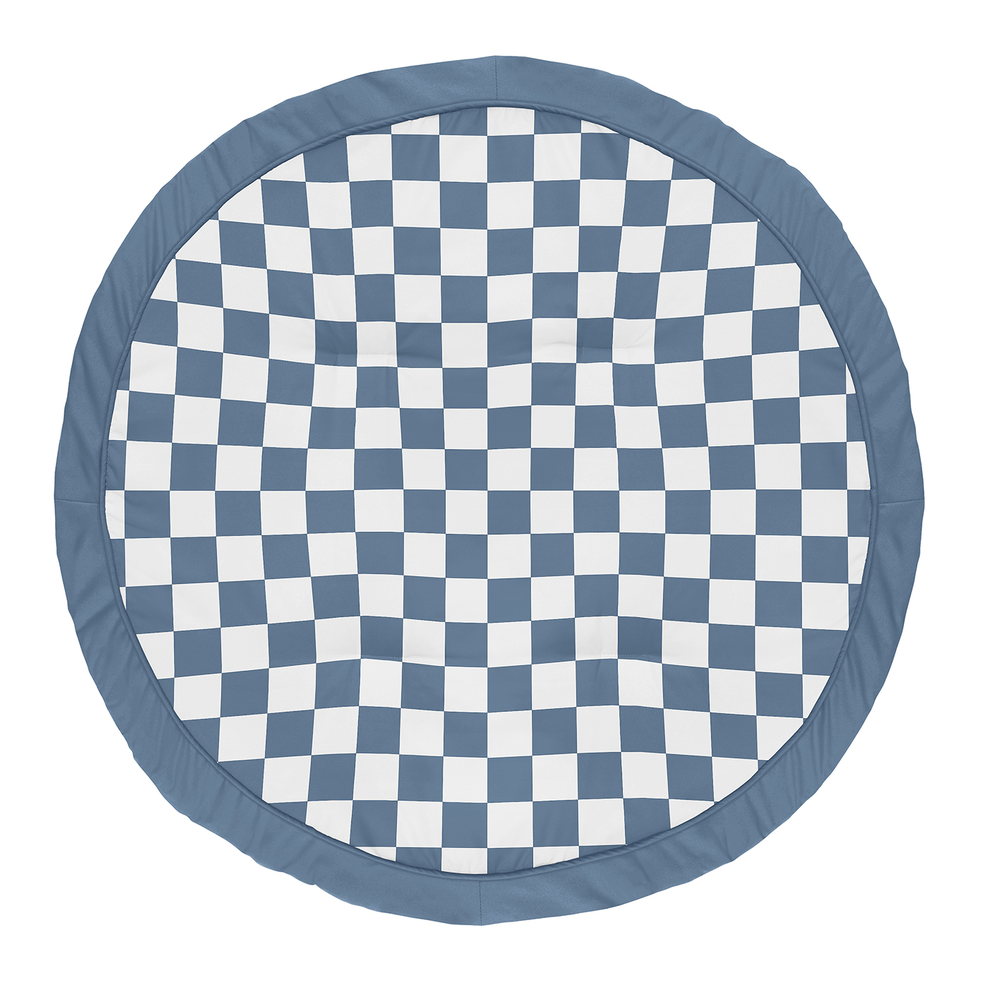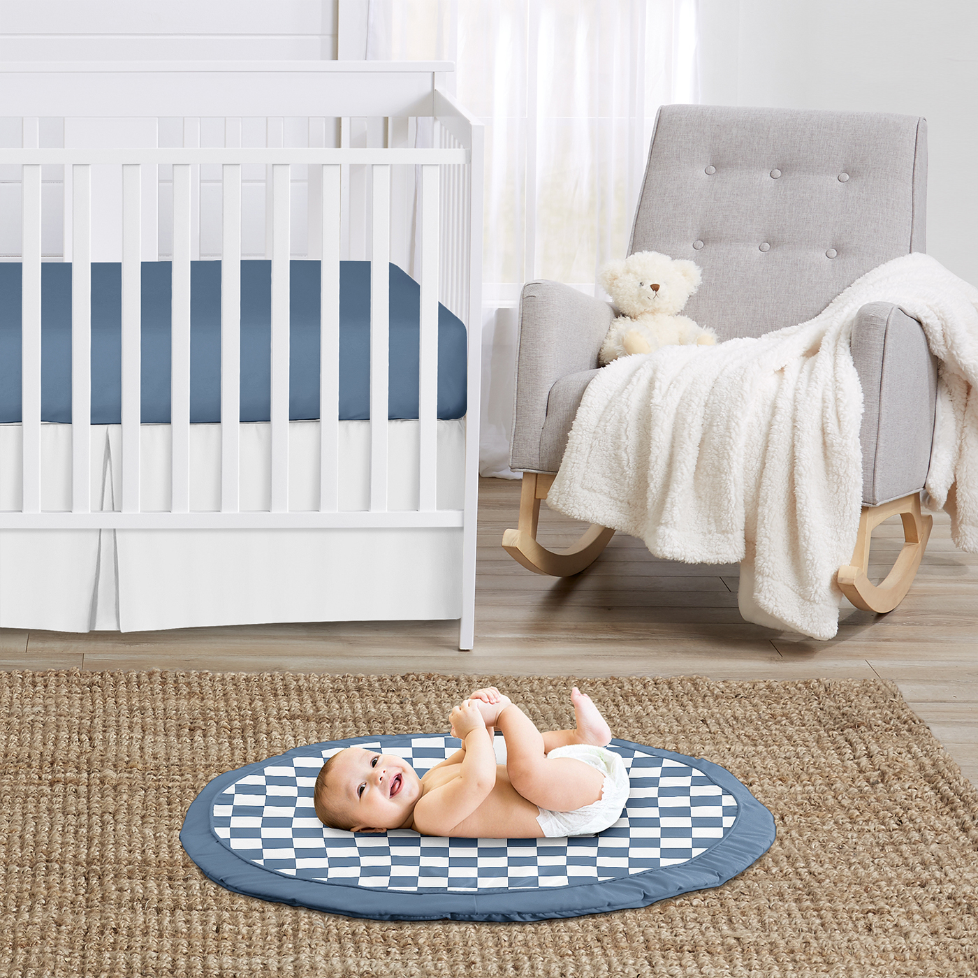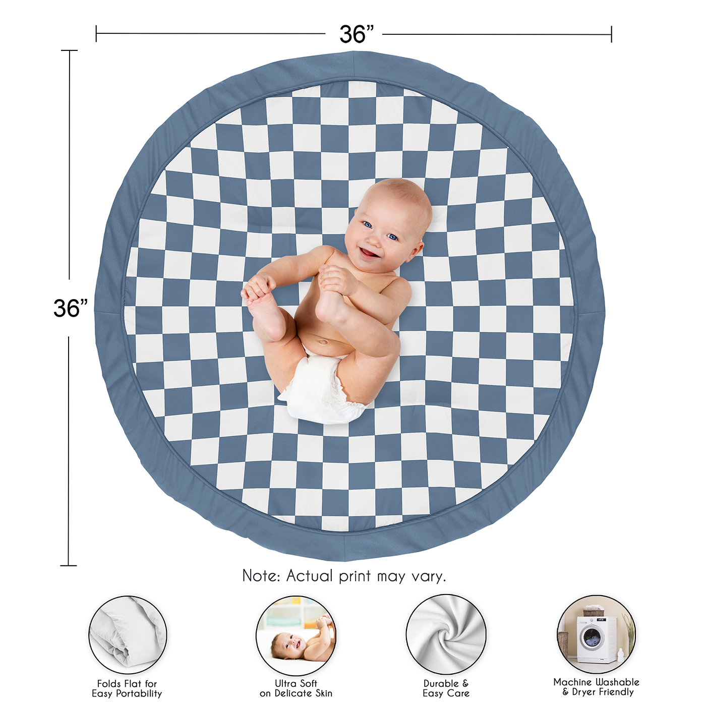 TUMMY TIME MUST HAVES: Baby Play Mat (36in. Round). Designed in the USA with moisture wicking, super soft brushed microfiber fabric. Machine washable, tumble dry low. This classic boys baby playmat would pair perfectly with coordinating bedding sets & match the minimalist Gingham Checkered Plaid Collection accessories to complete your newborn/infants nursery themed look. This lightly padded floor mat is the perfect addition to help the development of crawling & standing for your little one!CHECKERED GINGHAM THEME: This baby boys tummy time playmat boasts a vintage, classic white and steel, slate blue, retro, minimalistic gingham plaid print and finished with a solid steel blue piping and border. A round infant floor mat can be used in baby nurseries, play rooms, play pens, playhouse, livingroom, bed room, apartment, play yard, or home office during tummy time to get your new addition comfortable with crawling and getting practice in standing & eventually walking.DESIGNED IN USA TO BE SAFE & DURABLE: As a proud Baby Safety Alliance member who rigorously tests products to meet or exceed CPSC safety standards, Sweet Jojo Designs is dedicated to creating high-quality products that blends style, comfort, and functionality. Our products are crafted with premium materials & details to have your favorite themes come alive and help parents design the perfect space for their little one. Trusted by families worldwide, Sweet Jojo Designs brings your vision to life.PERFECT GIFT: Add a baby tummy time mat for boys to your list of must haves! Include this infant play mat along with a coordinating crib bedding set on your gift registry, in a baby shower gift basket or as a gender reveal present is an easy way to prepare for a baby's arrival. This play mat works with any vintage nursery, bedroom or toddler room & the perfect gift for your little one! This checkered design makes it the perfect addition for the next generation as they experience life.MATCHING DECOR & ACCESORIES: Match your favorite Sweet Jojo Designs home decor & bedding with this boys baby playmat to coordinate perfectly & create a cohesive look & add a personalized touch to your space! Complete any room in your home with our coordinating room decor such as window treatment panels, throw pillows, bedding sets, hampers & more. Include it in your baby shower gift basket, gender reveal presents or your gift registry to complete your Sweet Jojo Designs baby room look.Item# Playmat-Check-BU-WH