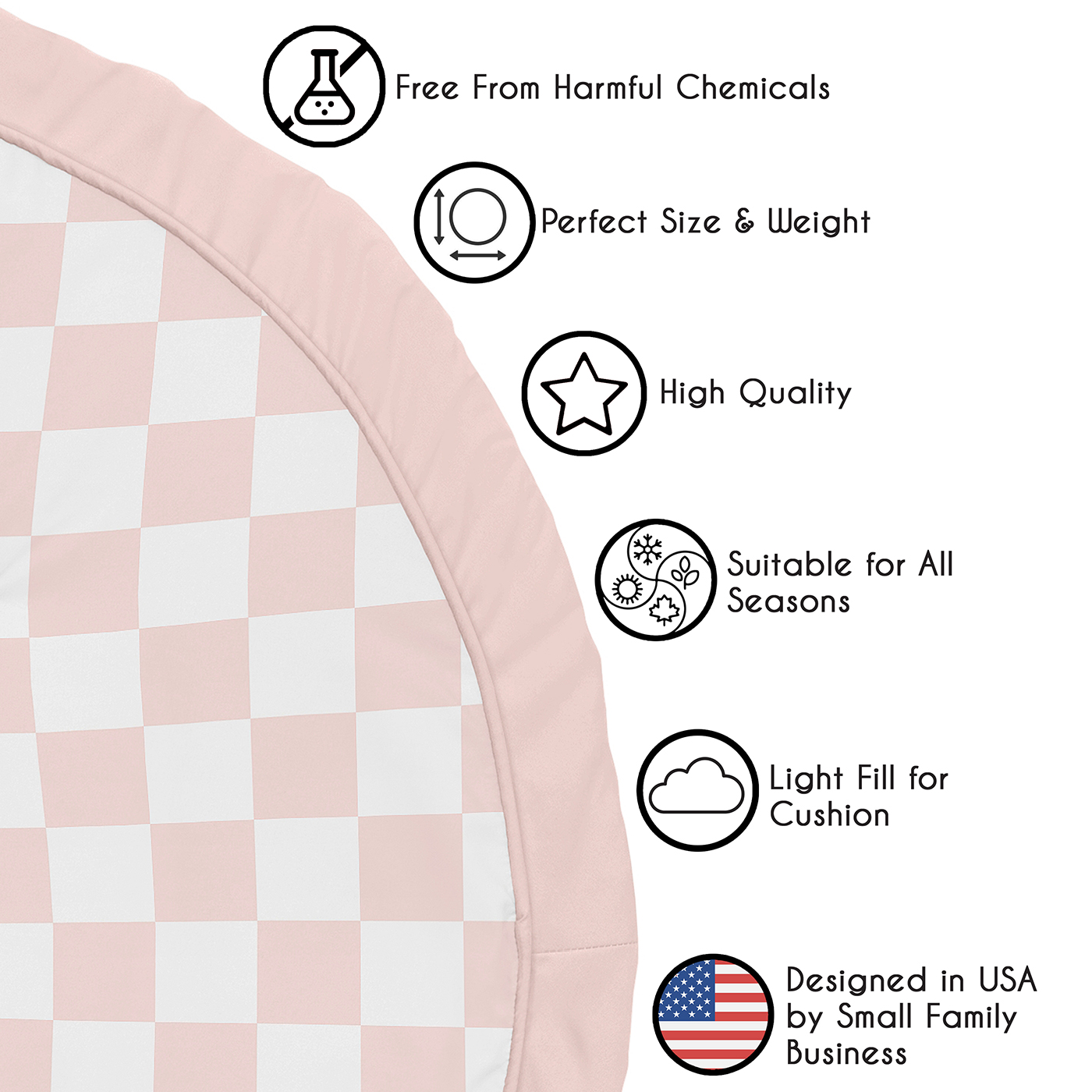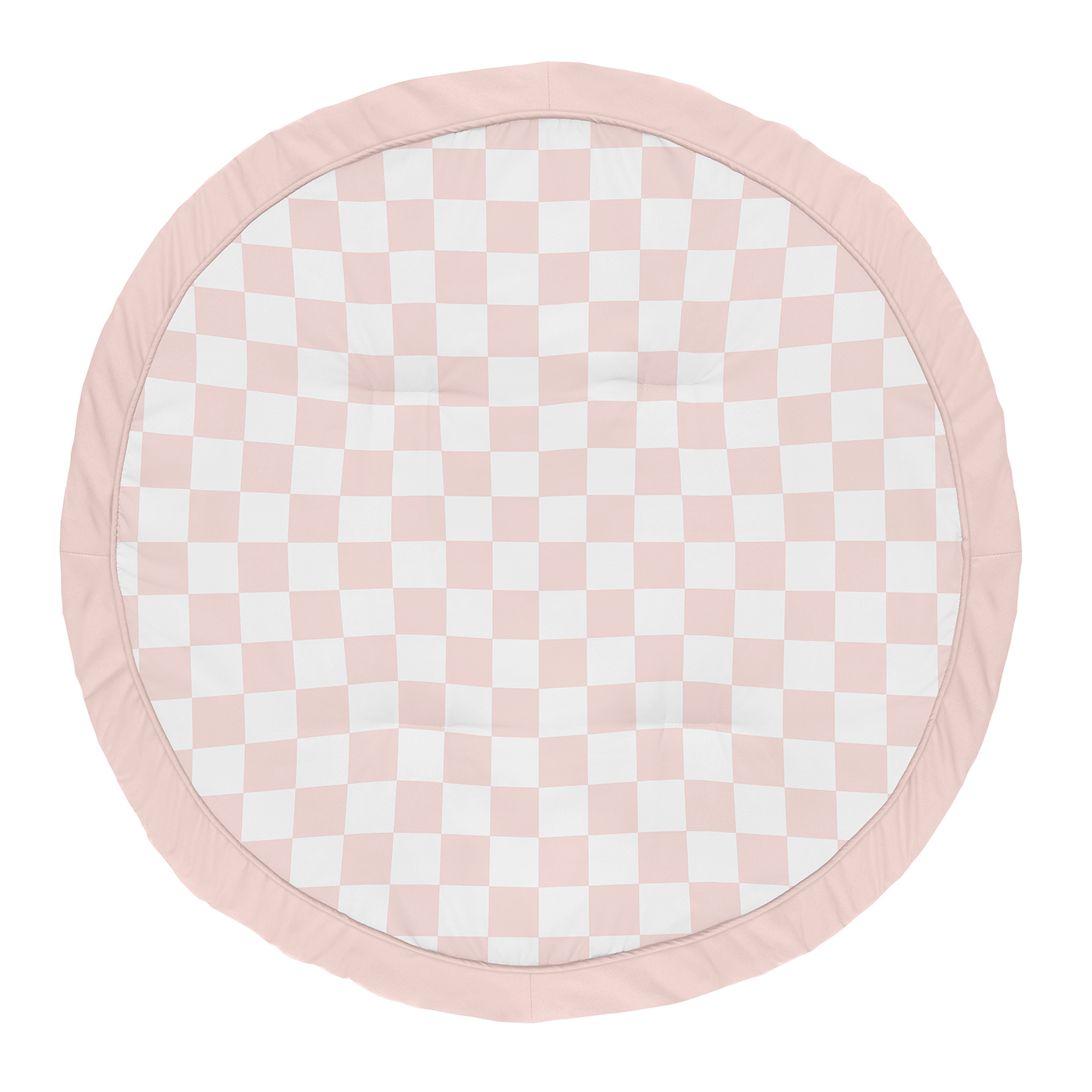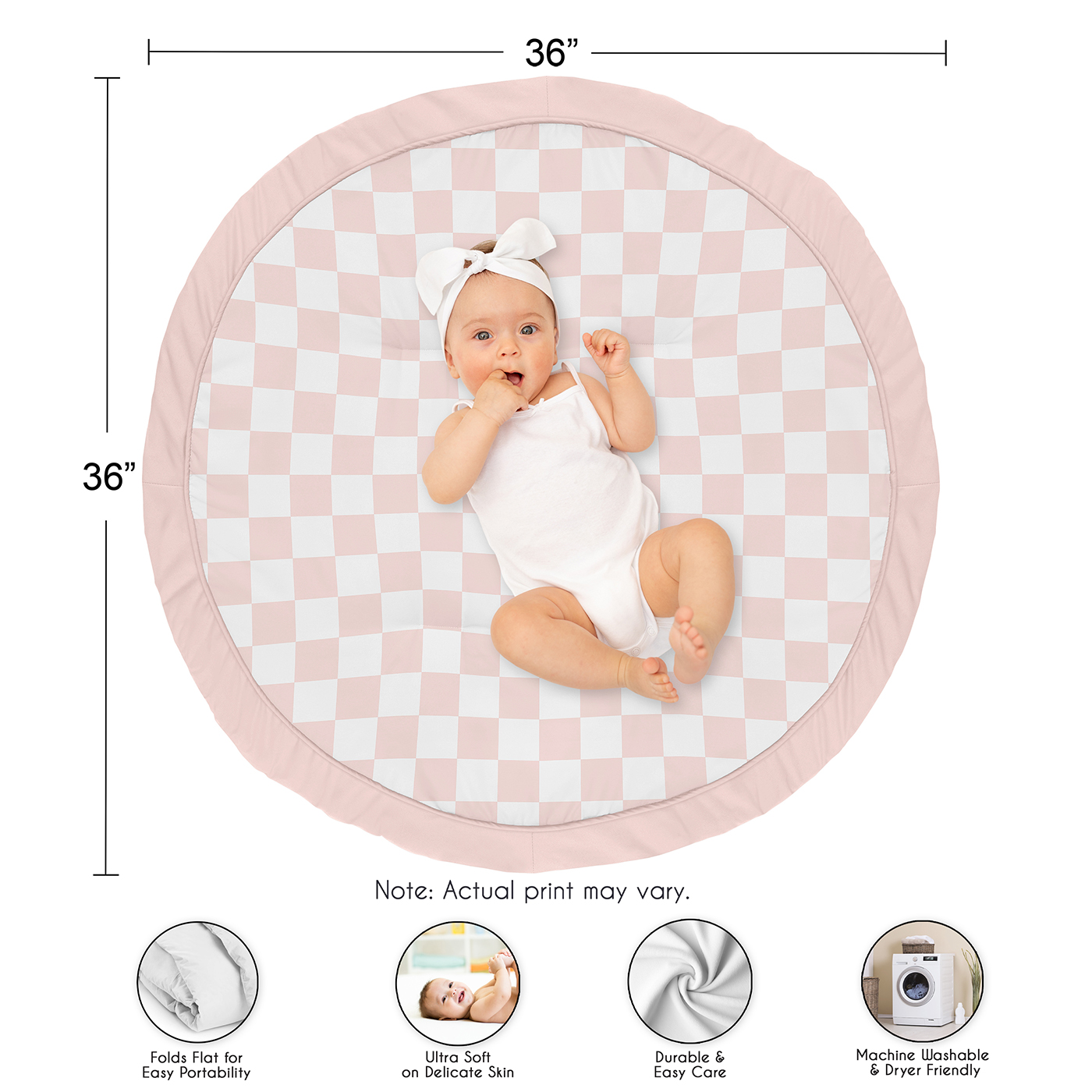 TUMMY TIME MUST HAVES: Baby Play Mat (36in. Round). Designed in the USA with moisture wicking, super soft brushed microfiber fabric. Machine washable, tumble dry low. This classic girls baby playmat would pair perfectly with coordinating bedding sets and match the minimalist Gingham Checkered Plaid Collection accessories to complete your newborn/infants nursery themed look. This lightly padded floor mat is the perfect addition to help the development of crawling and standing for your little one!CHECKERED GINGHAM THEME: This shabby chic baby girls tummy time playmat boasts a vintage, classic white and blush pink retro, minimalistic gingham plaid print and finished with a solid pink piping and border. A round infant floor mat can be used in baby nurseries, play rooms, play pens, playhouse, livingroom, bed room, apartment, play yard, or home office during tummy time to get your new addition comfortable with crawling and getting practice in standing & eventually walking.DESIGNED IN USA TO BE SAFE & DURABLE: As a proud Baby Safety Alliance member who rigorously tests products to meet or exceed CPSC safety standards, Sweet Jojo Designs is dedicated to creating high-quality products that blends style, comfort, and functionality. Our products are crafted with premium materials & details to have your favorite themes come alive and help parents design the perfect space for their little one. Trusted by families worldwide, Sweet Jojo Designs brings your vision to life.PERFECT GIFT: Add a baby tummy time mat for girls to your list of must haves! Include this infant play mat along with a coordinating crib bedding set on your gift registry, in a baby shower gift basket or as a gender reveal present is an easy way to prepare for a baby's arrival. This play mat works with any vintage nursery, bedroom or toddler room & the perfect gift for your little one! This checkered design makes it the perfect addition for the next generation as they experience life.MATCHING DECOR & ACCESORIES: Match your favorite Sweet Jojo Designs home decor & bedding with this girls baby playmat to coordinate perfectly & create a cohesive look & add a personalized touch to your space! Complete any room in your home with our coordinating room decor such as window treatment panels, throw pillows, bedding sets, hampers & more. Include it in your baby shower gift basket, gender reveal presents or your gift registry to complete your Sweet Jojo Designs baby room look.Item# Playmat-Check-PK-WH