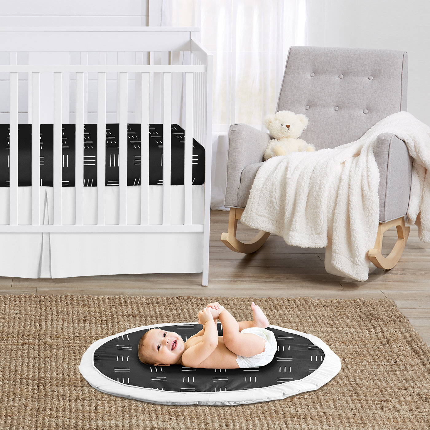 Playmat is designed using a black and white boho mudcloth hatch print and finished with white piping and border - Brushed Microfiber