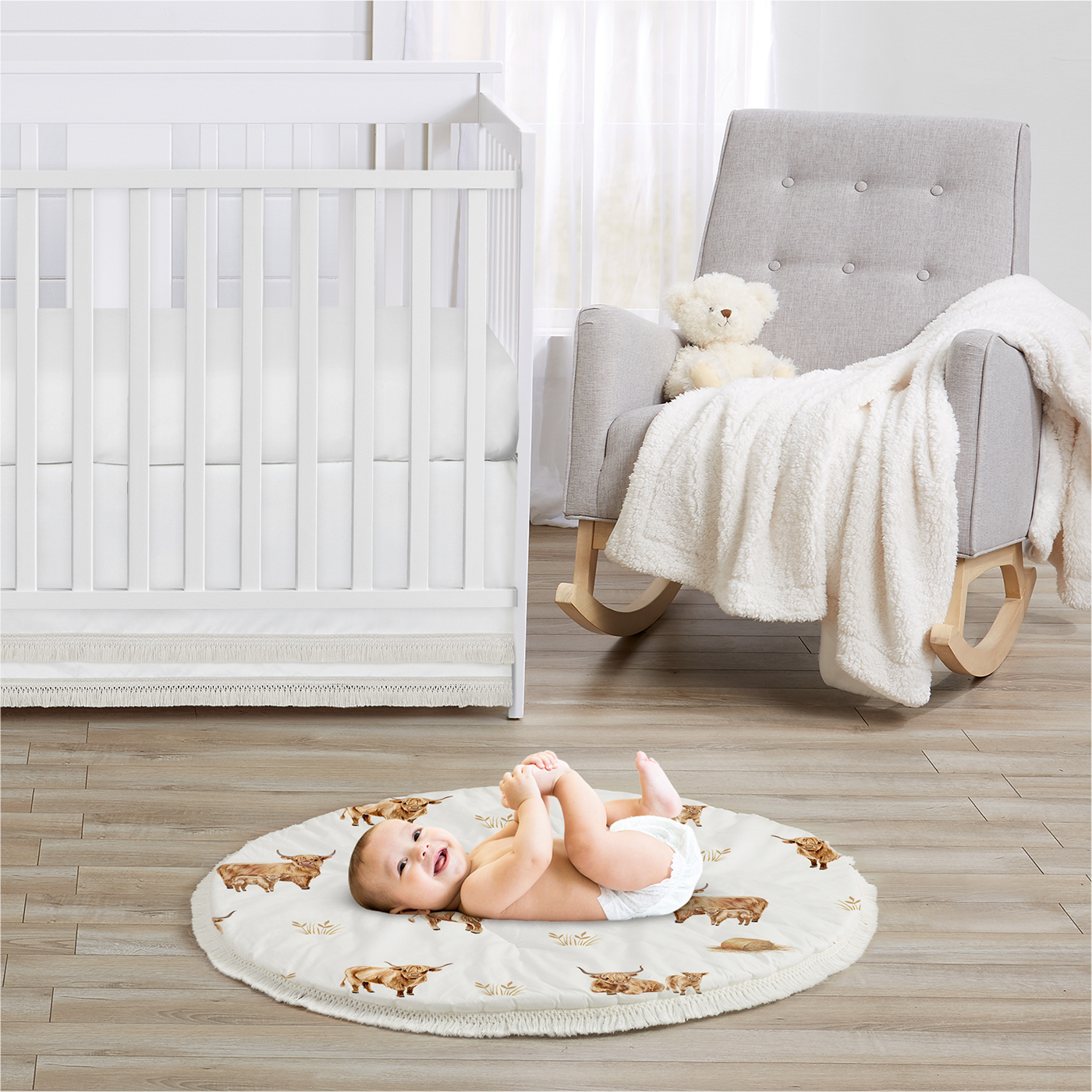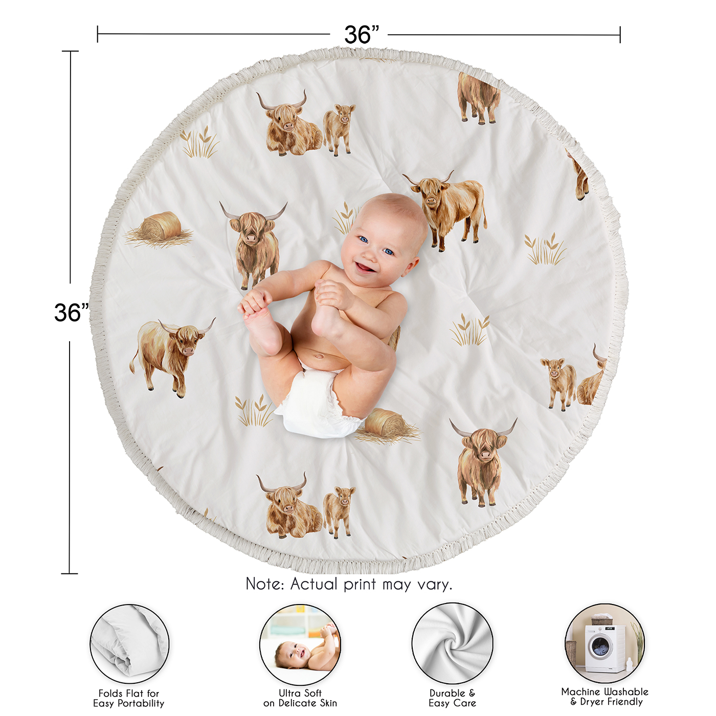 TUMMY TIME MAT MUST HAVES INCLUDES: A Baby Mat for Floor(36in. Round). Designed in the USA with moisture wicking, soft brushed microfiber fabric. Machine washable, tumble dry low. This unisex baby play mat features a brown & taupe western, country animals, cattle ranch, southwestern print & finished with an off white brushed fringe piping & border that pairs perfectly with coordinating Boho Highland Cow Collection bedding sets, decor & accessories to complete the look for your newborn nursery.BABY ESSENTIALS DONE RIGHT: This lightly padded play mat for baby is the perfect addition to help the development of crawling & standing for your little one! A round play mat for babies 0-6 months can be used in baby nurseries, play rooms, play pens, playhouse, livingroom, bed room, apartment, play yard, or home office during tummy time to support physical development & motor skills for babies to build neck, shoulder, back, and arm muscles that will help for rolling over, crawling and walking!DESIGNED IN USA TO BE SAFE & DURABLE: As a proud Baby Safety Alliance member who rigorously tests products to meet or exceed CPSC safety standards, Sweet Jojo Designs is dedicated to creating high-quality products that blends style, comfort, and functionality. Our products are crafted with premium materials & details to have your favorite themes come alive and help parents design the perfect space for their little one. Trusted by families worldwide, Sweet Jojo Designs brings your vision to life.PERFECT GIFT: Add baby play mats for floor to your list of baby registry must haves! Include this infant play mat along with a coordinating crib bedding set on your gift registry, in a baby shower gift basket or as a gender reveal present is an easy way to prepare for a baby's arrival. This baby floor play mat works with any nursery, bedroom or toddler room. This foldable play mat design makes it the perfect tummy time addition for on-the-go so development and fun doesn't stop at travel!MATCHING DECOR & ACCESORIES: Match your favorite Sweet Jojo Designs home decor & bedding with this baby activity mat to create a cohesive look & add a personalized touch to your space! Complete any baby nursery or room in your home with our coordinating room accessories such as sheet sets, window treatment panels, throw pillows, bedding sets, hampers & more. Include it in your baby shower gift basket, gender reveal present or your gift registry to complete your Sweet Jojo Designs baby room look!Item# Playmat-HighlandCow