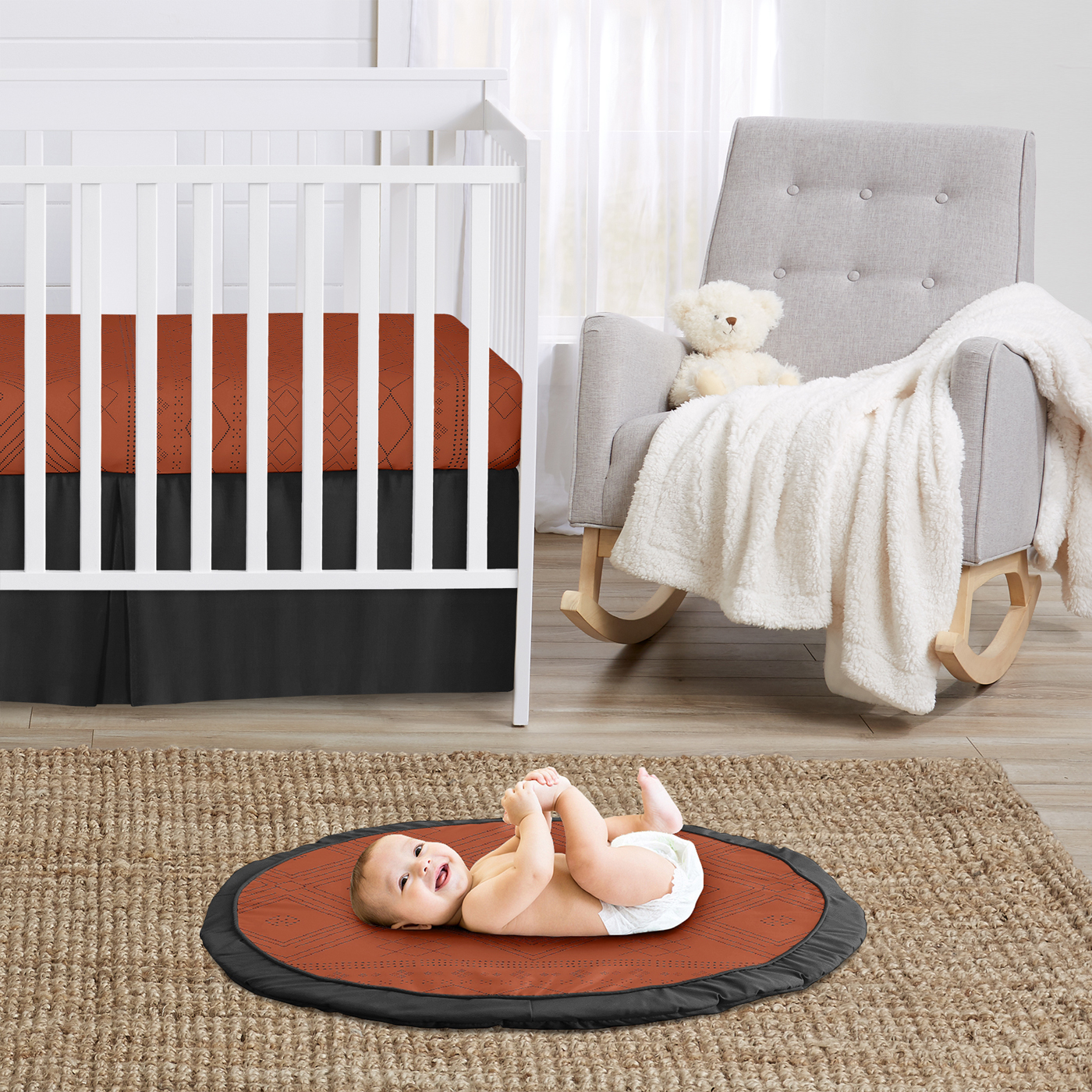 Playmat is designed using a rust orange and black tribal boho geometric print and finished with black piping and border - Brushed Microfiber