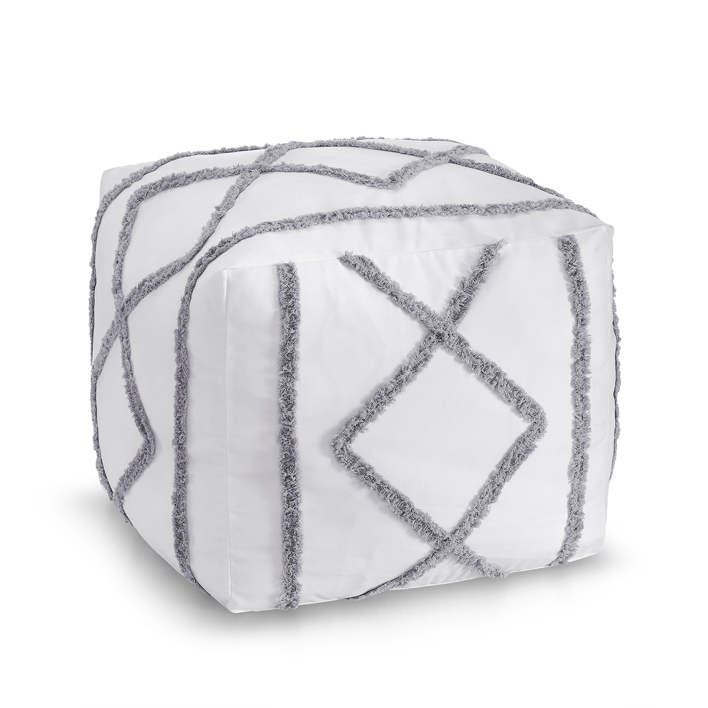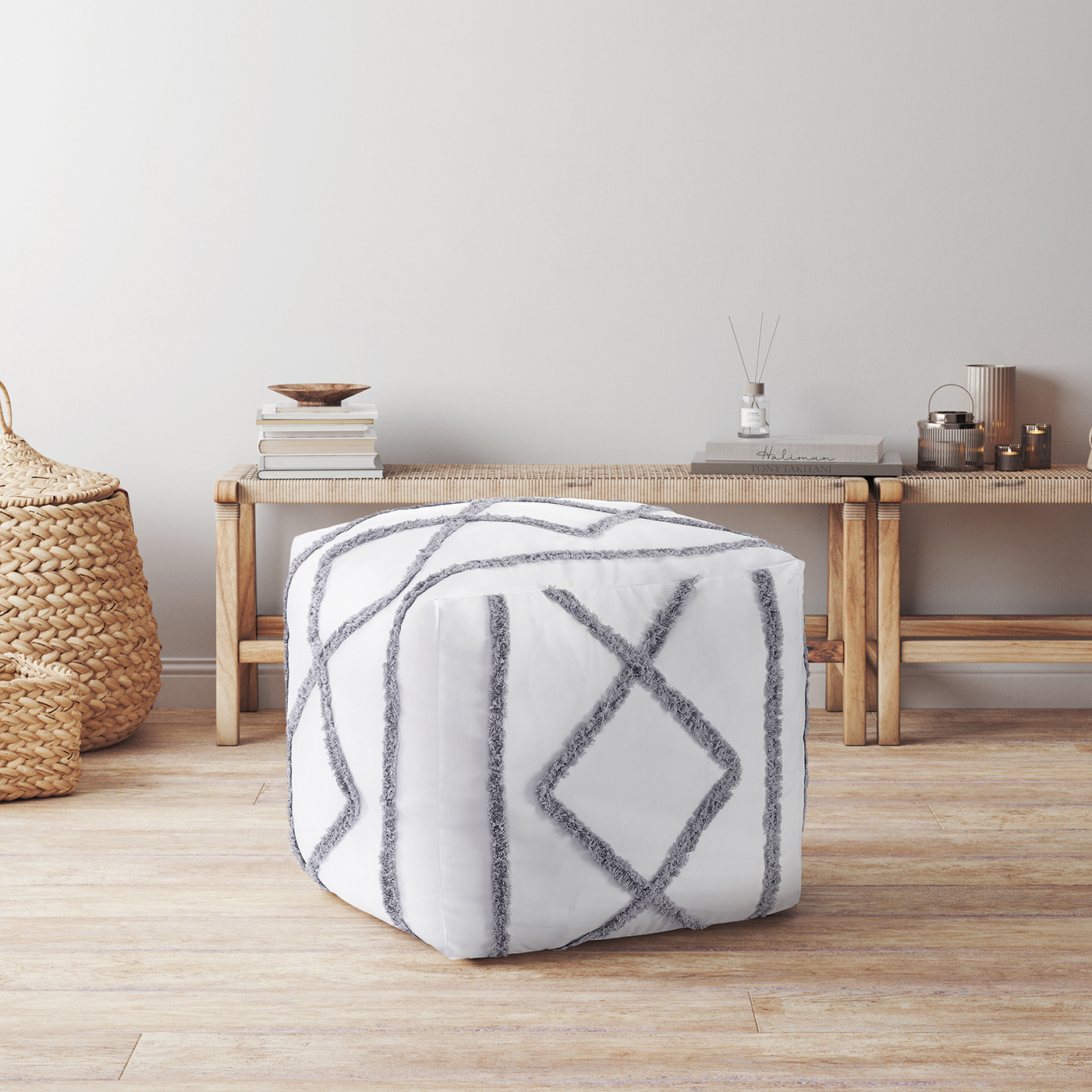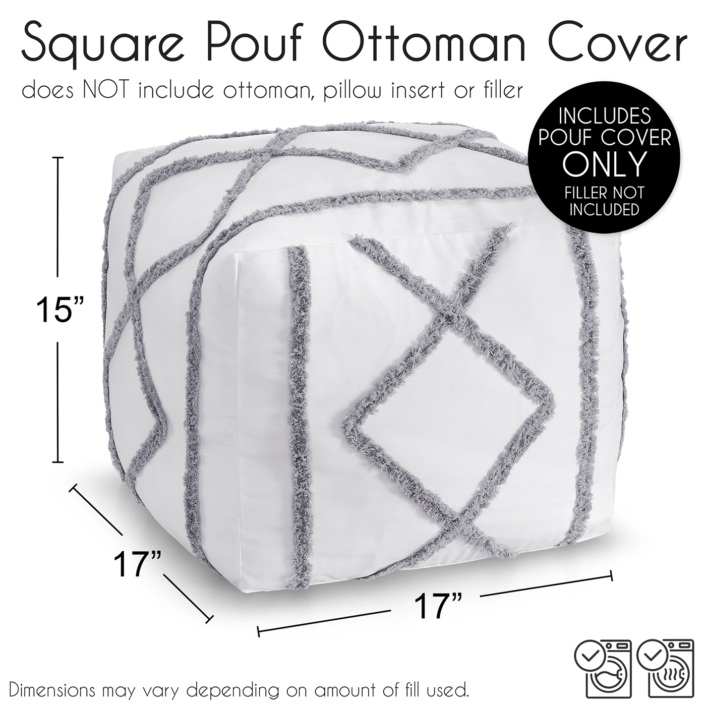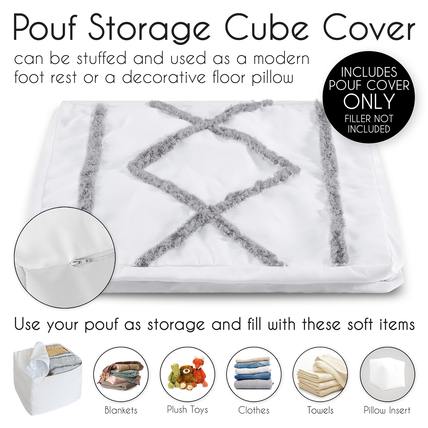 Design: Bohemian bright white canvas fabric with grey boho chic minimalist tufted geometric fringe accents. These poufs are the perfect way to bring a little bit of minimalistic charm to your homeDimensions: includes (1) 17 in. x 15 in. x 17 in. 100% Woven Canvas Stuffable Pouf CoverMaterials and Care: OTTOMAN POOF CASE ONLY – STUFFING/INSERT/FILLER NOT INCLUDED. 100% Polyester Canvas Material- Extremely durable and wrinkle resistant yet soft and comfortable. Machine washable. Tumble dry low.Features: Our modern unstuffed pouf covers can be used as storage, footrests, or a stylish accent to any room. These unstuffed pouf covers are made to fit most standard cube ottomans. All our pouf covers feature a hidden zipper to make it easy to take on and off. Cube ottoman covers make storage easy and can now be part of your room decor. Place blankets, plush toys, clothes, towels or even pillow inserts into the decorative pouf and turn it into a comfortable foot stool or chairMatching Accessories: We offer coordinating bedding sets, decorative throw pillows, shower curtains, window panels, pouf covers, bed skirts, body pillows and more. Please check our store for these accessories.Item# Pouf-Geo-WH-GY