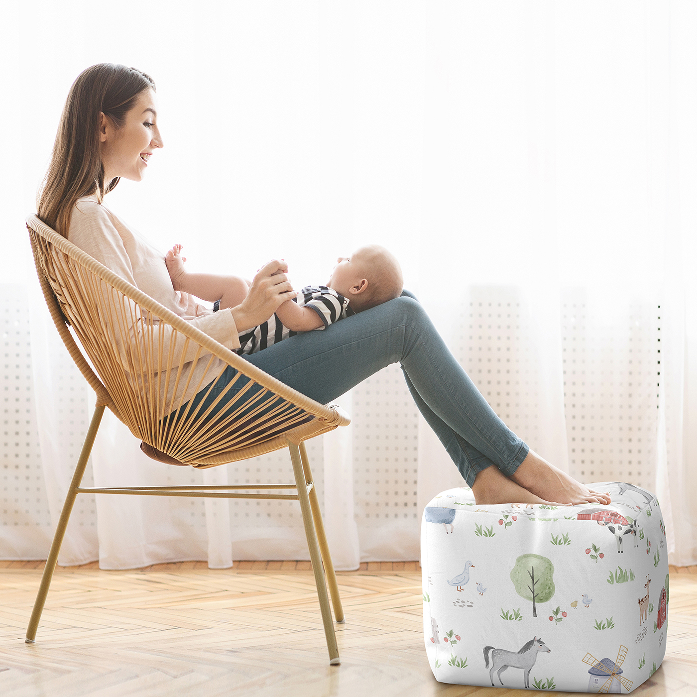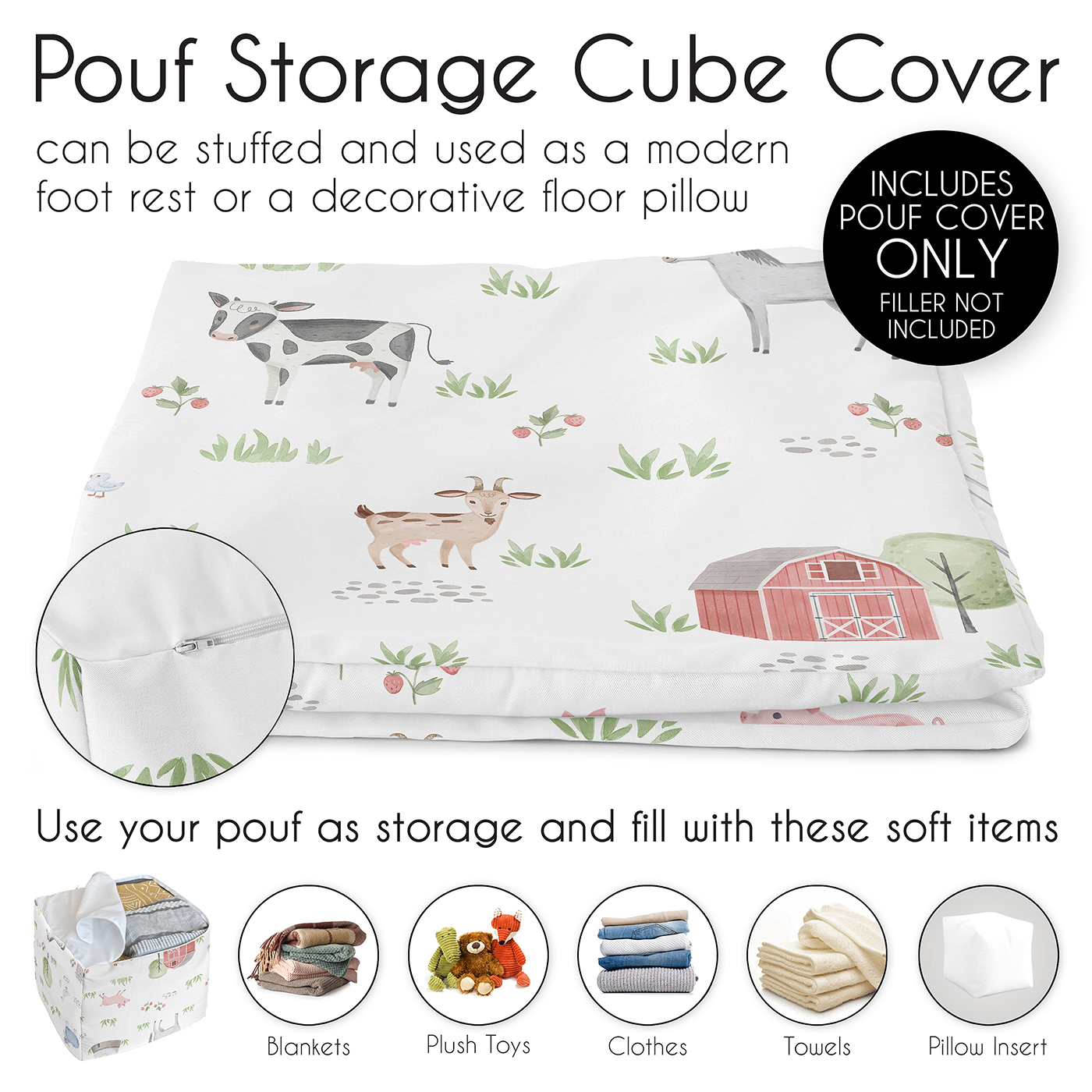 Filled Pouf covers can be used as additional kid friendly seating or foot rests wherever you need it: livingroom, bed room, playroom, nursery, family room, guest room, office, library, classroom, home theater, gaming room, sunroom, attic and basement. They make the perfect gift to coordinate with Sweet Jojo Designs nursery and kids bedding, crib sheets, changing pad covers, nursing pillow covers, play mats, storage bins, window treatments, wall decor and accessories. Item# Pouf-OnTheFarm-PRT