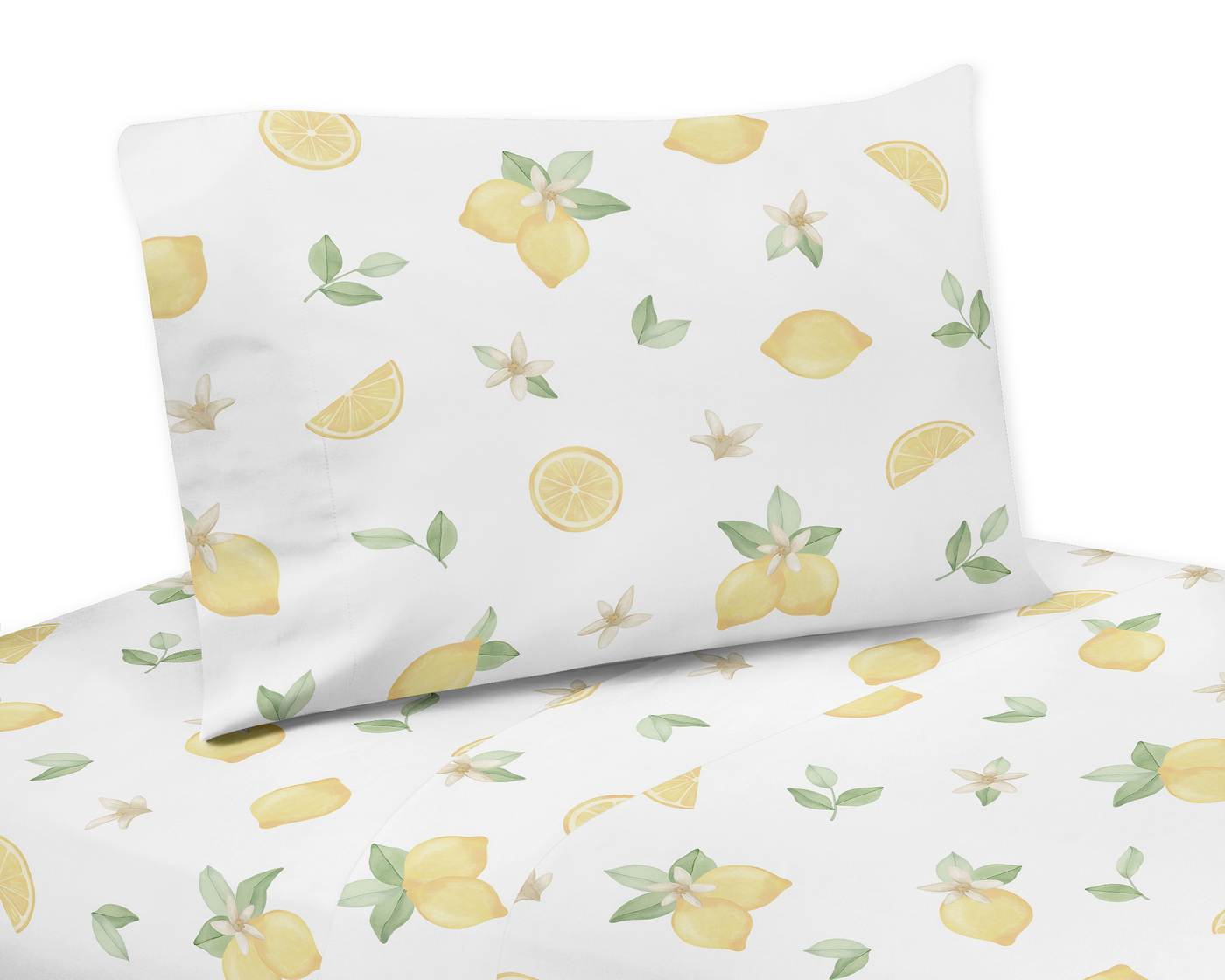Sweet Jojo Designs Lemon Collection 4pc Queen Sheet set is made to coordinate with their Queen Bedding Sets. These sheets use the yellow, green, beige and white lemon floral print brushed microfiber fabric. This sheet set is machine washable for easy care.