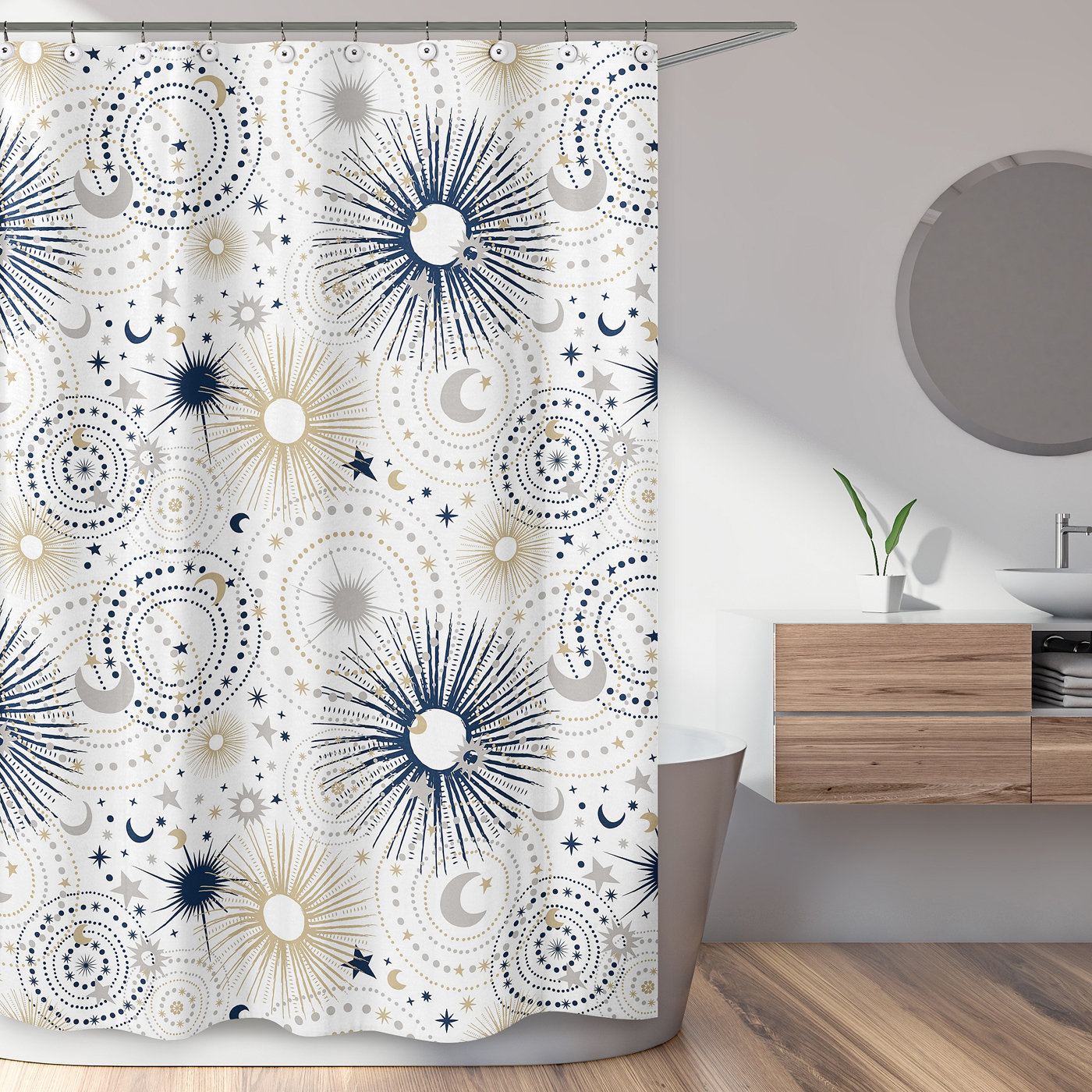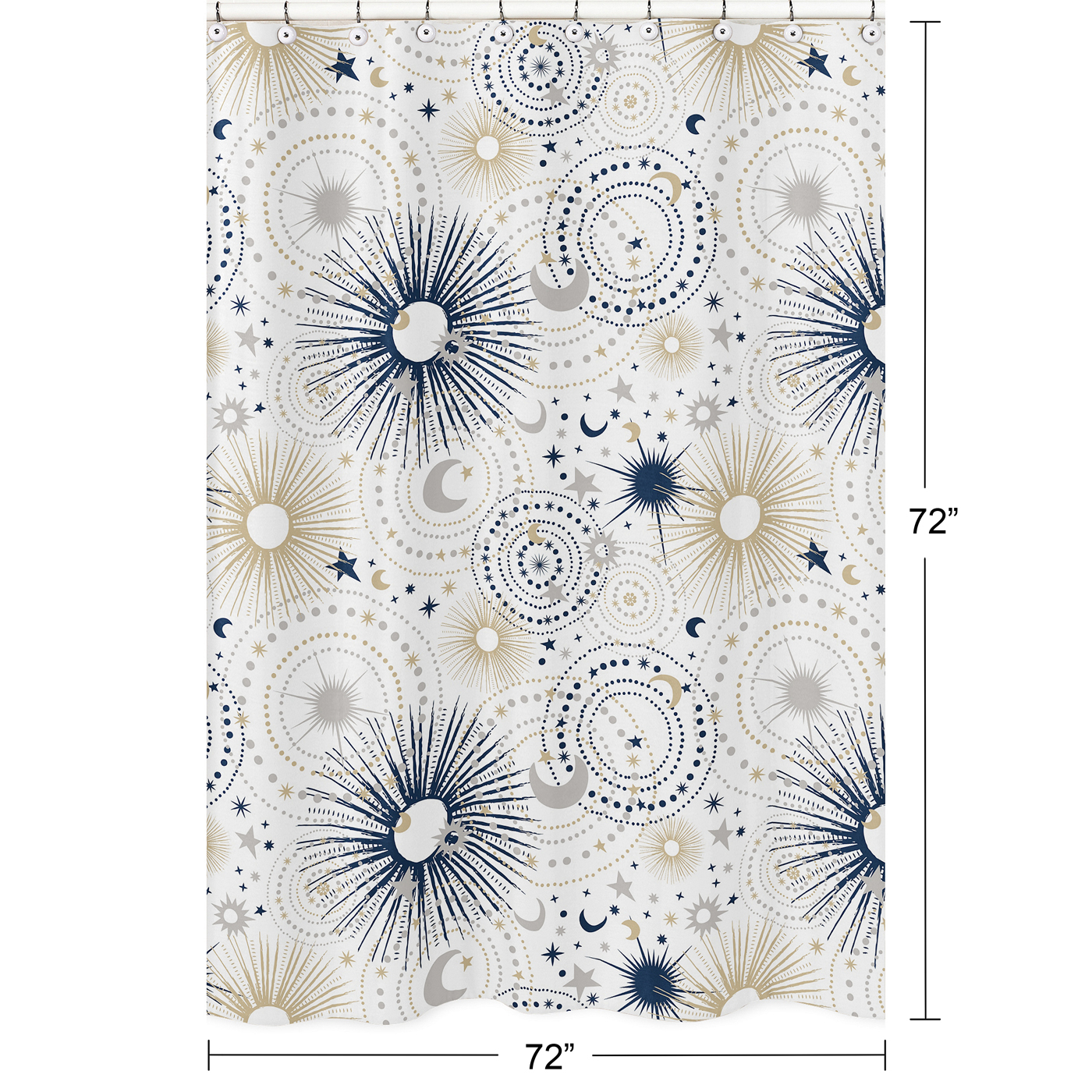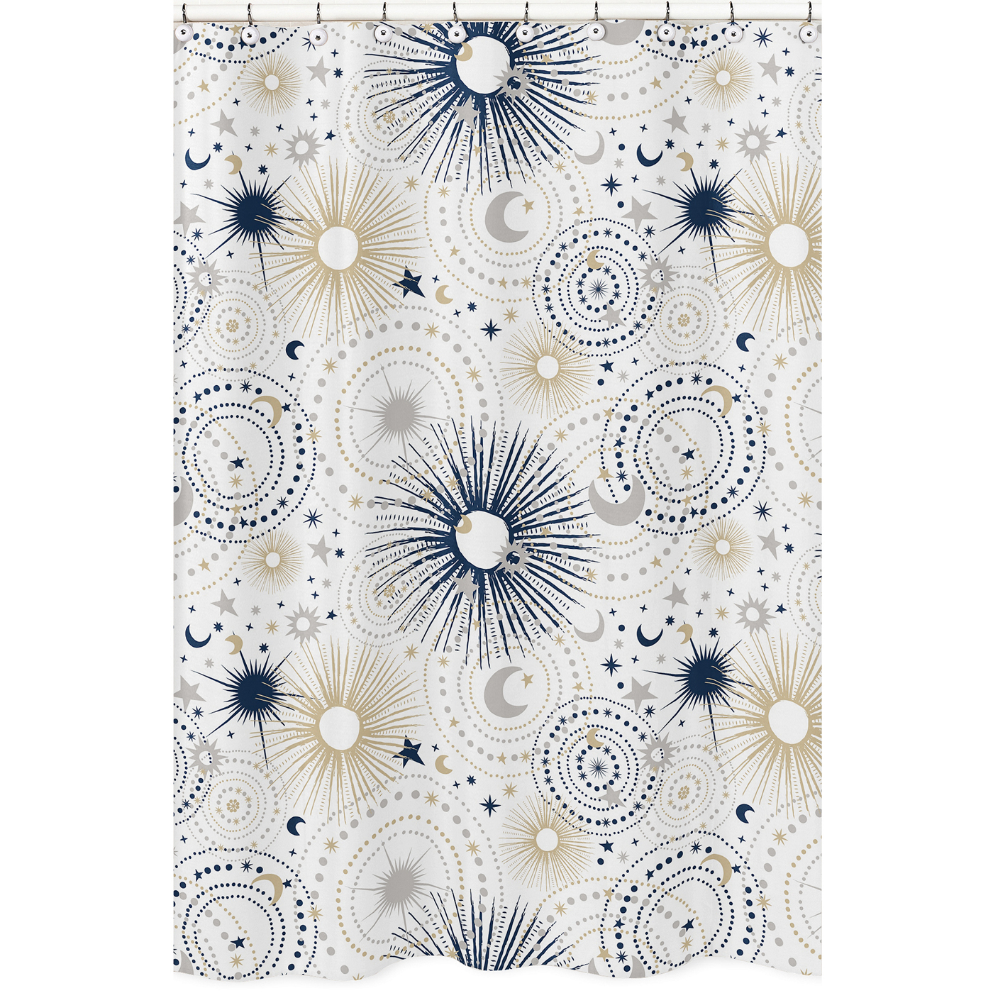 This design has matching accessories such as window treatments, hampers, bed skirts and pillowsItem# ShowerCurtain-Celestial-BU
