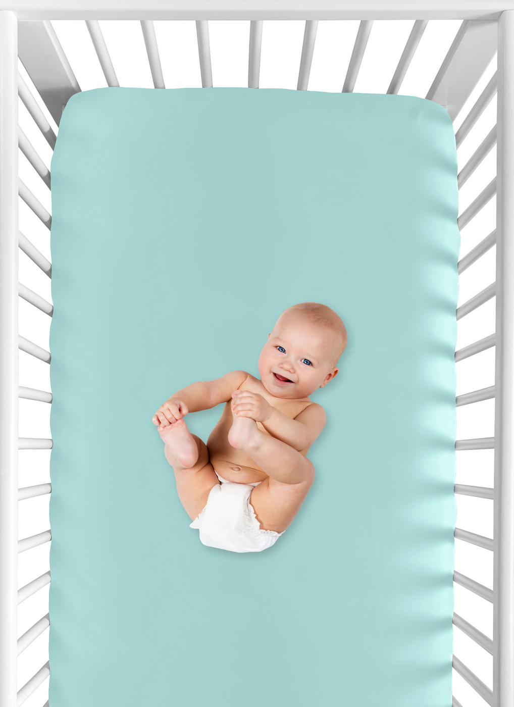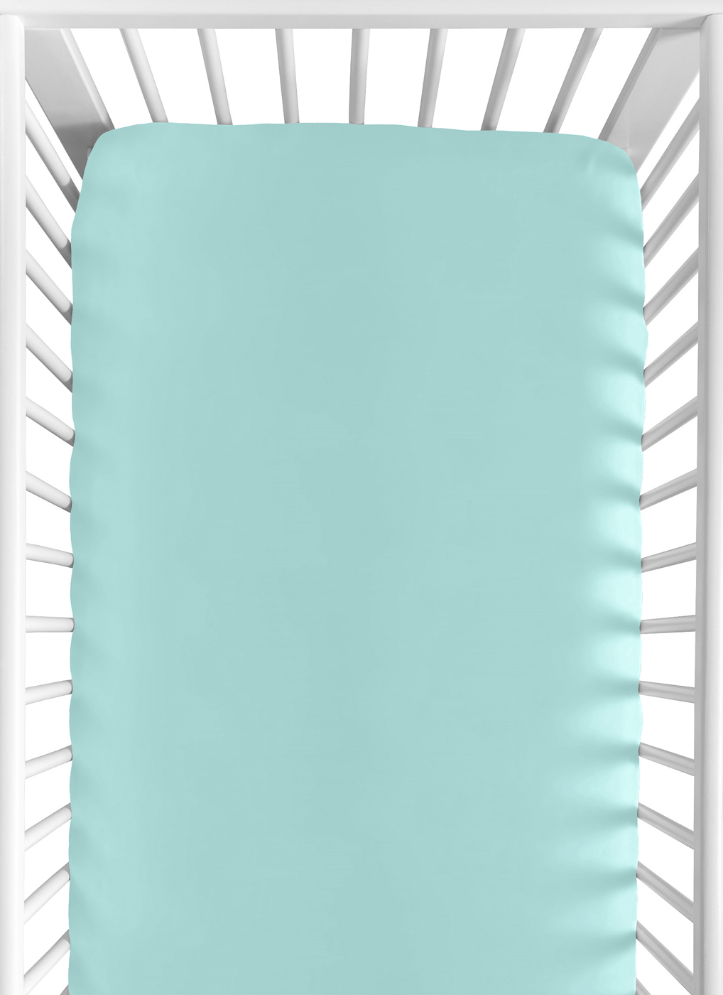 Skylar fitted crib sheets will help complete the look of your Sweet Jojo Designs nursery. This solid turquoise cotton sheet fits all standard crib and toddler mattresses and is machine washable for easy care. Dimensions: 52 in x 28 in x 8 in.