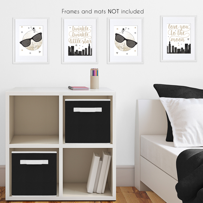 • Decorative wall art print set features a city skyline, a watercolor moon and stars with inspirational "Twinkle Twinkle Little Star" and "Love You To The Moon" quotes.