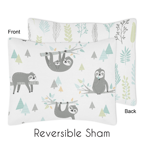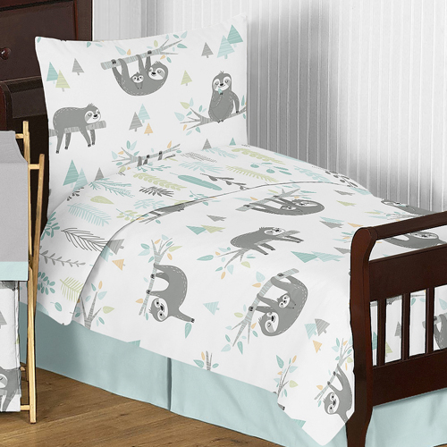 Aqua and Grey Sloth Toddler Bedding set will help you create an incredible room for your child. This girl bedding set features a charming aqua and grey sloth print and a leafy botanical print, accented with solid fabrics. This collection uses the stylish colors of aqua, grey, lime green, and white. The design uses brushed microfiber fabrics that are machine washable for easy care. This wonderful set will fit most standard cribs and toddler beds.