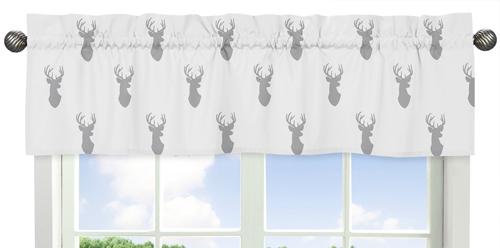 Grey and White Stag Window Valances will help complete the look of your Sweet Jojo Designs room. This valance softens the look of the window and obscures pulled up blinds. It will coordinate nicely with your Sweet Jojo Designs bedding or can be used as an accent with your own room design.