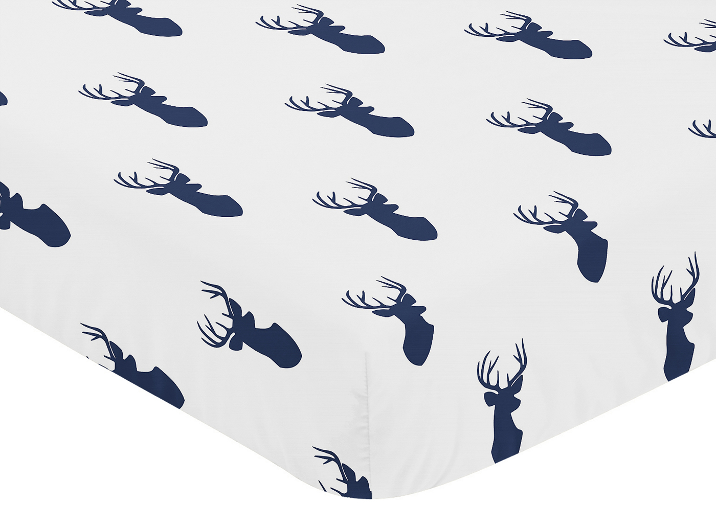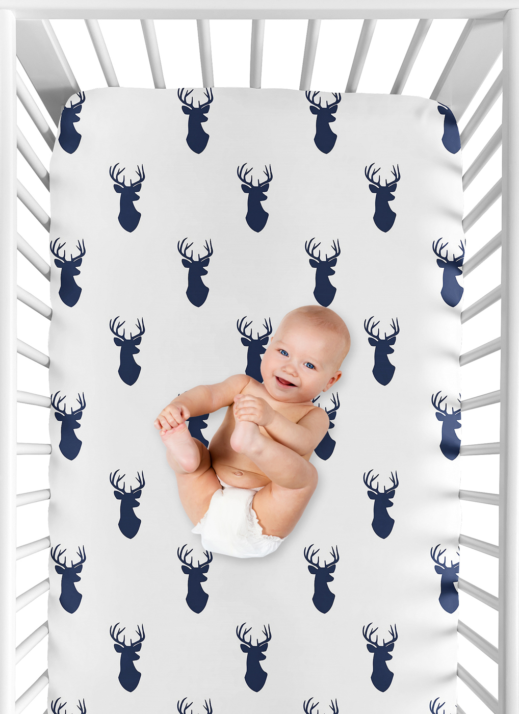 Navy and White Stag fitted crib sheets will help complete the look of your Sweet Jojo Designs nursery. This navy blue and white stag print brushed microfiber sheet fits all standard crib and toddler mattresses and is machine washable for easy care.