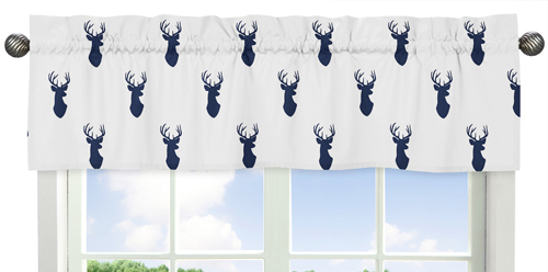 Navy and White Stag Window Valances will help complete the look of your Sweet Jojo Designs room. This valance softens the look of the window and obscures pulled up blinds. It will coordinate nicely with your Sweet Jojo Designs bedding or can be used as an accent with your own room design.
