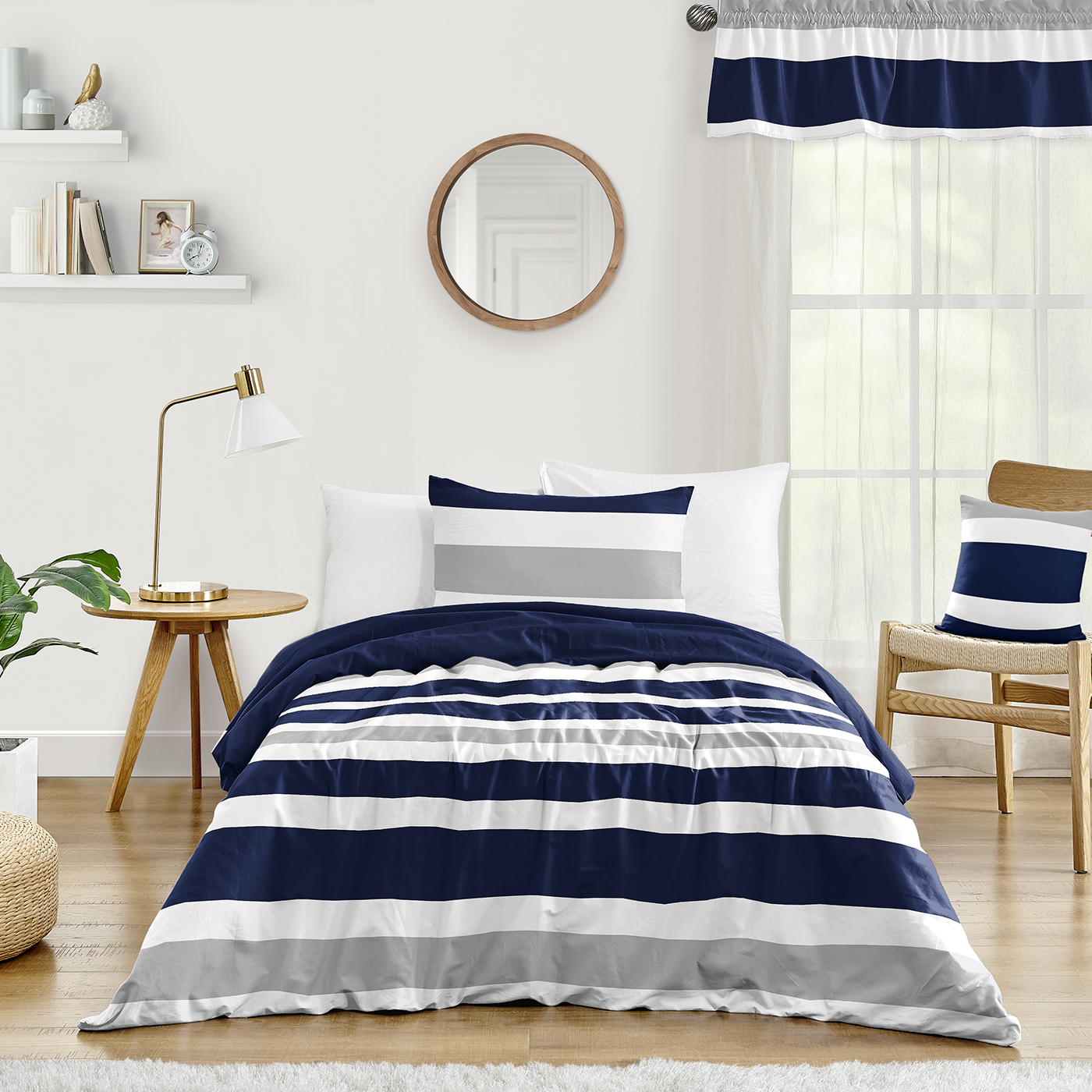 2PC TWIN DUVET COVER SET INCLUDES: Lightweight Duvet Cover (66in. x 90in.) & Standard Sham (20in. x 26in.). COMFORTER INSERT NOT INCLUDED. Easy machine washable and dryable on low. This modern twin size duvet cover set for boys dorm is made with super soft, moisture wicking brushed microfiber fabric & features the bold color palette of navy blue, grey & white that brings together a nautical, casual contemporary, or minimalist look. The simple pattern compliments a wide range of design themes.CLASSIC STRIPES THEME: This twin size duvet cover set boasts a soft duvet cover & a pillow case sham. The comforter cover features a modern, geometric minimalism bold color blocking striped lines print and reverses to navy blue. This twin duvet set has a matching pillow sham with the same print that effortlessly makes them a standout addition to any kids bedroom decor. If you're looking for a minimalist aesthetic for your room makeover, this duvet cover set twin size is the perfect focal point.DESIGNED IN THE USA: By a small, women owned business that understands the need for comfort, practicality, & style. Made with premium materials to create comfortable bedding for you or your loved ones, our duvet covers are low maintenance. Simply remove from your filled comforter or blanket insert & put in the washer to clean as easily as you would bed sheets. Duvets eliminate the need to worry about the fill in a comforter shifting or clumping in the wash or your comforter taking forever to dryMATCHING DECOR & ACCESORIES: Purchasing a duvet set twin from Sweet Jojo Designs offers many benefits. If you have a room to decorate, we have endless options to help. An interior design theme can be planned around a bedding duvet comforter set, creating a cohesive space without mixing & matching. Sweet Jojo Designs adds a personalized touch to your space with a wide variety of coordinating room decor such as window treatments, wall decor, sheet sets, shower curtains, memo boards & more.PERFECT GIFT: A twin bed duvet cover set that includes a bedding duvet cover & shams offers convenience and savings & should be #1 on your bedroom makeover essentials necessities list! Duvet cover set twin make a unique and thoughtful birthday gift, graduation present, college dorm care package, house warming gifts, or Easter basket stuffers for kids, teens, and adults. This practical gift idea provides comfort & warmth through the all seasons comforter & pillow protection through pillow shams.Item# Stripe-NV-GY-Duvet-Twin-2