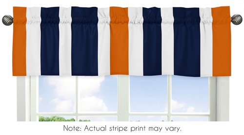 Navy Blue and Orange Stripe Window Valances will help complete the look of your Sweet Jojo Designs room. This valance softens the look of the window and obscures pulled up blinds. It will coordinate nicely with your Sweet Jojo Designs bedding or can be used as an accent with your own room design.