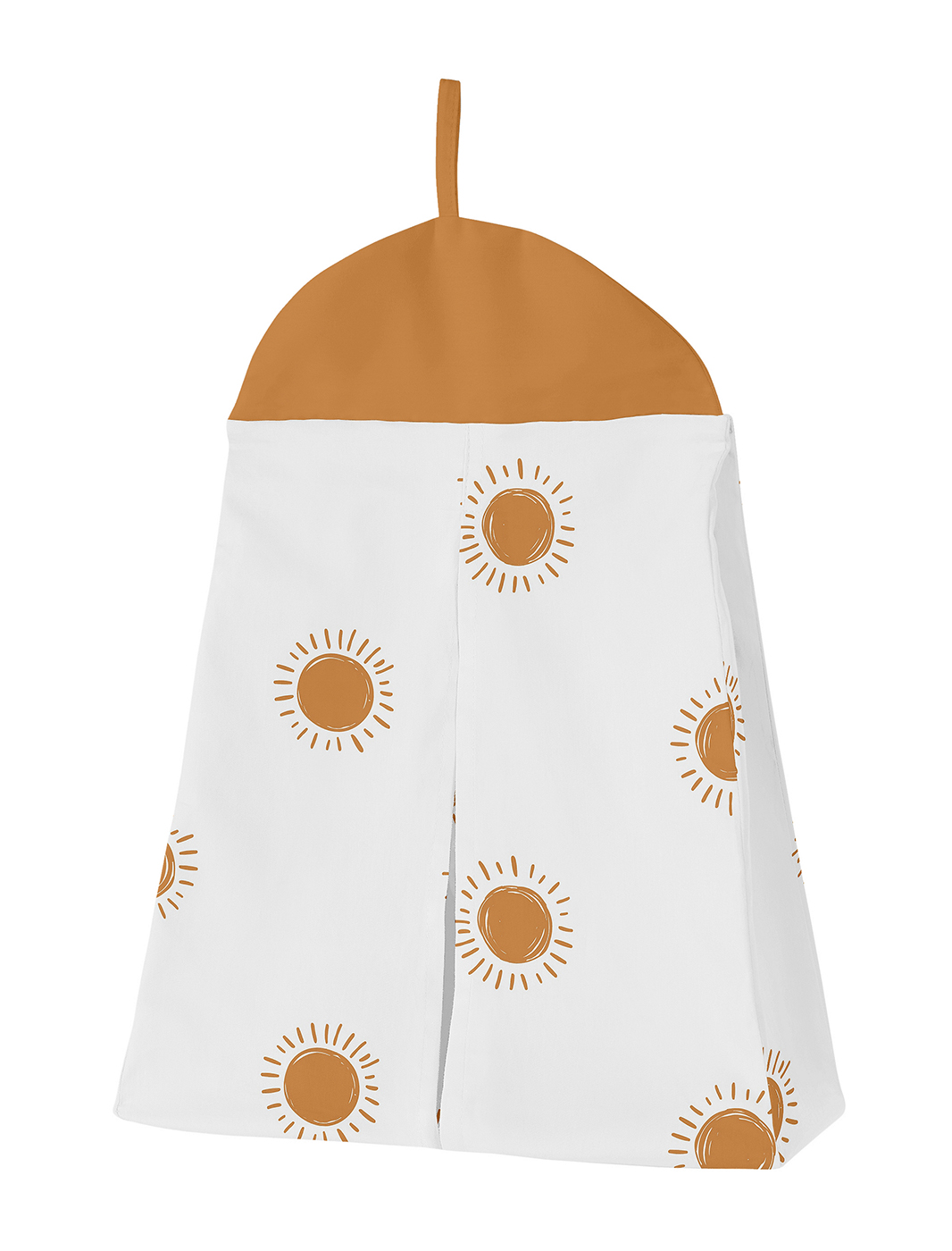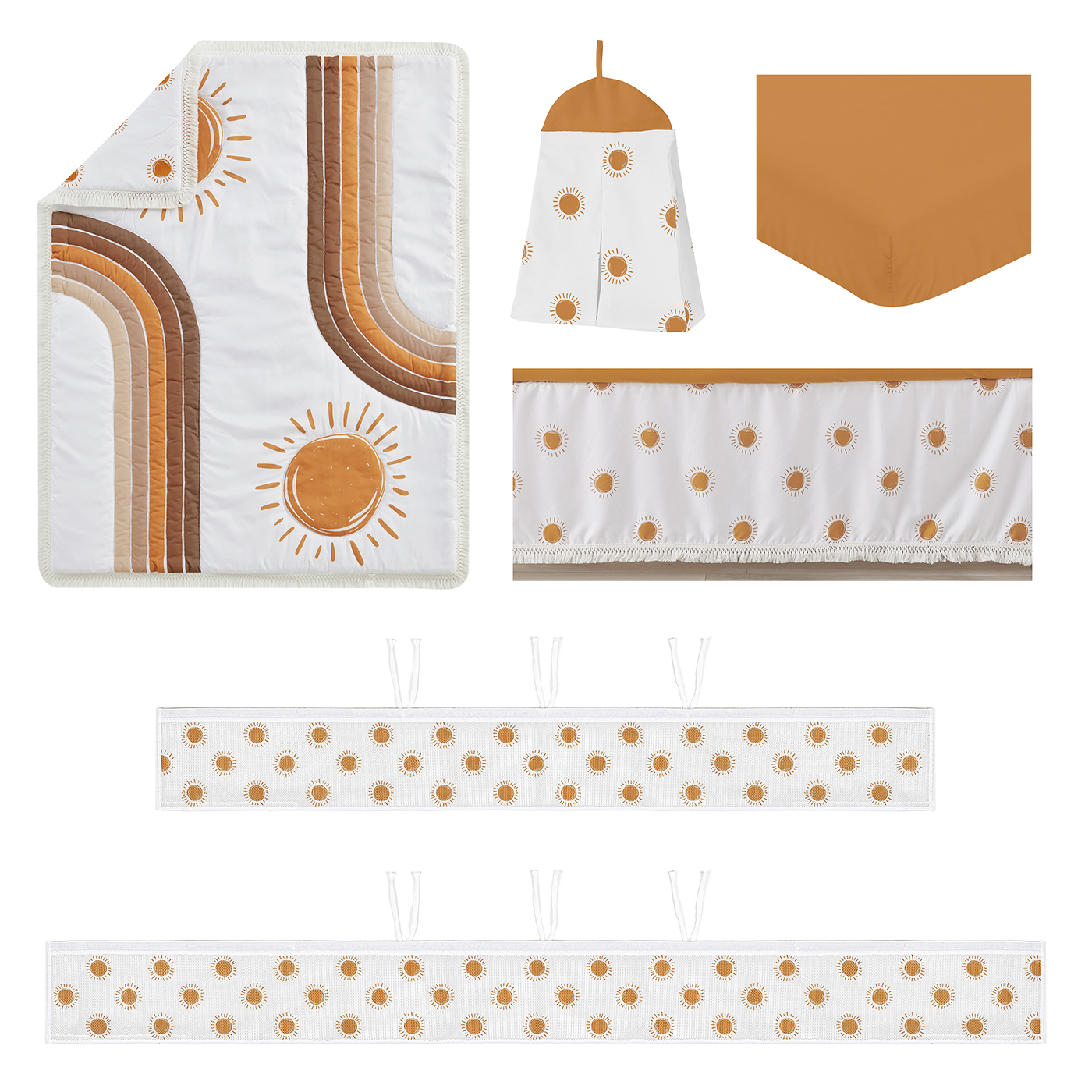 6 Piece Set Includes: Baby blanket, fitted sheet, crib skirt, BreathableBaby mesh crib liner (2 piece set) and diaper stacker Dimensions: Crib Blanket: 45 in. x 36 in., Fitted Crib Sheet: 52 in. x 28 in. x 8 in. pocket, Crib Skirt: 52 in. x 28 in. x 15 in. Drop, Diaper stacker: 15 in. x 20 in. x 6 in., Long Panel Mesh Liner: 11in. x 111in. and Short Panel Mesh Liner: 11in. x 82in. This set boasts a rust pumpkin orange, tan, beige, taupe, brown and white vintage boho bohemian sky desert sunshine outdoors nature minimalist retro sun with solid fabrics and accented with brush fringe macrame details. The crib bedding set is made of brushed microfiber and cotton fabrics and is machine washable; tumble dry low. The BreathableBaby mesh crib liner baby nursery is made of 100% polyester and is machine washable. Wash separately. Machine wash warm gentle cycle. Only non-chlorine bleach when needed. Tumble dry low. Sweet Jojo Designs offers matching accessories such as crib sheets, changing pads, wall decor, window treatments, storage solutions, and much more. This design is also available in crib, toddler, twin, and queen bedding sets. Item# Sun-WH-PM-Crib-6