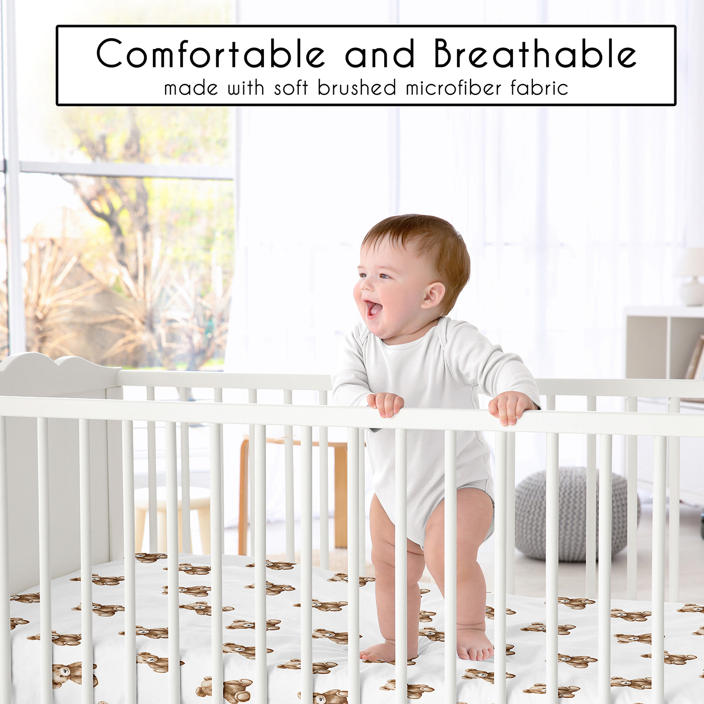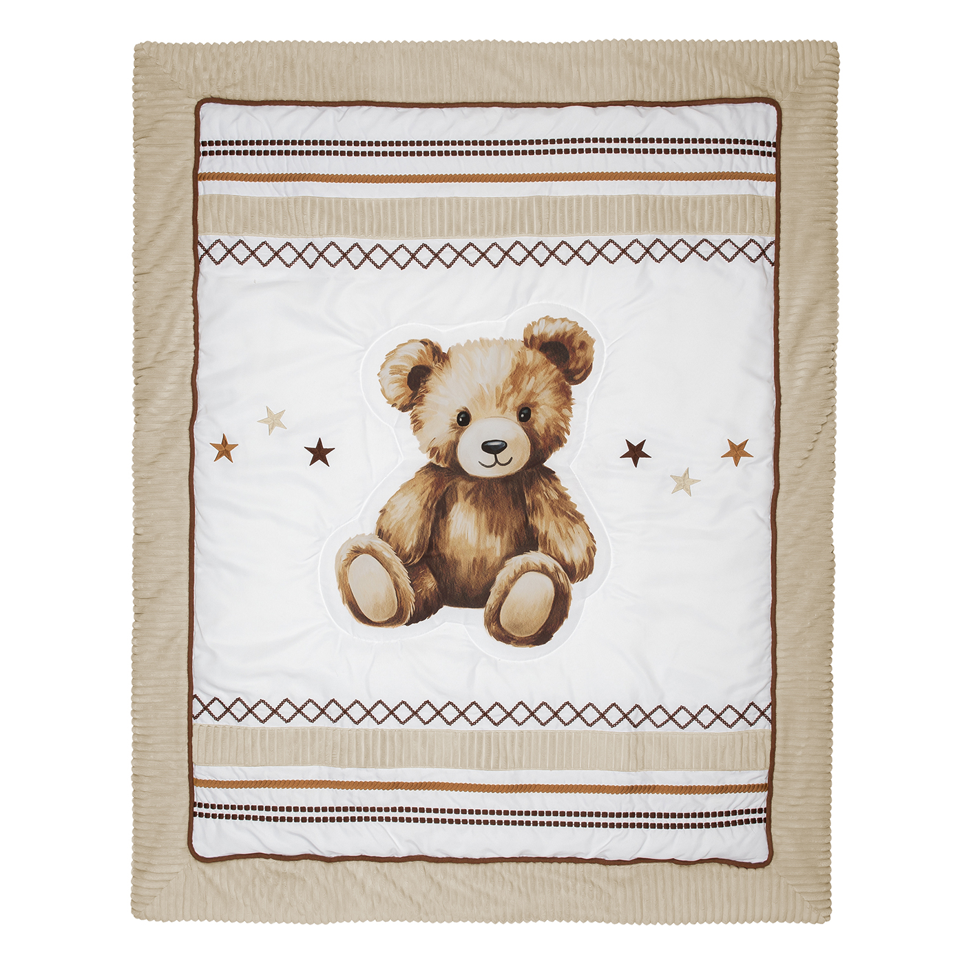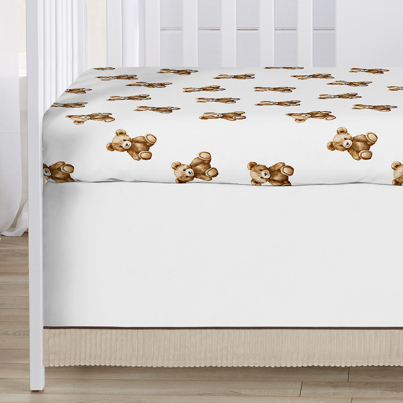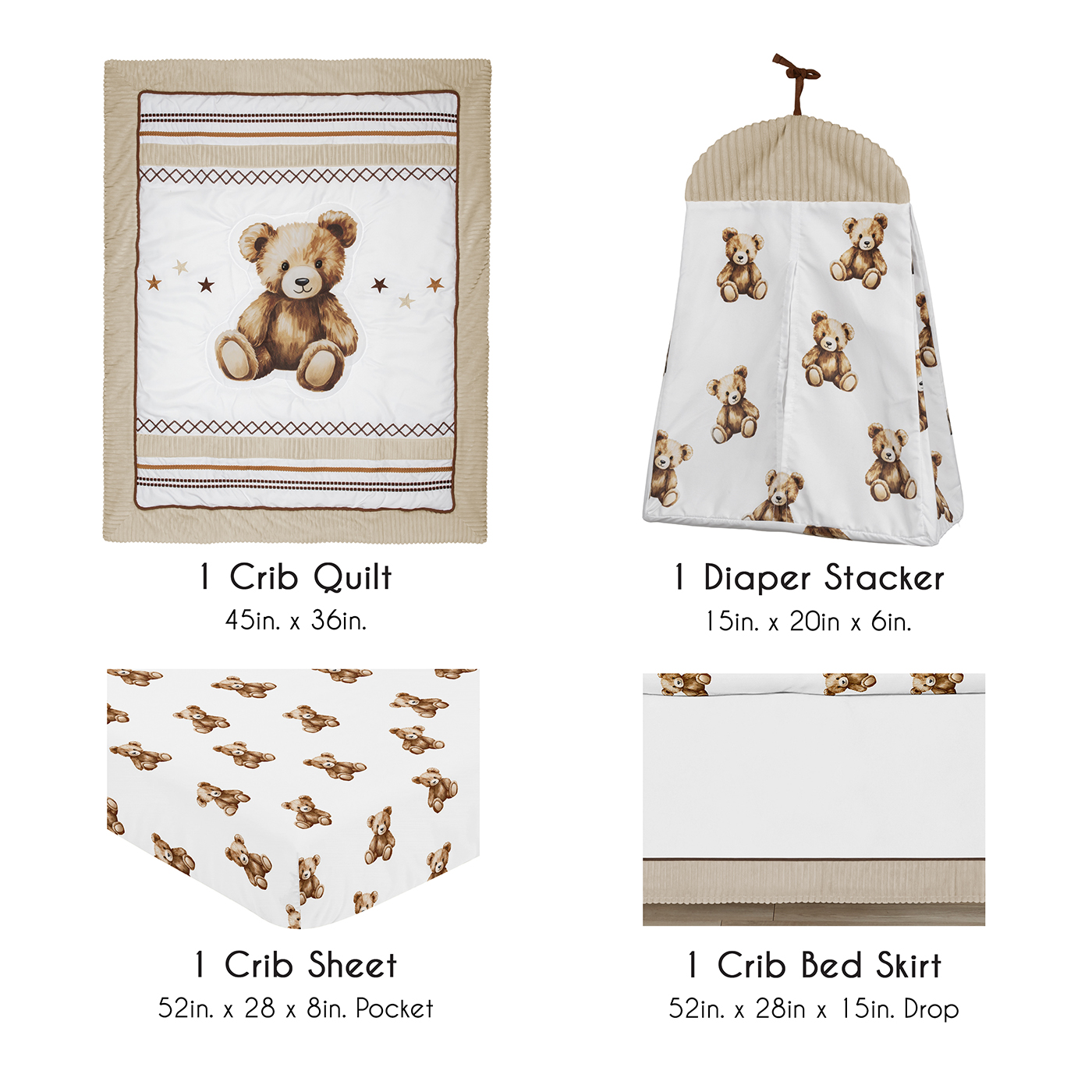 4 PIECE CRIB BEDDING SET INCLUDES: Crib Comforter (45in. x 36in.), Fitted Crib Sheet (52in. x 28in. x 8in. Pocket), Crib Skirt (52in. x 28in. x 15in. Drop) & Diaper stacker (15in. x 20in. x 6in.). An infant crib set including all the baby essentials is a great value compared to purchasing pieces separately. This baby crib set is made of soft microfiber fabric & features neutral brown, taupe & black to bring your traditional, bohemian, rustic, minimal stars & cozy teddy bear baby room together.VINTAGE TEDDY BEAR THEME: This unisex baby crib bedding set boasts a hand painted, classic embroidered teddy bear with a decorative taupe chenille border & rustic stripes with delicate stars. The white skirt is adorned with a row of beige chenille bottom with brown detailing. The mini bears breathable crib sheet has elastic sewn around the bottom edge for a secure fit on most standard cribs. The matching diaper stacker keeps nappies conveniently organized. Machine washable. Tumble dry low.DESIGNED IN USA TO BE SAFE & DURABLE: As a proud Baby Safety Alliance member who rigorously tests products to meet or exceed CPSC safety standards, Sweet Jojo Designs is dedicated to creating high-quality products that blends style, comfort, and functionality. Our products are crafted with premium materials and details to support your baby's sleep and well-being and help parents design the perfect space for their little one. Trusted by families worldwide, we bring your nursery vision to life.PERFECT GIFT: Add a gender neutral baby crib set to your list of must haves! Including a toddler crib bedding set on your gift registry, in a baby shower gift basket or as a gender reveal present is an easy way to prepare for a baby's arrival. A quilt provides unique decor or a cuddle time blankie & fitted crib sheets provide a soft surface to sleep on. Crib bed skirt dust ruffles add a polished touch & can hide storage under the crib. And a diaper stacker keeps diapers organized & accessible.NURSERY DESIGN MADE EASY: If you have a room to decorate, we have endless coordinating options to help. A nursery theme can be planned around baby bedding set, which creates a stylish cohesive room without having to mix and match pieces. Sweet Jojo Designs makes decorating simple with matching crib sheets, toddler bedding sets, crib sheet sets, changing pad covers, milestone blankets, wall decor, decorative accessories, window treatments and more to complete the look of your baby room. Item# TeddyBear-Crib-4