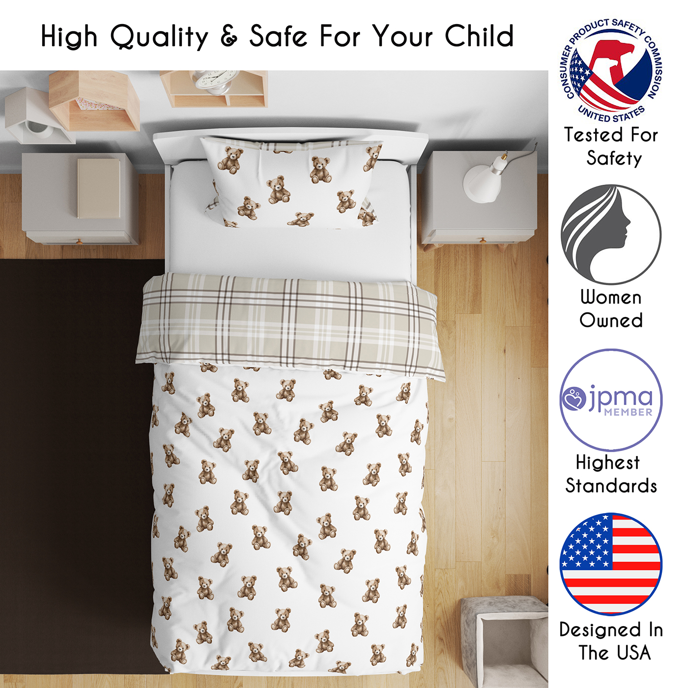 5 PIECE TODDLER BEDDING SET INCLUDES: Toddler Comforter (60in. x 48in.), Fitted Sheet (52in. x 28in. x 8in. pocket), Flat Sheet (70in. x 42in.), Sham (20in. x 26in.) and Pillowcase (20in. x 30in.). A toddler bed set including all the essentials is a great value compared to purchasing pieces separately. This bed in a bag is made of soft microfiber fabric and features a neutral color palette of brown, taupe & beige to bring your wholesome aesthetic, bohemian, cozy teddy bears themed room together.VINTAGE TEDDY BEAR THEME: This gender neutral toddler bedding set boasts a toddler bed comforter featuring an all over hand painted, woodland, classic, traditional, cozy teddy bears print and it reverses to a taupe plaid pattern. The solid white fitted sheet is paired with a solid white flat sheet & standard pillow case that are adorned with a beige plaid top cuff. The standard size pillow sham shares the same minimal teddy print & reverses to the plaid print. Machine washable. Tumble dry low.DESIGNED IN THE USA: By real parents who understand the need for comfort, practicality, and style. Sweet Jojo Designs is a small, women owned business. The mom's on our team know toddler kids bed sets are first priority for your essentials to ensure a restful night of sleep. We use top fabrics and designs to create soft bedding that's stretchy and comfortable for your toddler ready for their big bed. We've studied the latest trends in unisex toddler size bedding to bring you the finest product.SAFE & DURABLE: Sweet Jojo Designs is a proud Baby Safety Alliance member and rigorously tests products to meet or exceed CPSC safety standards. Our breathable bedding is quick to changed and designed with busy parents in mind. The high quality stitching and fabric ensure long-lasting use and will hold up wash after wash. Transitioning from a crib to a toddler bed is a big milestone in your little one's growth so give the perfect gift and celebrate with Sweet Jojo Designs toddler bedding sets.PERFECT GIFT: Toddler unisex bed sets that include bedding comforters, sheets, pillowcase & sham offers convenience and savings and should be #1 on your kids bedroom makeover essentials! Toddler bed comforter sets make a unique & thoughtful birthday gift, Christmas presents, holiday treat, sleepover care package, or Easter basket stuffers for kids & children. Sweet Jojo Designs offers a variety of matching blankets, toddler fitted sheets, window treatments and more to coordinate with your set. Item# TeddyBear-Tod