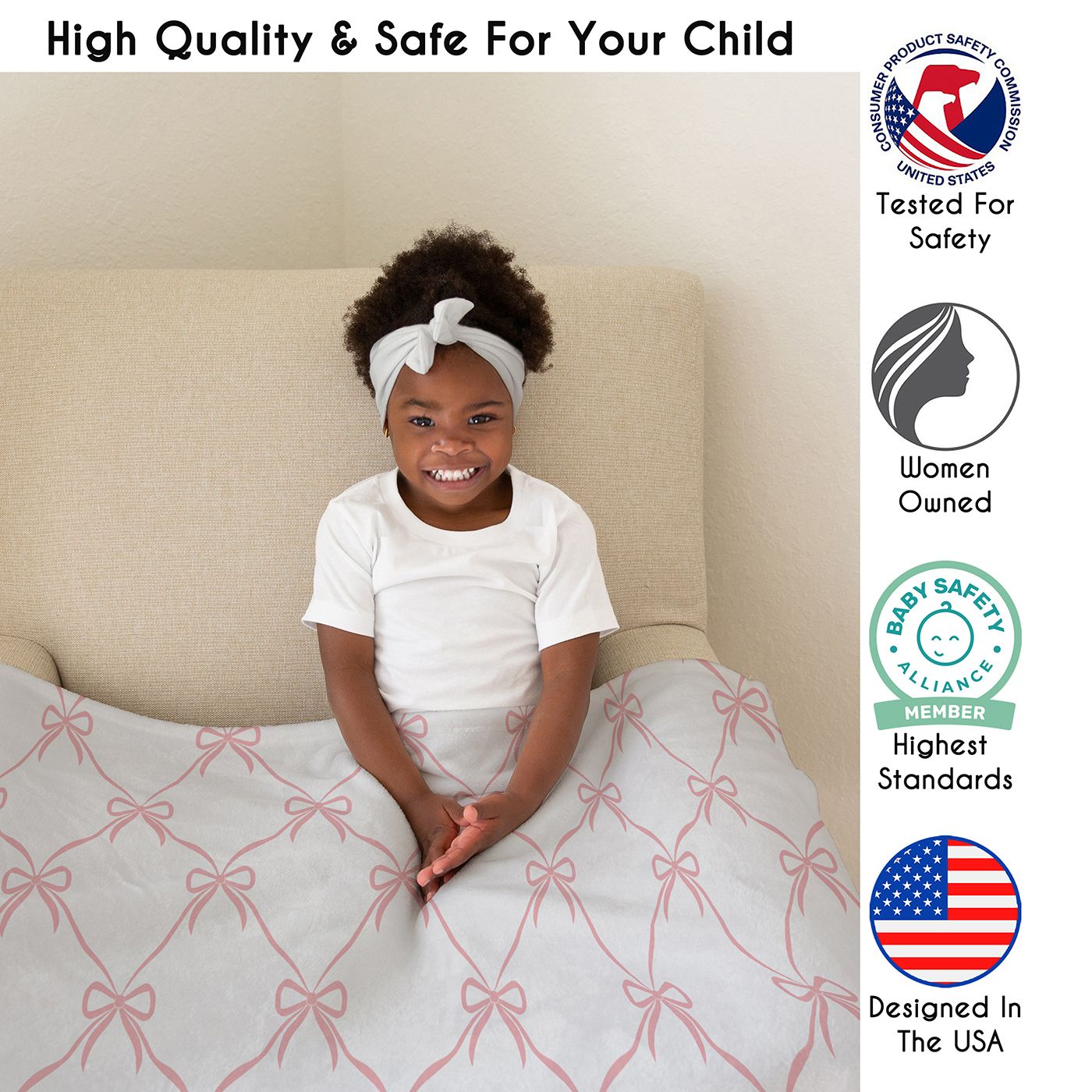 MINKY FLEECE BLANKET INCLUDES: (1) 40in. x 50in. toddler blanket for daycare. The soft throw blanket is machine washable & tumble dry low. This shabby chic toddler girl blanket features a rose blush pink and white classic sophisticated, princess ballerina, delicate, feminine coquette, vintage ballet bow print, making this plush blanket a standout addition to any child's bedroom, living room, office, guest room, or nursery decor. A kids blanket is also great to keep in the car to snuggle with.ALL DAY, EVERY DAY COMFORT: Soft toddler blankets for girls are your next children's bedroom essential offering a sense of comfort, familiarity, & reassurance while featuring your favorite designs. The cozy blanket provides warmth as a security blanket as your little one grows. Designed in the perfect size for small children, this fluffy blanket is lightweight yet gentle; ideal for naps, bedtime, or travel. Give your child a sense of solace with a breathable toddler throw blanket for kids.DESIGNED IN USA TO BE SAFE & DURABLE: As a proud Baby Safety Alliance member who rigorously tests products to meet or exceed CPSC safety standards, Sweet Jojo Designs is dedicated to creating high-quality products that blend style, comfort & functionality. Our small throw blankets are crafted with premium materials to have your favorite themes come alive and help parents design the perfect space for their little one. Trusted by families worldwide for over 20 years to bring you products you love!PERFECT GIFT: Add a lightweight blanket or a plush throw blanket to your list of must haves! Include this receiving blanket with a matching toddler bedding set on your gift registry, in a baby shower gift basket, a gender reveal present or a birthday gift as an easy way to show your appreciation & care for your loved one. Gift a minky blanket that helps promote better sleep & independence, giving toddlers a sense of comfort and reassurance during travel, bedroom transitions or new environments.MATCHING DECOR & ACCESORIES: Match your favorite Sweet Jojo Designs home decor and bedding with this fleece throw blanket or our other baby soft blanket types to coordinate perfectly & create a cohesive look as a personalized touch to your space! Complete any room in your home with our coordinating room decor such as crib bedding sets, toddler bedding sets, crib sheets, window treatment panels, throw pillows, bedding sets, hampers, wall decor, sheet sets, shower curtains, memo boards and more. Item# TodBlank-Ballet-BOW