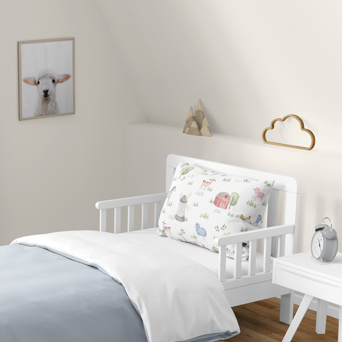 Includes: (1) Toddler Pillow with Pillow Case: 13 in. x 18 in. Please note: The height of this pillow is intentionally thin and flat for ergonomic purposes as well as keeping compact for travel. However, the pillow may arrive vacuum packed and may need to be fluffed in the dryer or by hand or opened and aired out for 24-48 hours to expand from its packaged state.95% Rayon/5% Spandex Jersey Stretch Knit Pillow cover is easy machine washable and tumble dry low. Do not iron, bleach, or dry-clean. Pillow Insert is a 100% brushed microfiber outer shell with a lofty 100% polyester fill and is also machine washable and tumble dry low.This kids toddler pillow with case features an exclusive design of a gray, green, grey, red, black and white watercolor farm silo barn farmhouse animals like horses, cows, sheep, pigs, goats, chickens and nature trees animal print.A 13x18 pillow is the perfect addition of personality and design to any room in your house. This pillow for kids can be displayed and stored on kids beds, in children’s bedrooms, day care cots, cubbies, desk chairs, or office chairs for the personal decorative touch you may want with the functionality you need. While soft and comfortable for children, they're also perfect for adults and teens to prop up a foot or arm or use between your knees while sleeping. Great for all ages!This tiny pillow is compact and portable to bring anywhere and everywhere. Order as many as you need handy to grab for preschool naps, bedtime cuddles, sleepover at grandma and grandpas, traveling, camping, car rides and more. Don’t forget about your pets! Stick them in crates, kennels, pet beds or even cat towers to give your pet the perfect place to nap. Also makes a great gift to coordinate with Sweet Jojo Designs bedding sets, sheet sets, window treatments, and storage solutions.Item# TodPillow-OnTheFarm-PRT