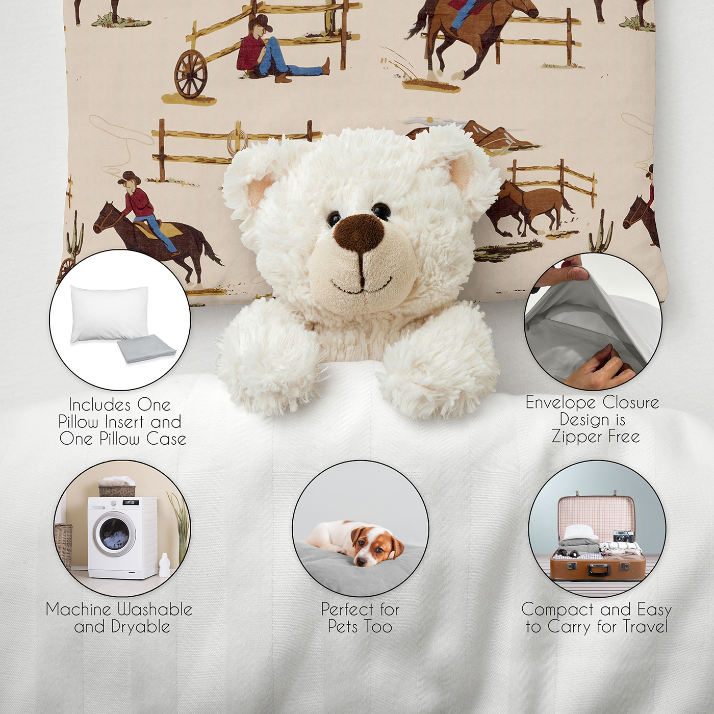 Includes: (1) Toddler Pillow with Pillow Case: 13 in. x 18 in. Please note: The height of this pillow is intentionally thin and flat for ergonomic purposes as well as keeping compact for travel. However, the pillow may arrive vacuum packed and may need to be fluffed in the dryer or by hand or opened and aired out for 24-48 hours to expand from its packaged state.95% Rayon/5% Spandex Jersey Stretch Knit Pillow cover is easy machine washable and tumble dry low. Do not iron, bleach, or dry-clean. Pillow Insert is a 100% brushed microfiber outer shell with a lofty 100% polyester fill and is also machine washable and tumble dry low.This kids toddler pillow with case features an exclusive design of a tan, chocolate brown, red white and blue western southern charm wild west horse cow country south animal cowboy print.A 13x18 pillow is the perfect addition of personality and design to any room in your house. This pillow for kids can be displayed and stored on kids beds, in children’s bedrooms, day care cots, cubbies, desk chairs, or office chairs for the personal decorative touch you may want with the functionality you need. While soft and comfortable for children, they're also perfect for adults and teens to prop up a foot or arm or use between your knees while sleeping. Great for all ages!This tiny pillow is compact and portable to bring anywhere and everywhere. Order as many as you need handy to grab for preschool naps, bedtime cuddles, sleepover at grandma and grandpas, traveling, camping, car rides and more. Don’t forget about your pets! Stick them in crates, kennels, pet beds or even cat towers to give your pet the perfect place to nap. Also makes a great gift to coordinate with Sweet Jojo Designs bedding sets, sheet sets, window treatments, and storage solutions.Item# TodPillow-WildWest