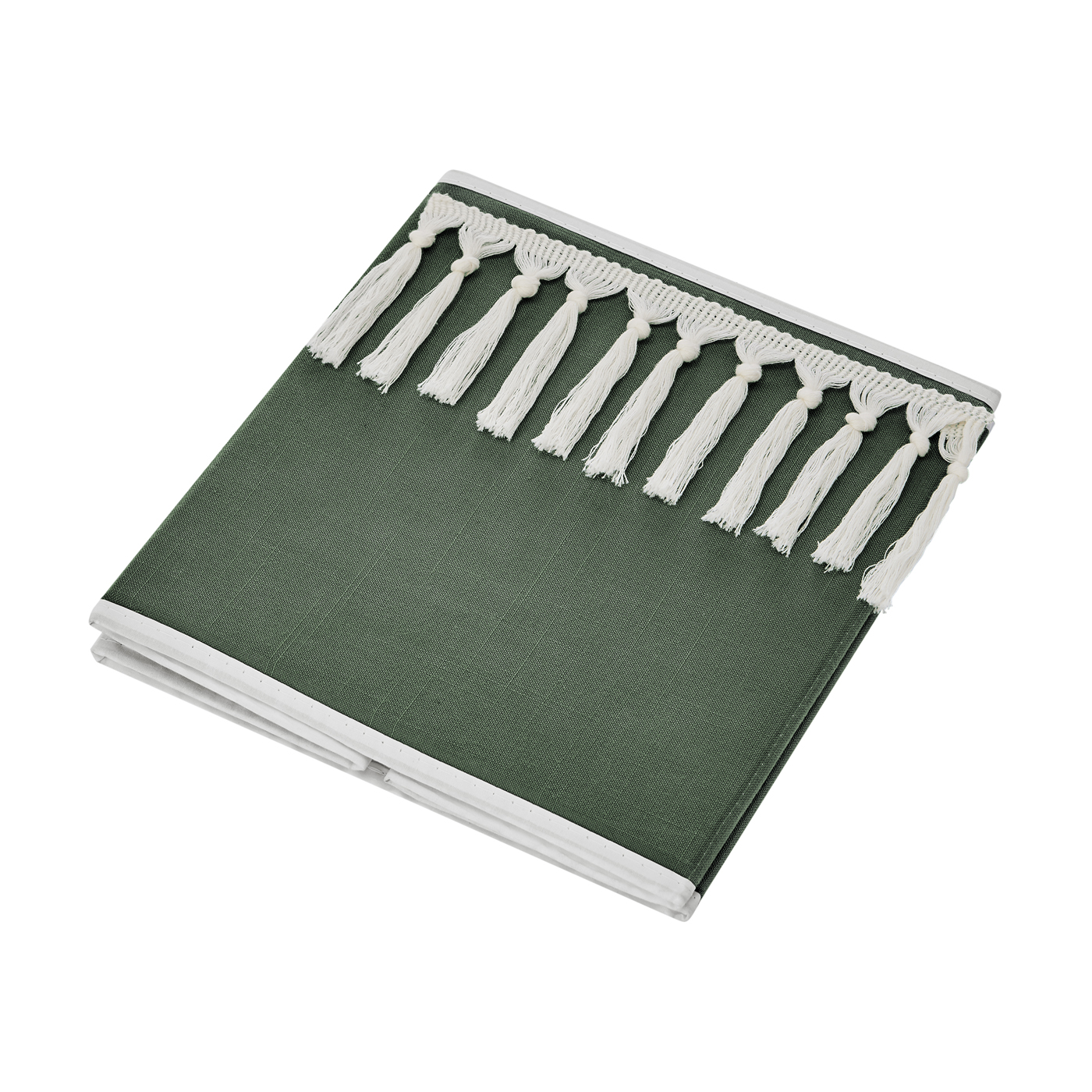 Features a solid dark green linen blend finished with a tassel macrame trim