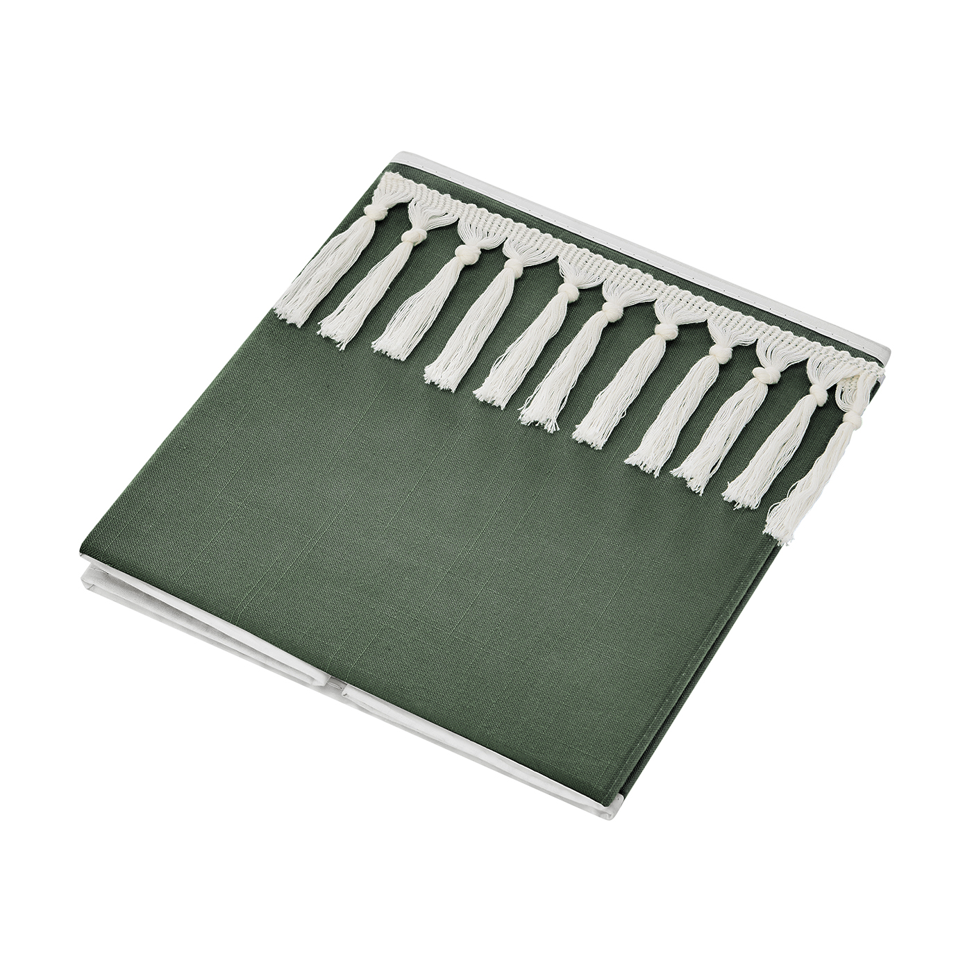 Features a solid dark sage green boho modern bohemian farmhouse southwest shabby chic designer diamond tuft with ivory off white fringe tassel print