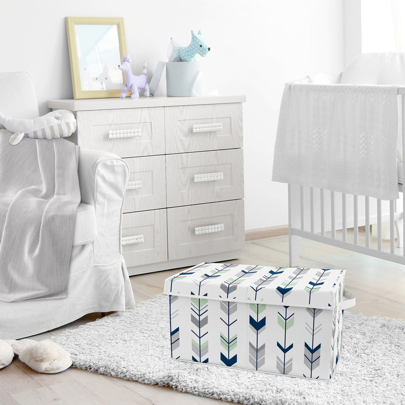 Love the fabric style? Sweet Jojo Designs also makes bedding and decor accessories in this exclusive theme.Item# ToyBin-ModArrow-GY-MT-PRT