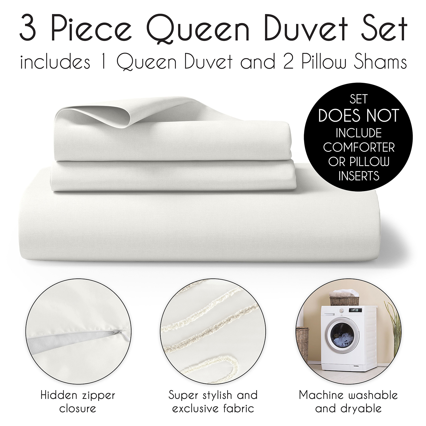 Set and Dimensions: Set and Dimensions: 1 Full / Queen Duvet Cover (90 in x 90in) and 2 Standard Shams (20in x 26in). (Does not include comforter insert)