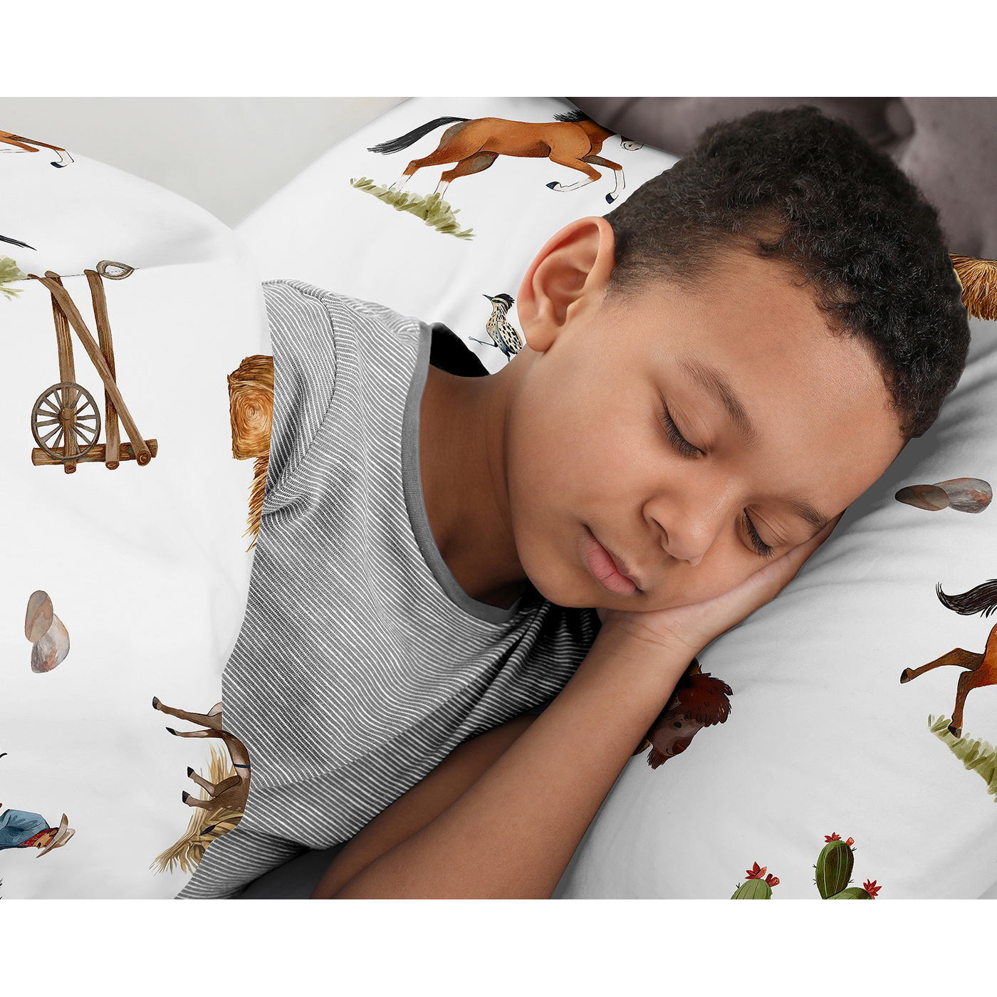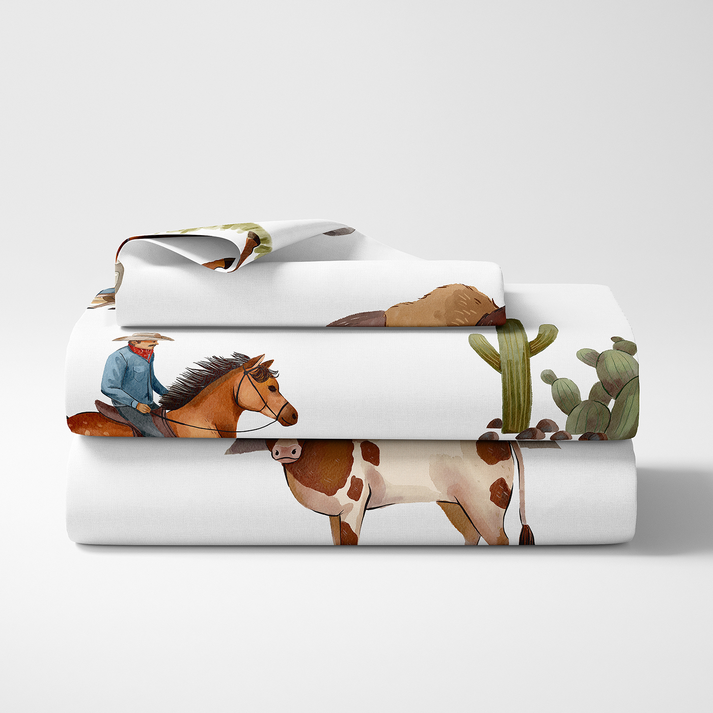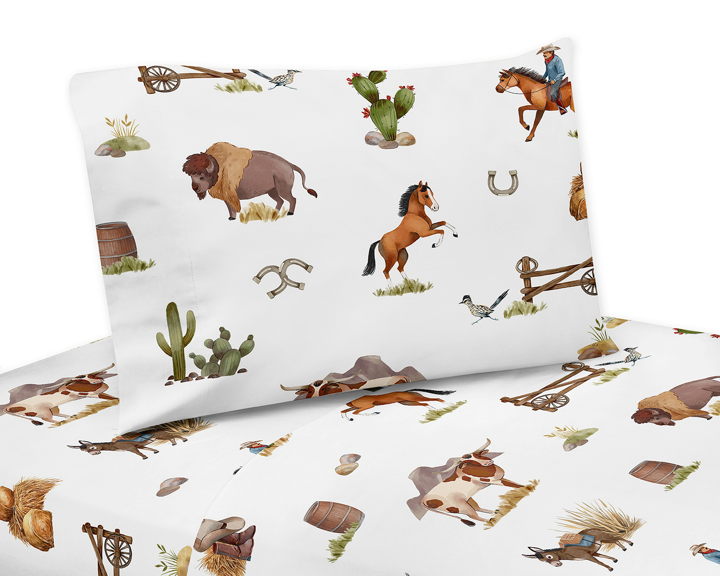 1 Flat Sheet, 1 Fitted Sheet, 1 Pillow CaseTwin Dimensions: Fitted Sheet (39in. x 75in. x 14in. Pocket), Flat Sheet (66in. x 96in.) Pillow Case (20in. x 30in.)Machine washable taupe brown blue red white and tan western cowboy wild west southern charm country south horse steer farm animal desert cactus mountains sun print brushed microfiber fabric.This design has matching accessories such as hampers, lamp shades, window treatments, wall decor, borders, wall decals, shower curtains, memo boards, pillows and pillow cases Item# TwinSheets-CountryWestern