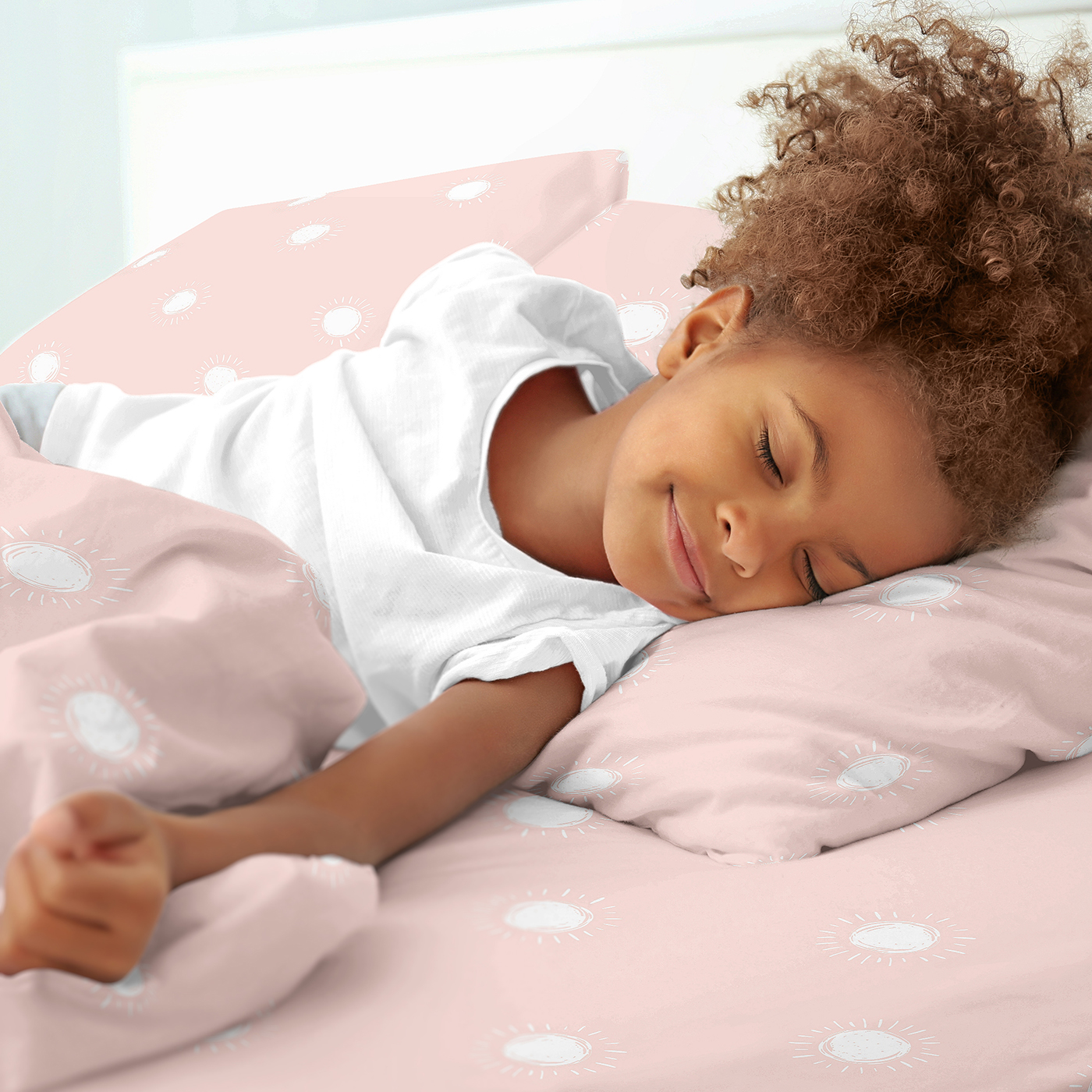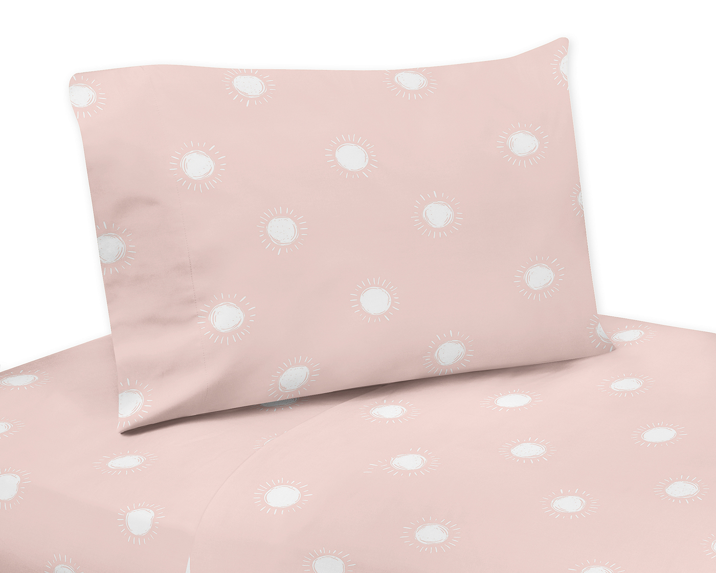 Sweet Jojo Designs Boho Sun Blush Pink and White 3pc Twin Sheet set is made to coordinate with their Twin Bedding Sets. These sheets use the light pink and white boho bohemian shabby chic celestial sky desert sunshine outdoors nature sun brushed microfiber fabric. This sheet set is machine washable for easy care.