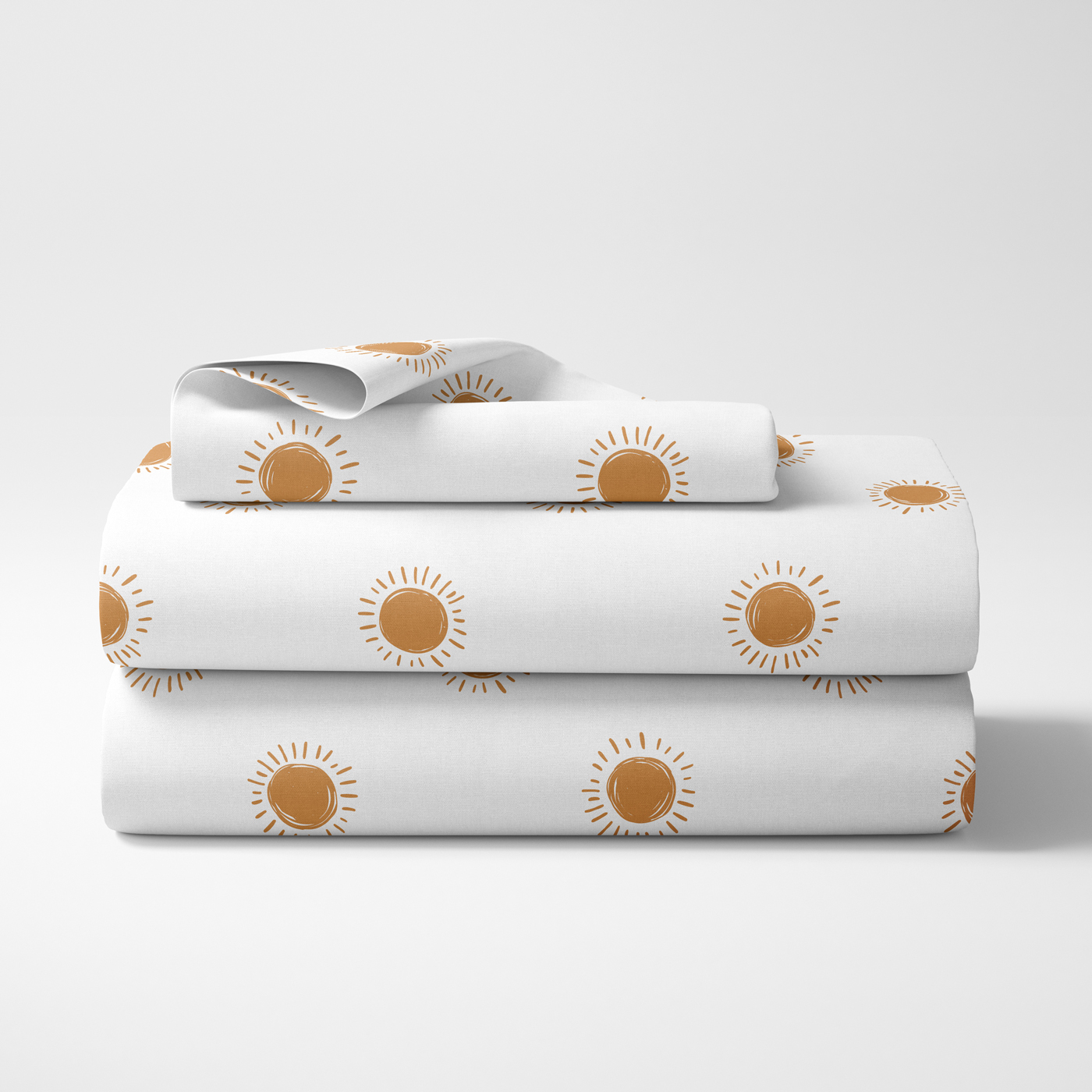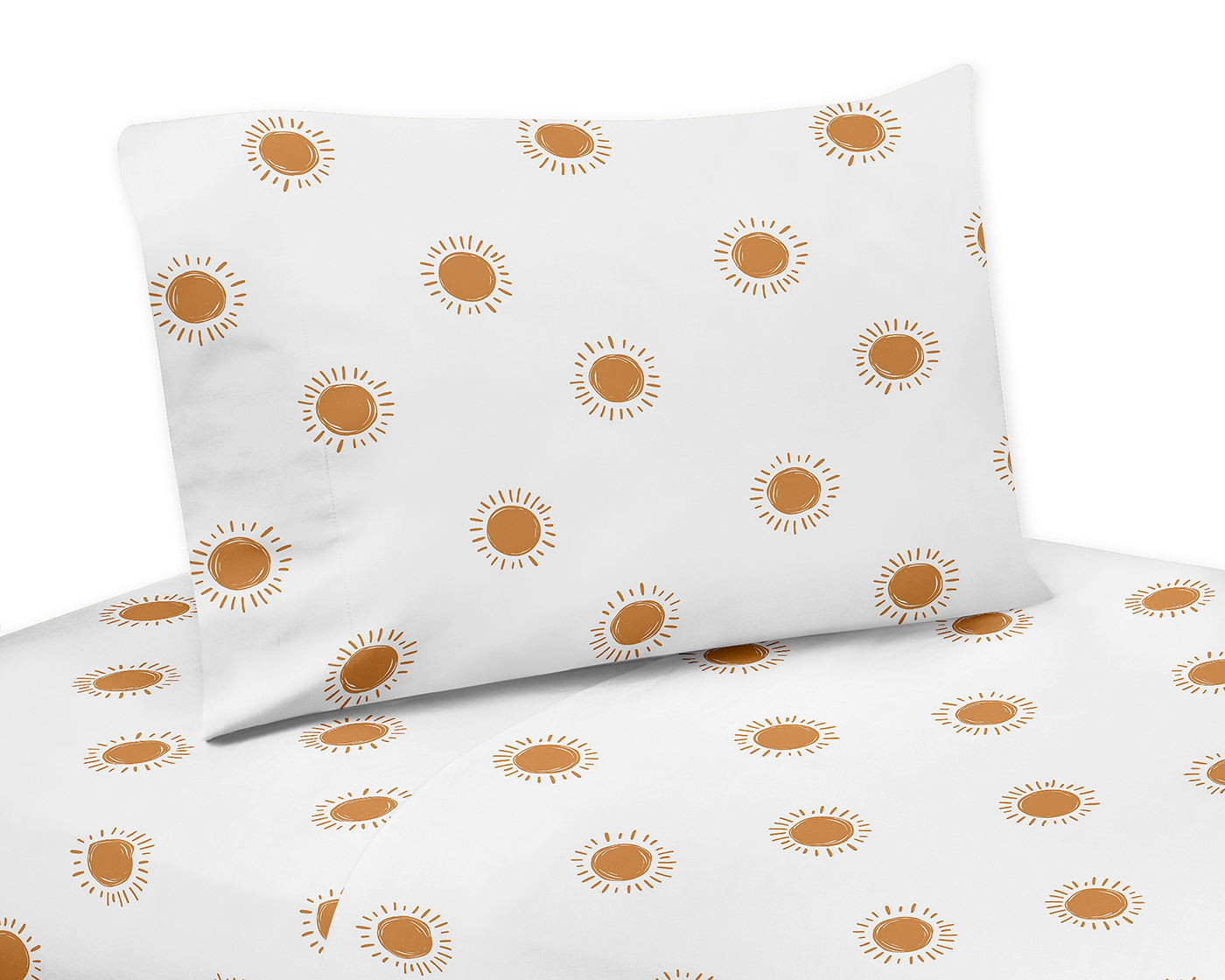 Sweet Jojo Designs White and Pumpkin Orange Boho Sun Collection 3pc Twin Sheet set is made to coordinate with their Twin Bedding Sets. These sheets use the pumpkin orange and white boho sun print brushed microfiber fabric. This sheet set is machine washable for easy care.
